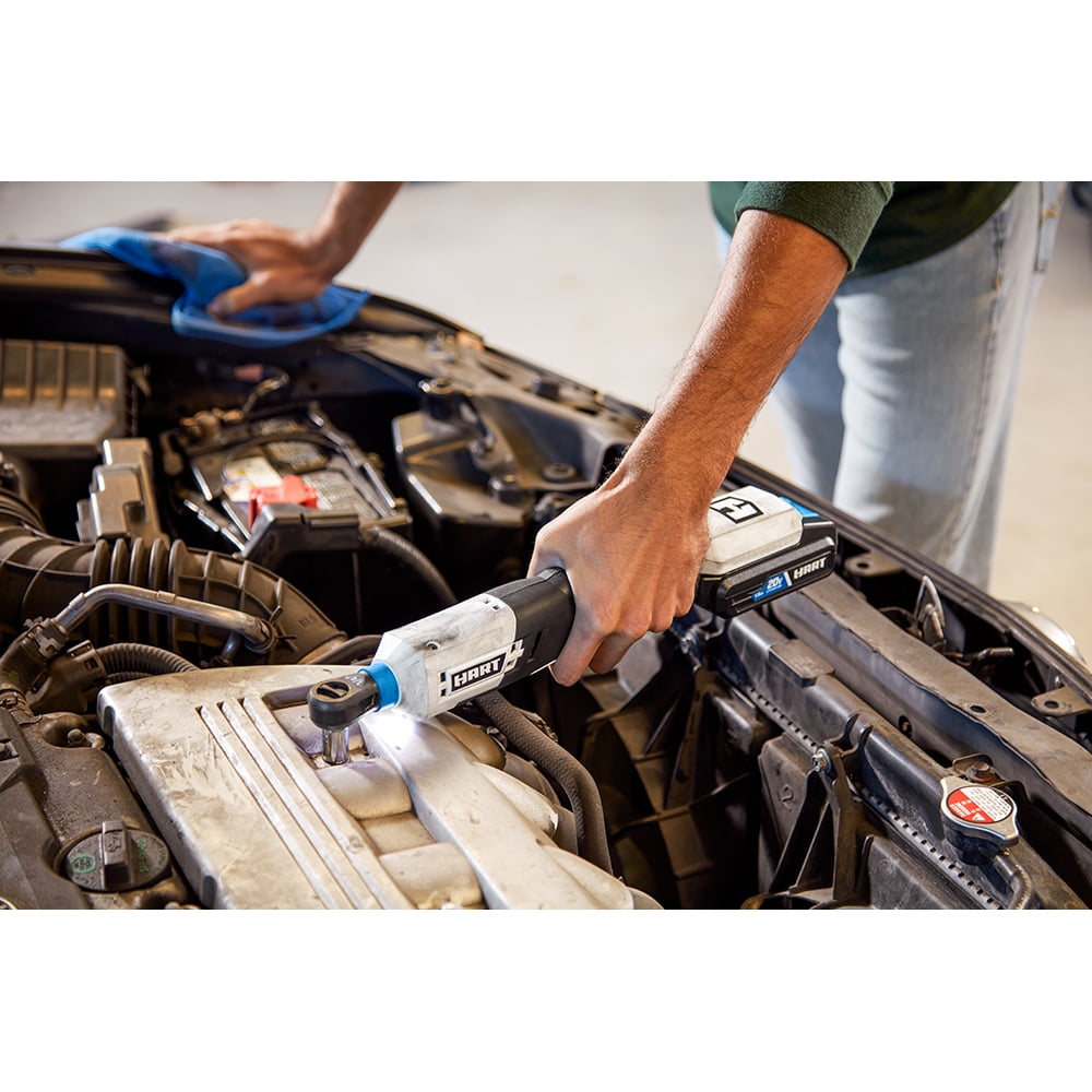 Let HART’s 20 Volt -inch Ratchet do all the work for you. We promise your hands and wrists will thank you for it. Lightweight and compact, this tool allows you to work on your vehicle or on your home without the effort it takes to operate a manual ratchet and without the risk of tripping on an air hose. The motor cranks out up to 30 ft-lbs. of torque at up to 250 RPM, making it powerful, versatile tool to have around in the garage or workshop. It also features a rubber overmold handle for increased comfort. A 2-finger variable speed trigger allows for better user control and a ” anvil allows for use in a variety of applications. Color: White, Black, Blue. Kit includes: ” Ratchet and Operator’s Manuals.