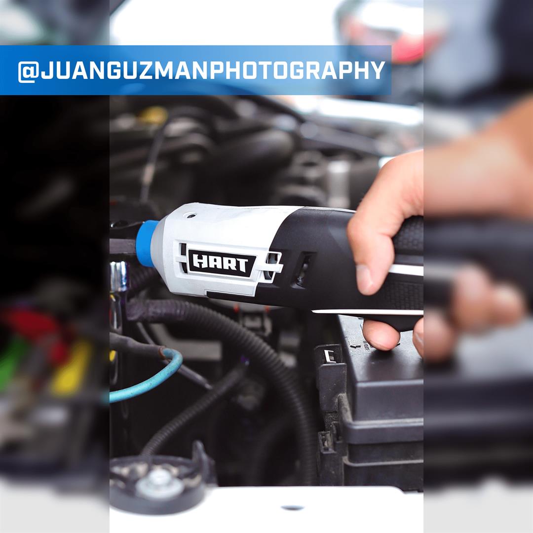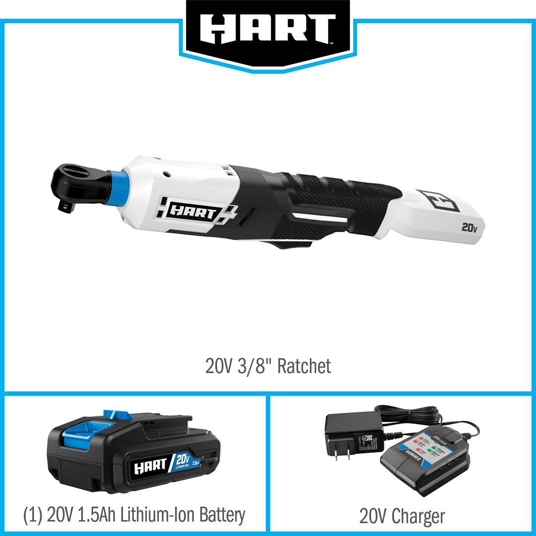 Instead of swinging a manual ratchet, let HARTs 20V 3/8 Ratchet Kit do the work for you. This ratchet cranks out up to 35 ft./lbs. of torque at up to 230 RPM, making tightening and loosening bolts and nuts a breeze. You never need to worry about this ratchet handles swing clearance, plus it includes a 2-finger variable speed trigger for better control. When working on the inside of a car engine, old or new, the built-in work light helps you see what youre doing. Whats more, this tool is cordless, which means you can move around freely without tripping over an air hose. The 3/8 anvil allows the tool to work with different sockets and attachments to suit a wide range of applications. The kit includes: (1) 20V 1.5Ah Battery, and (1) 20V charger. The HART 20V battery included in this kit is compatible with all other HART 20V tools!