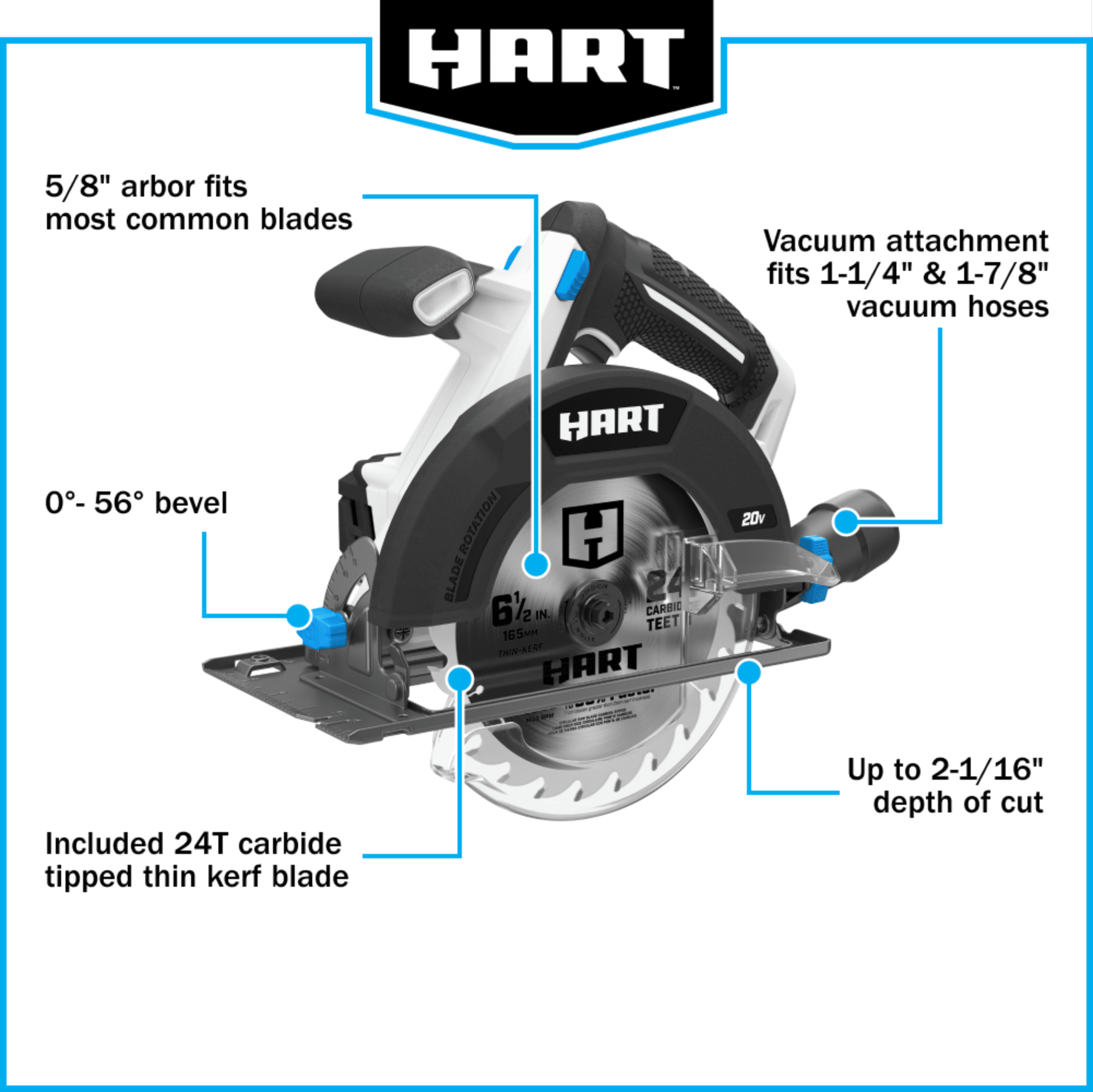 The HART 20V 6 -inch Circular Saw is the perfect addition to any DIYers toolbox. This saw features a powerful motor delivering 4700 RPM to make even the most demanding cuts with ease. With the included 24-Tooth, carbide-tipped, thin-kerf blade, this saw makes cuts quickly and easily through a variety of materials. The 0-50-degree bevel allows for greater cut capacity for more angled cut options and a 5/8-inch arbor allows for use with most common blades. This saw also features a vacuum attachment that fits 1 1/4-inch and 1 7/8-inch vacuum hoses to make clean-up a breeze. The HART 20V Circular Saw operates on the same HART 20V Lithium-ion battery (Not Included) as all other tools in the HART 20V lineup to provided fade-free power to get you through any project you decide to tackle.