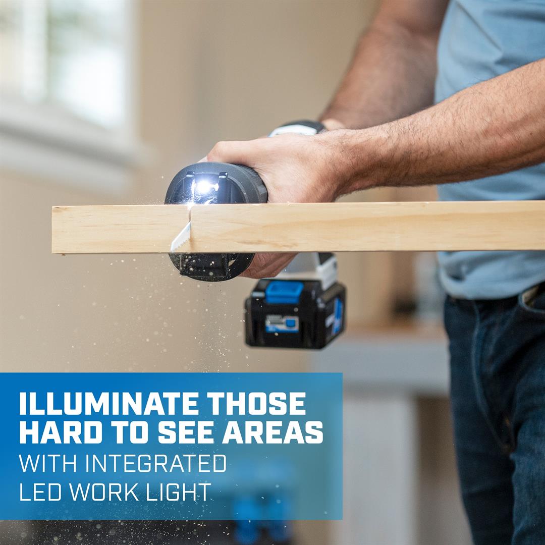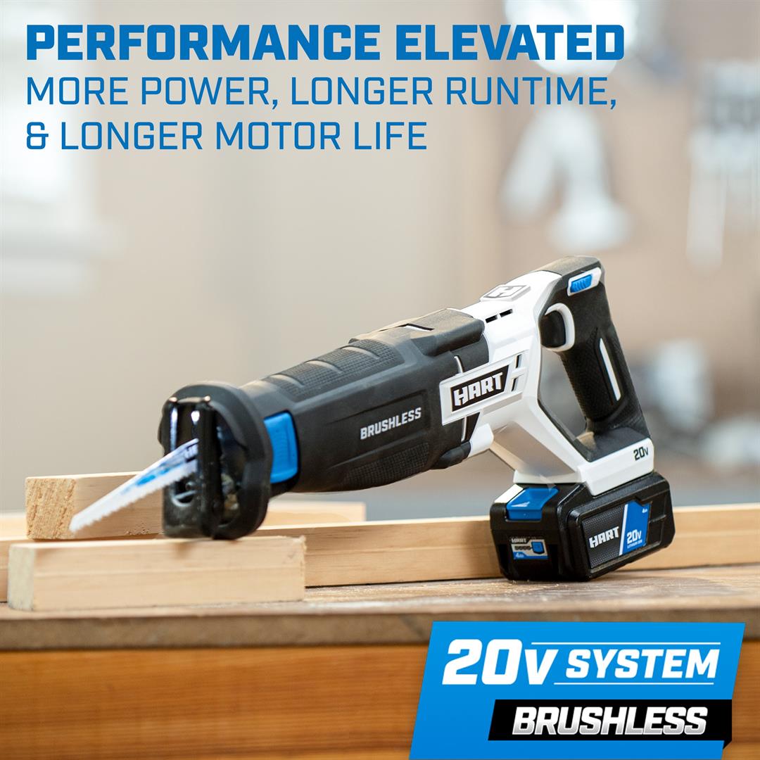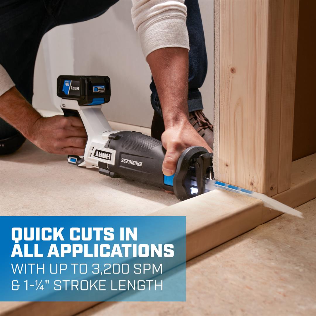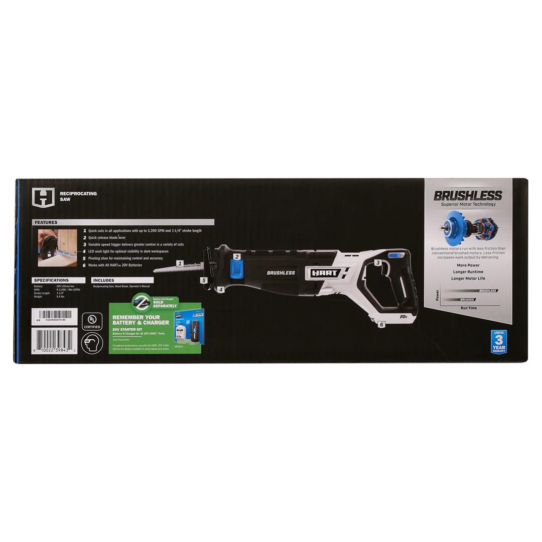 HARTs 20V Brushless Reciprocating Saw is your do-everything kind of saw. Youll be able to cut through wood, metal, and PVC pipes without having to think twice. In fact, this brushless reciprocating saw boasts a 70% faster cutting speed** with a 1-1/4 stroke lengthand on average, youll get 65% more cuts per charge** (**Compared to the HPRS01 using BPH003). With superior brushless motor technology, youll experience more power, longer runtime, and longer motor life than its brushed counterparts. Choosing the right reciprocating saw blade for the job is also essential. When it comes to changing blades, the quick-release blade lever makes the process convenient. The variable speed trigger provides greater control in a variety of cuts, and the on-board LED work light allows you to work in dark spaces. For maximum control and accuracy, the adjustable pivoting shoe allows the blade to be positioned at a range of angles relative to the workpiece. The HART 20-Volt Brushless Reciprocating Saw includes (1) 20V Brushless Reciprocating Saw, (1) Wood Blade, and (1) Operators Manual.