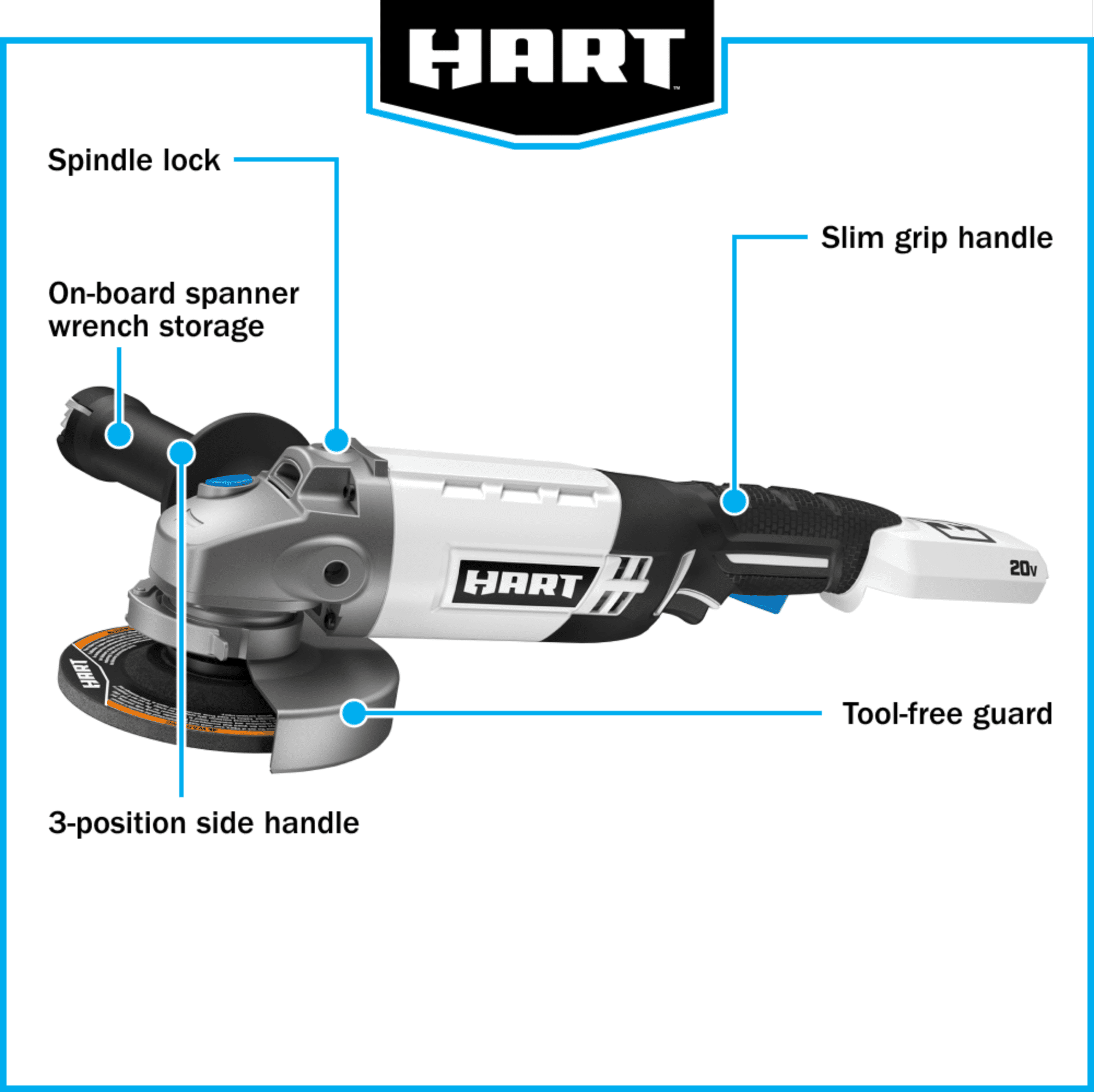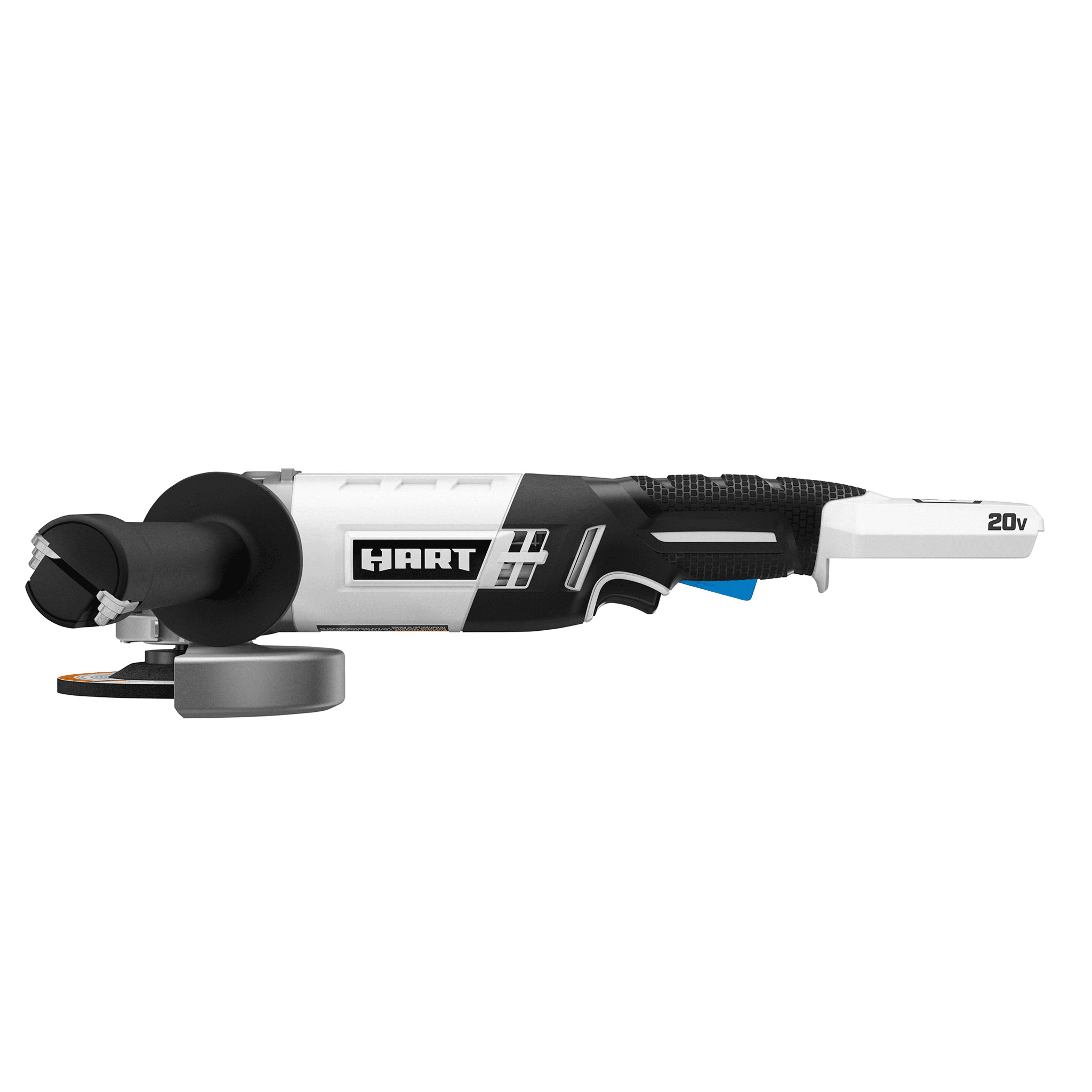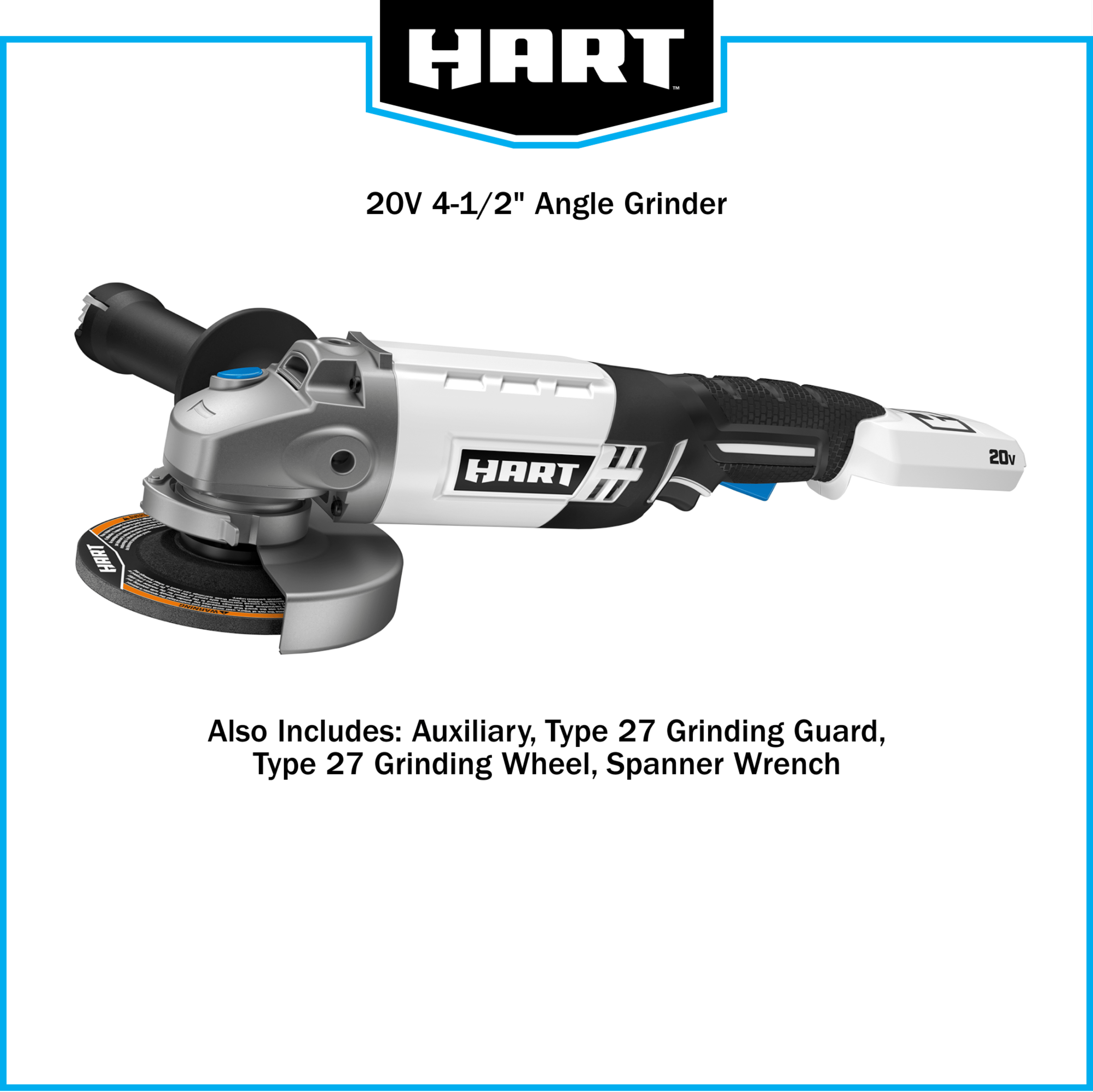 The HART 20V 4-1/2-inch Angle Grinder is equipped with a high-performance motor delivering up to 6,500 RPM for applications including sharpening mower blades, removing excess rust from metal surfaces, and much more. The 3-position auxiliary handle provides added comfort and control for use while ensuring youve got a secure grip. The spindle lock ensures quick and easy wheel changes to get you through your projects as quickly and safely as possible. For added safety, this grinder features a two-finger trigger to activate the tool ensuring only deliberate activation. The HART 20-Volt Grinder operates on any 20-Volt HART Lithium-Ion battery (Not Included), allowing you to expand your tool collection without having to buy more batteries or chargers than you need.