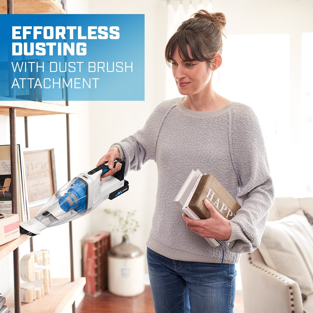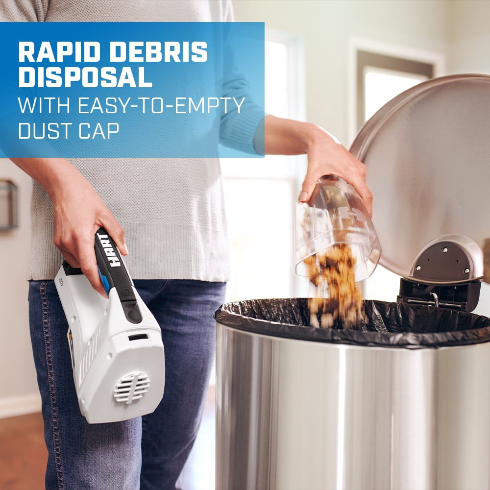 Powerful suction makes it easy to suck out crumbs between cushions Compact design is easy to maneuver Dual filter design for longer-lasting performance Wide nozzle for large debris pickup Easy-to-empty dust cup Lock-on switch for extended runtime The included crevice tool makes cleaning tight spots easier Rubber over-mold grip for added comfort Set includes: Cordless Hand Vacuum, crevice tool, dust brush, wall mount and owner’s manuals One battery powers all HART 20V tools