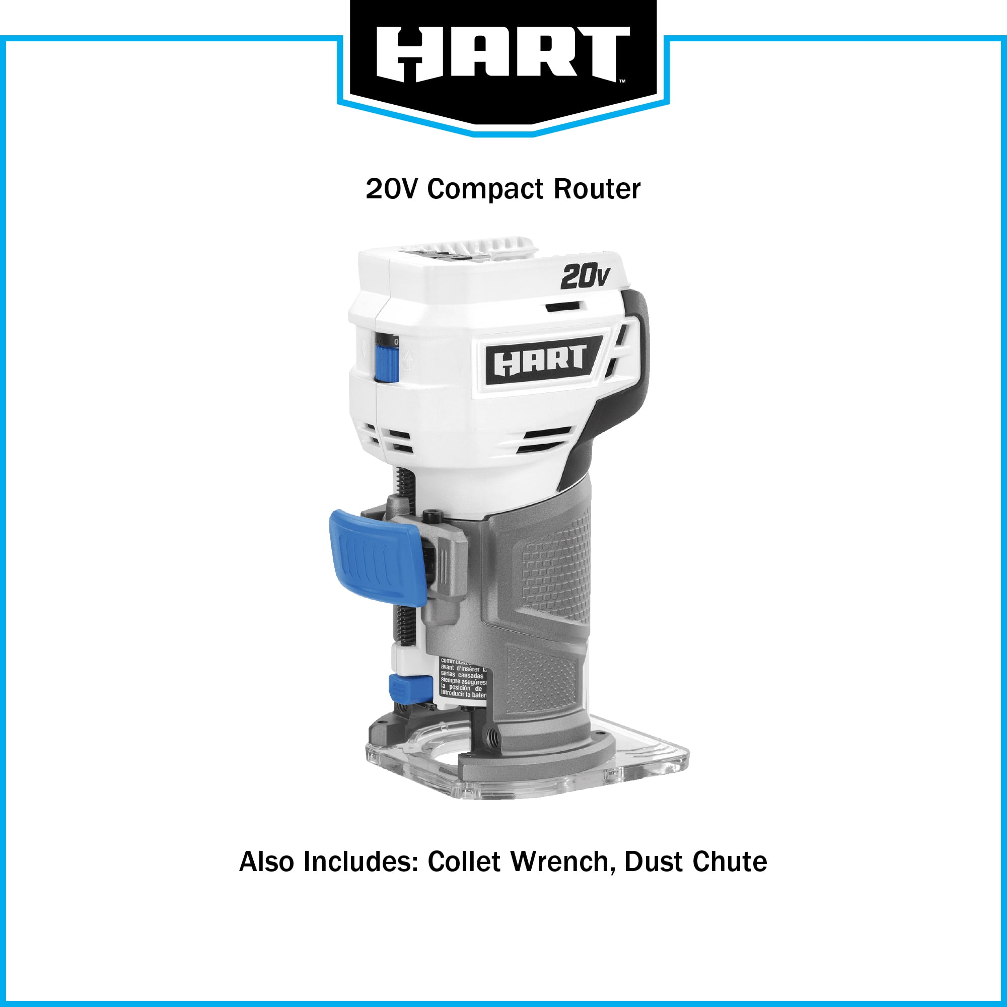Many woodworkers consider the router to be the single most versatile power tool in their arsenal. Its convenient and portable size makes the HART 20V Compact Router ideal for a wide range of cutting, trimming, and shaping tasks on wood, plastic, metal, and laminates. Not only can it rout out a hole or groove, but it can also produce finished edges, cutaways, curved contours, and precise holes. With a robust motor (no load speed: 29,000 RPM), youll enjoy fast and powerful trimming to get the job done. It also has a macro/micro-adjustment dial for increased precision. The quick-release lever for easy depth adjustment and base removal makes this router easy to use. LEDs also illuminate work surfaces for enhanced cutting visibility, ensuring your cuts are always precise. And the die-cast base provides enhanced durability. New condition.
