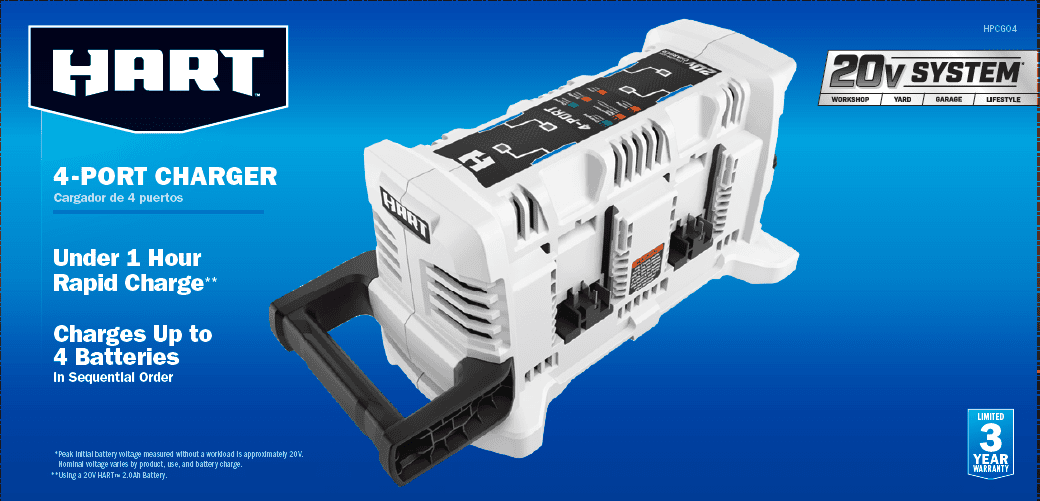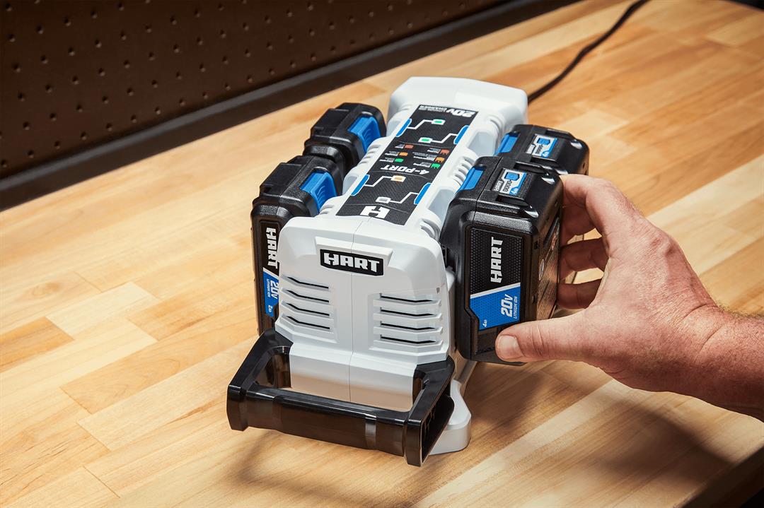 The HART 4-Port Charger is the perfect tool for the DIYer that has everything HART! This charger provides so much convenience to anyone frequently using HART tools by allowing the user to always have a battery charged and ready for when they need it most! This charger can keep four HART 20V Lithium Ion batteries charged for as long as the charger is plugged in. The integrated mounting hooks allow for mounting in the most convenient spot in your home or garage. With this charger you can sequentially charge up to 4 HART 20V batteries so youre always prepared for whatever job comes up! The LED indicators let you know which batteries are charged and which ones are still charging. With this 4-port charger you can charge a 20V 2Ah battery in under 1 hour. This charger works with ALL HART 20V batteries regardless of Ah so its perfect for the collector that has everything HART.