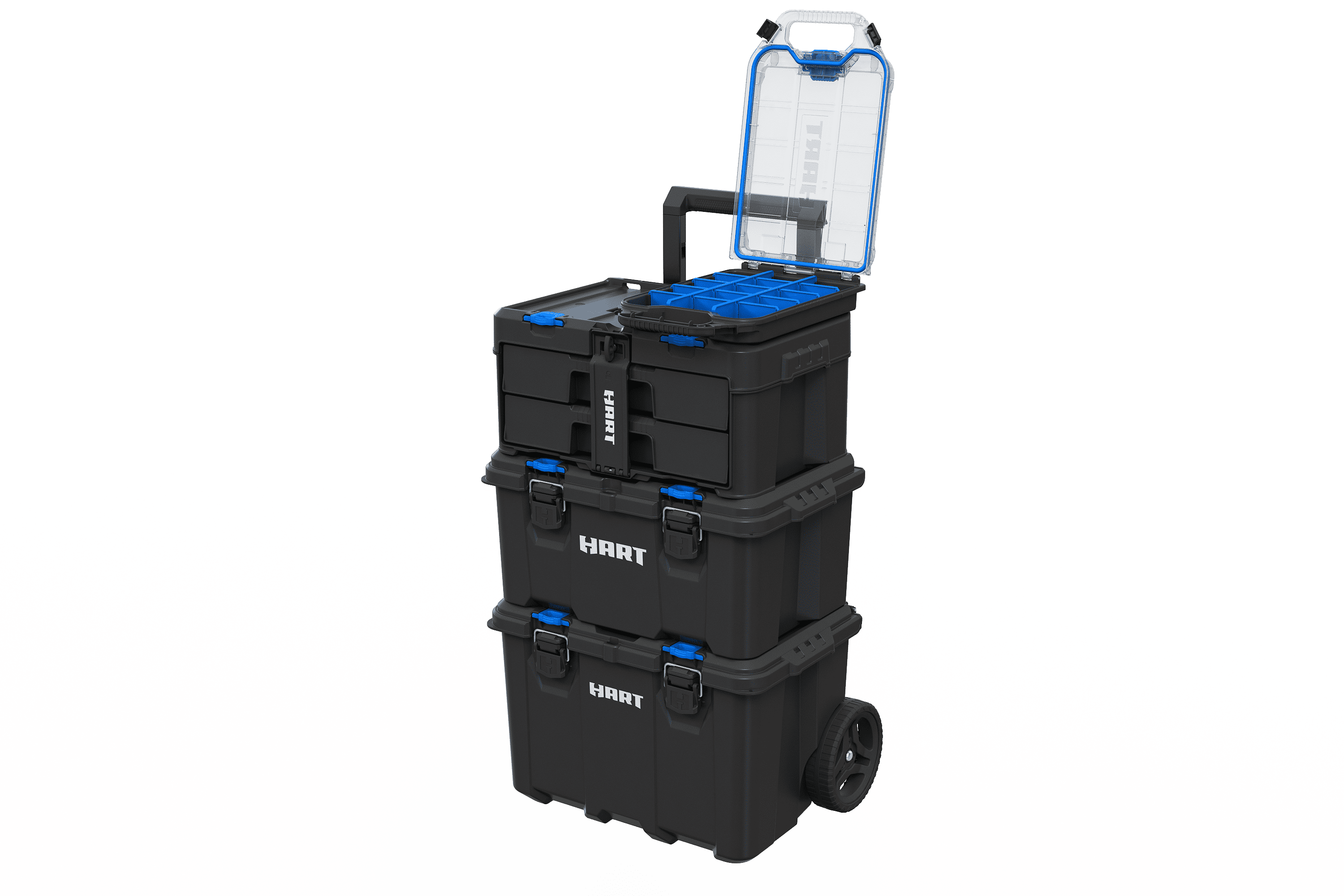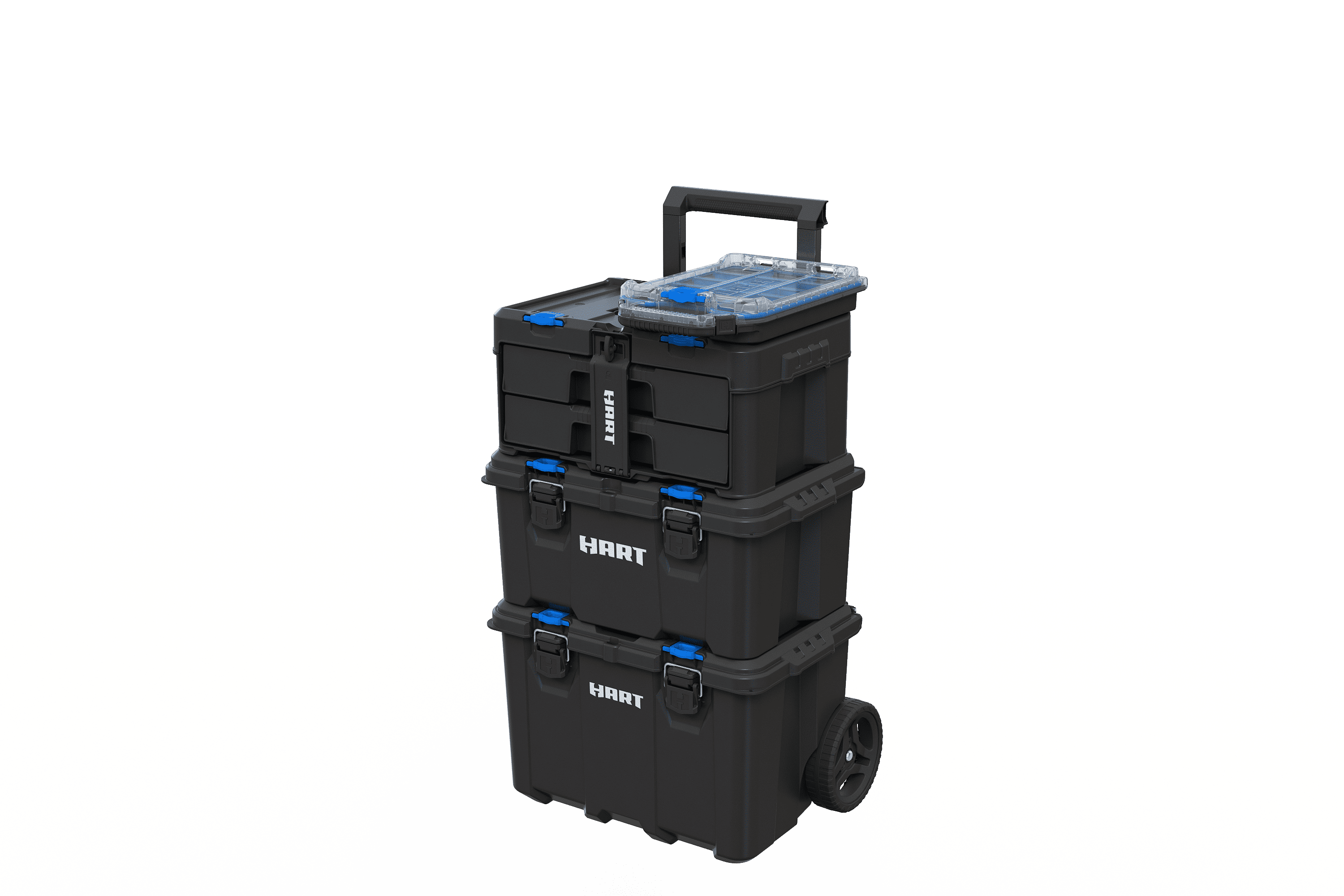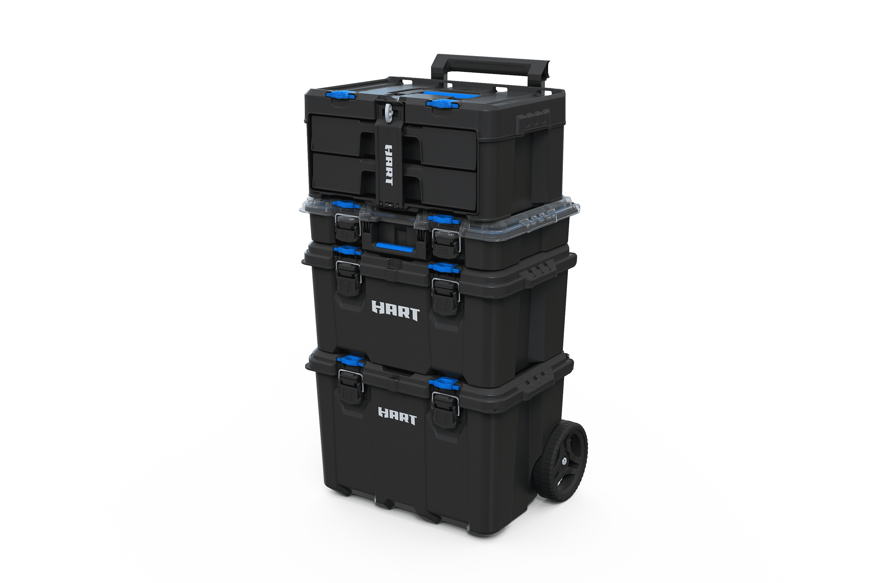 This handy HART STACK 2-Drawer stacks on the HART STACK system modular storage unit and offers a practical storage solution for your hand tools, power tools, and all types of hobbies or home DIY use. It is perfect for keeping your important stuff organized and accessible at the same time. Featuring two drawers that pull out fully, you can put your hands on all your items at a snap. With customizable compartments, you can use this drawer unit to store smaller objects like screwdrivers, wrenches, power tool accessories, screws, fasteners, nuts, bolts, even as well as slightly larger craft materials and small-sized tools. The choice is yours! A drawer lock bar means youll never have to worry about drawers slipping out when youre on the move (lock not included). Made from sturdy, long-lasting plastics this light weight drawer unit is built for frequent use. Youll be pleased to know the HART SYSTEM 2-Drawer Unit is compatible with the HART STACK modular tool box storage system, adding another great accessory to your collection.
