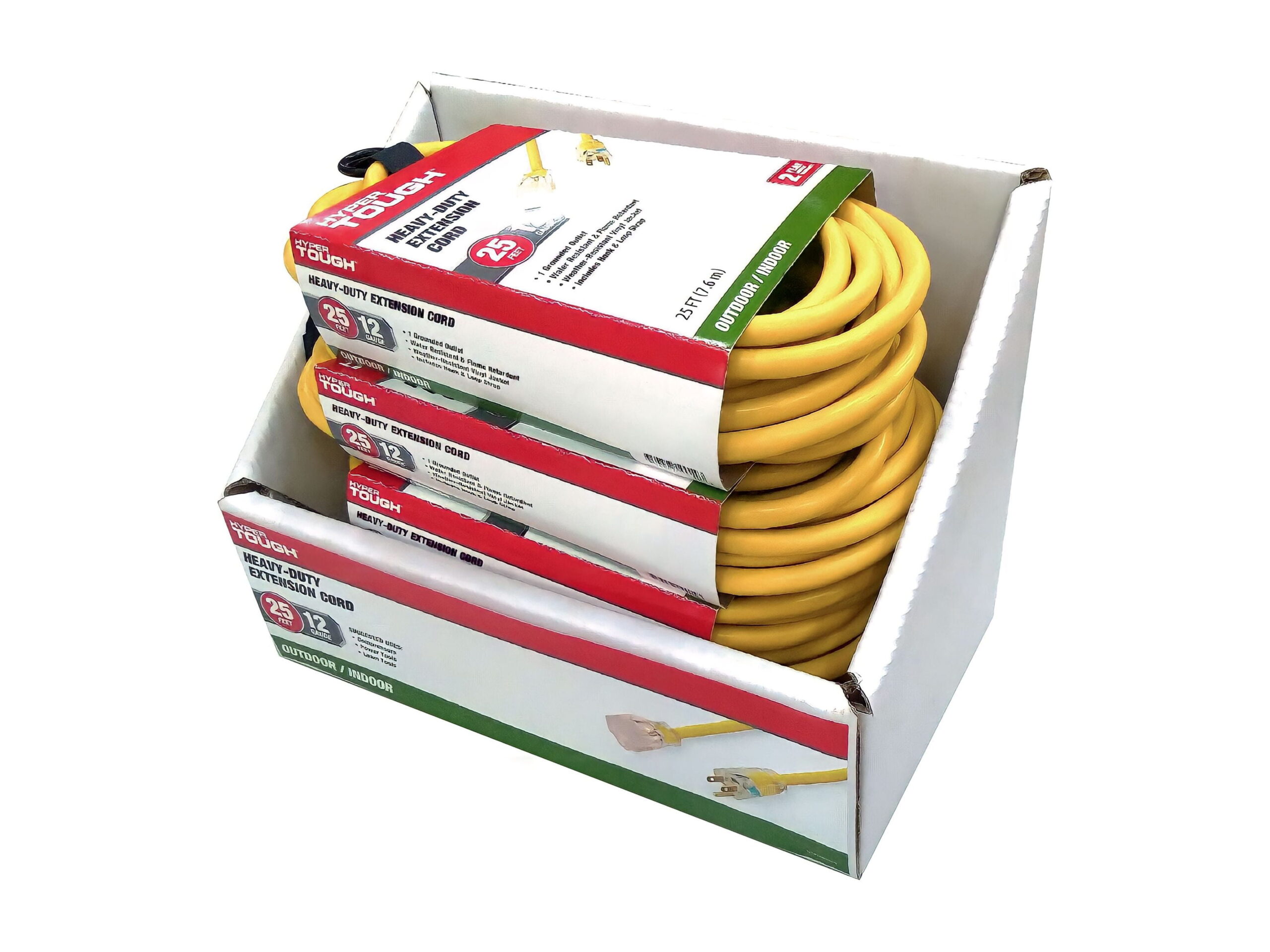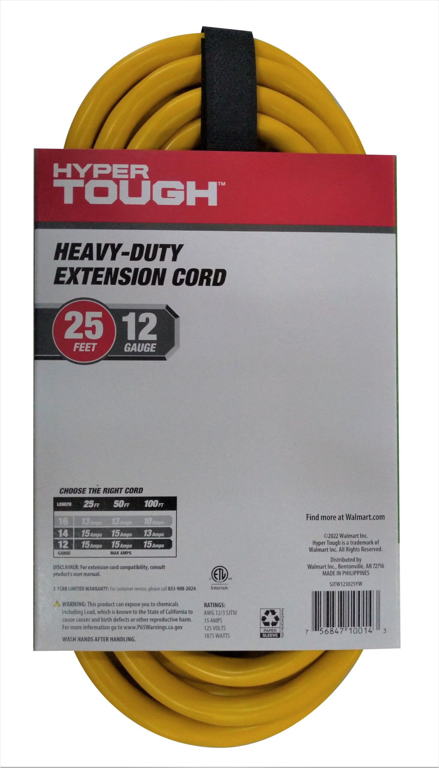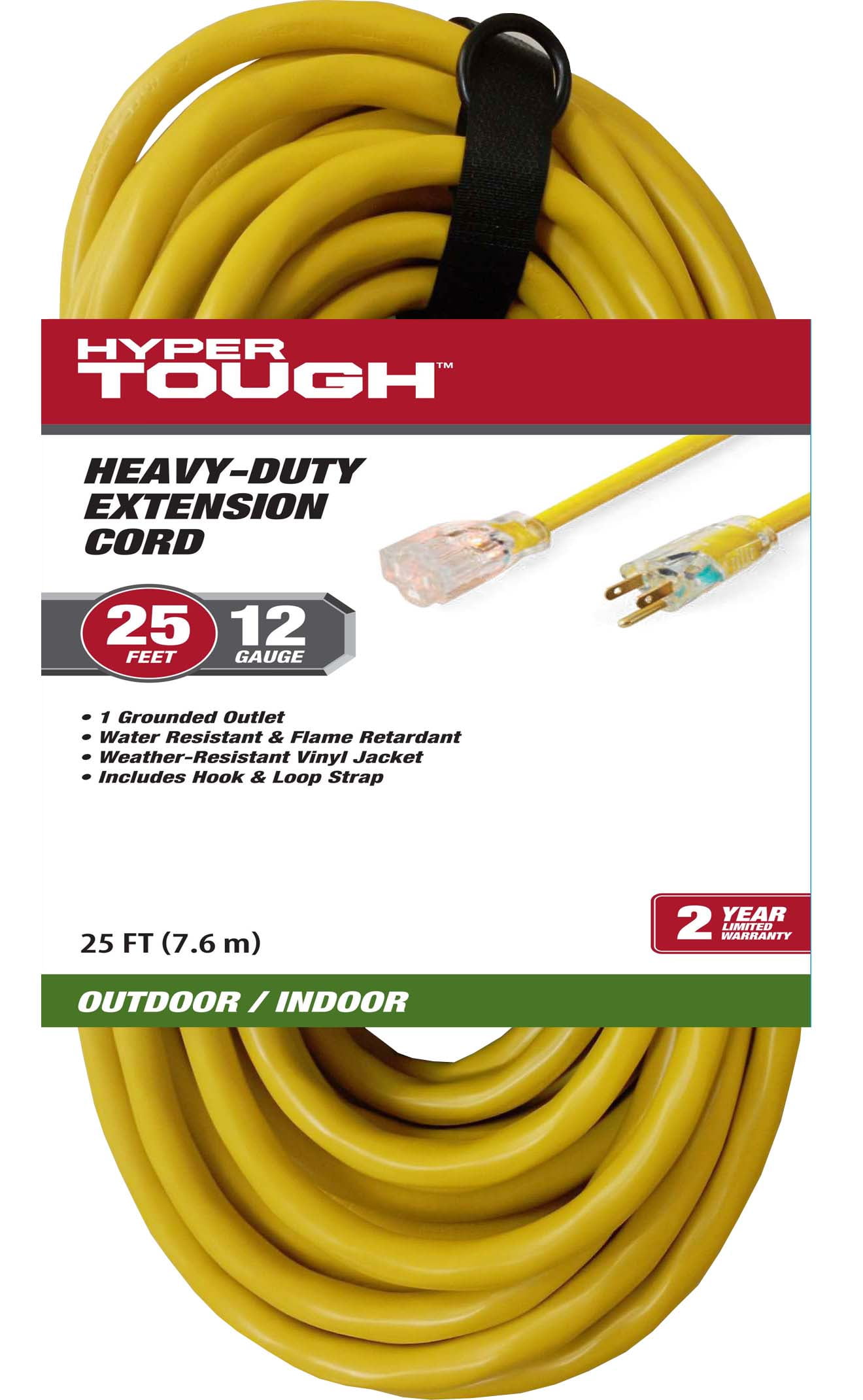 This Hyper Tough Heavy-Duty Extension Cord is ideal to use when working on an industrial job site. With one grounded outlet, this 12-gauge extension cord features lighted end to show when the power is on. This extension cord is water resistant, flame retardant, and has a weather-resistant vinyl jacket for use both indoors and outdoors. This heavy-duty 25-foot extension cord can handle up to 15 amps, perfect for any of your construction needs. This extension cord comes with a visible yellow color that is easily recognizable while in use. This feature will enhance your safety by avoiding possible tripping over the cord or running over with your compressors, power and lawn tools. This also comes with a strap securely attached to wire so you can coil back easily and is also equipped with a ring that allows you to hang the cord in your tool shop to avoid accidental damage. Be sure to check out the entire Hyper Tough line for all of your home improvement or construction needs. Bring the electricity to your work site with the Hyper Tough Heavy-Duty Extension Cord.