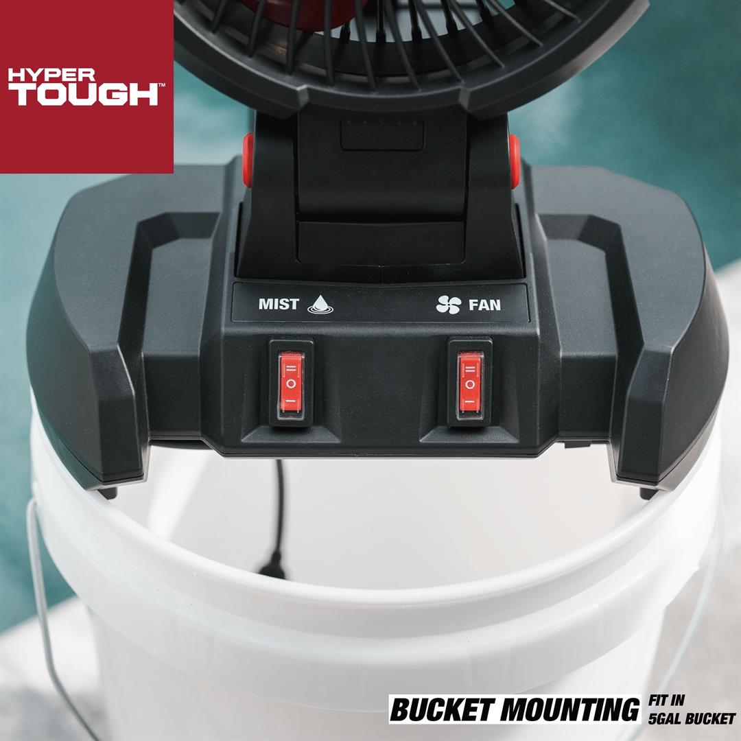 Hyper Tough 7.5 In. Cordless Misting Fan Kit, with 2.0Ah Lithium-Ion Battery Pack and Charger Max Air Volume: 600 CFM 60 Pivoting Head Base Rails Fit Most 5-Gal Buckets(Bucket Not Included) Includes: 1pc misting fan, 1pc 2.0Ah battery pack, 1pc standard charger Model Number: C0124 For product replacement parts contact customer service at 1- (833) 908-2024 Sunday Saturday, 7:00 a.m. 9:00 p.m. CT.