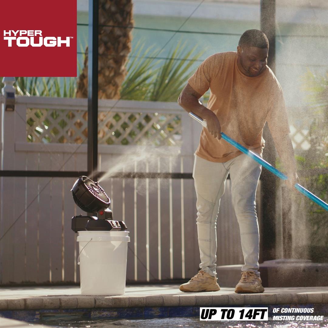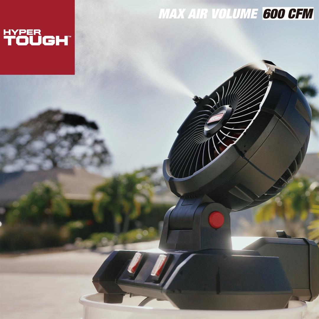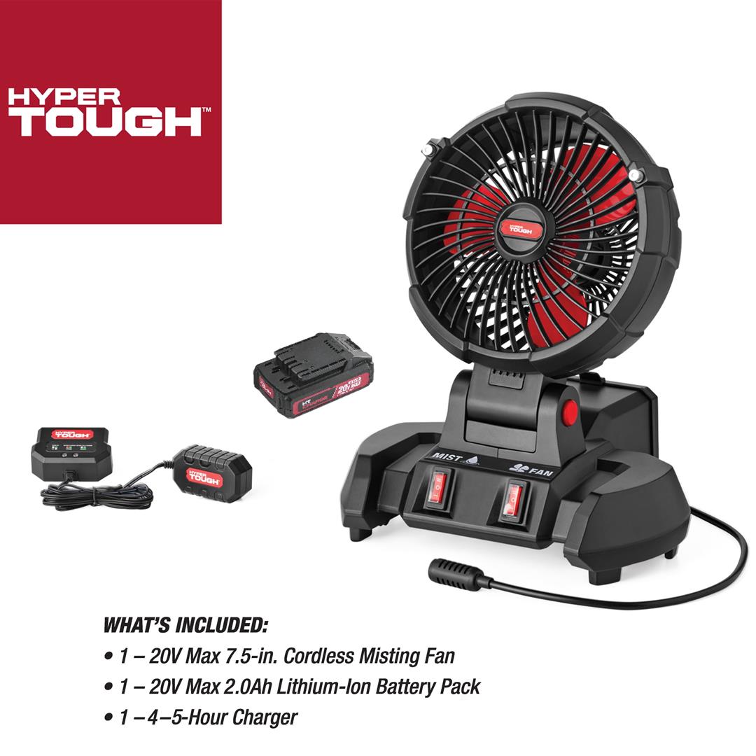 The Hyper Tough 20V Misting Fan is an upgrated item. This fan will help you beat the heat anywhere you go. It has 2.0Ah Lithium-ion battery pack. Tilt the adjustable fan enclosure forward or backward to your desired angle. The fan can pivot up to 15 forward up to 45 backward. Whether youre barbecuing outdoors, tailgating, or DIY in your workshop, experience long lasting cooling power with the Hyper Tough 20V misting fan.