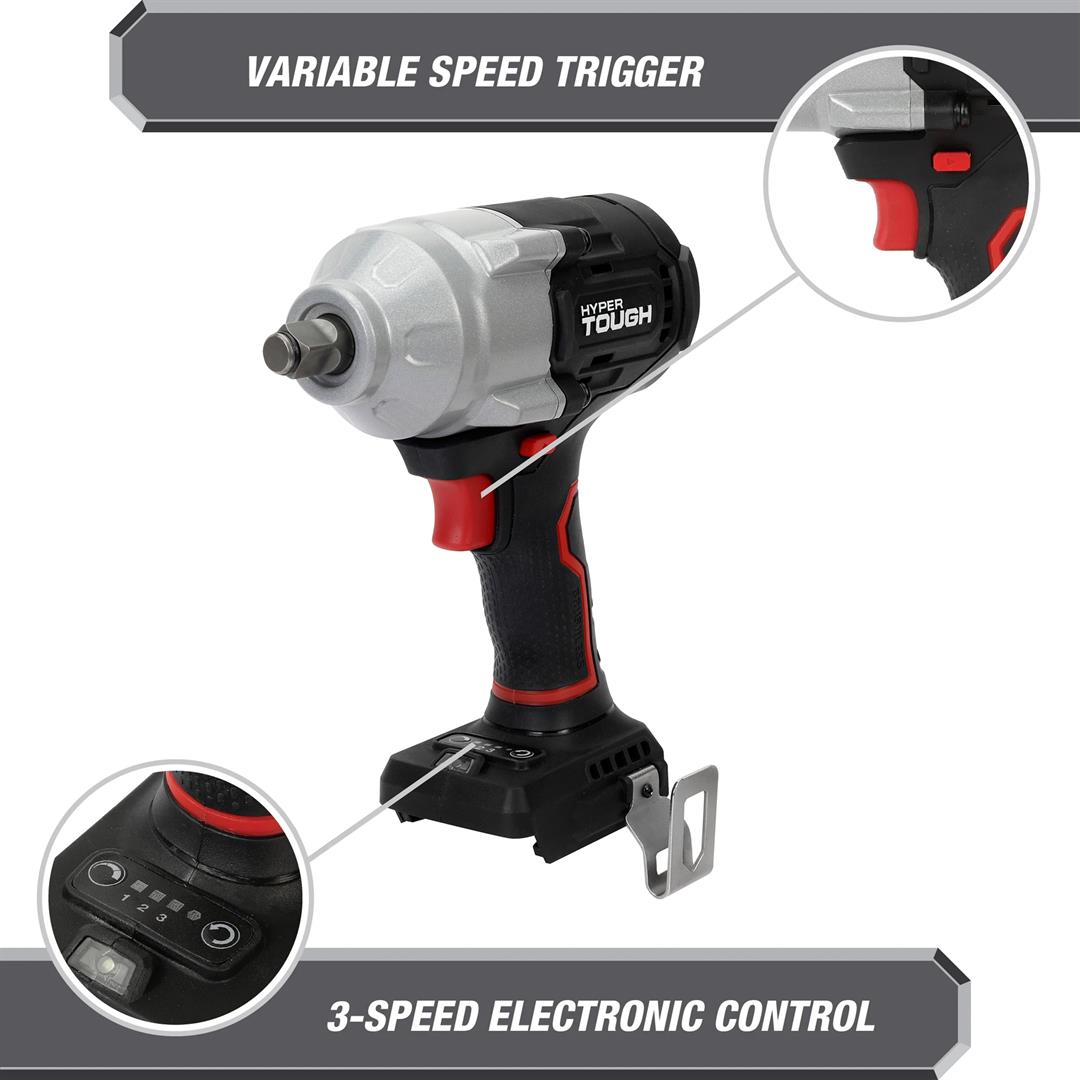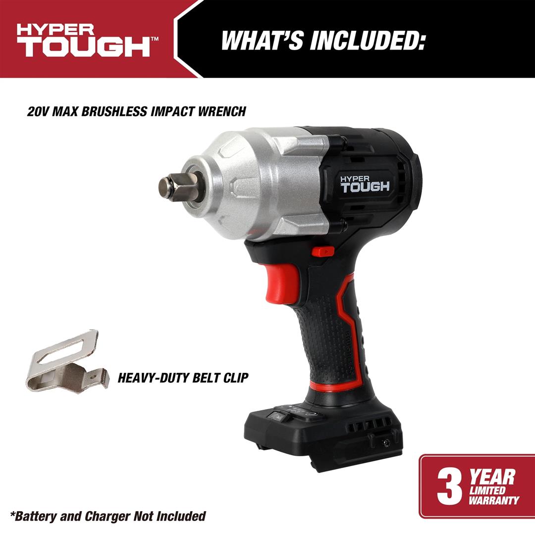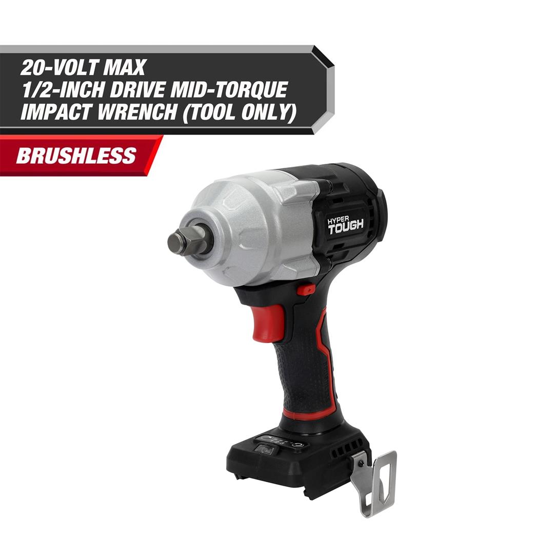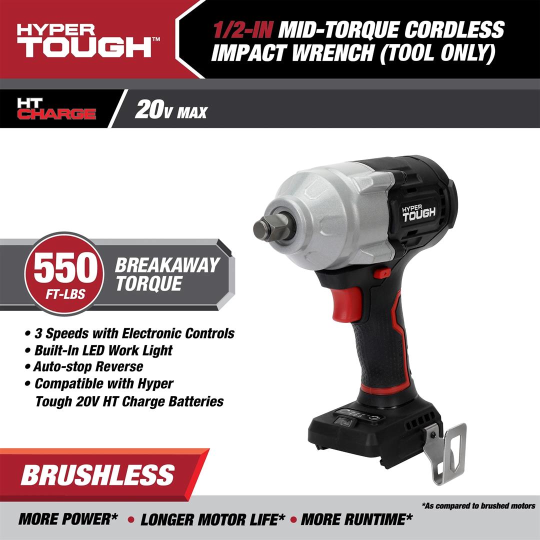Hyper Tough 20V Max Brushless 1/2-inch Mid-Torque Cordless Impact Wrench 550 ft-lbs Torque Bare Tool 550 ft. lbs. breakaway torque 3 Speed Control Built-in LED work light 5.51 lbs product weight Includes tool only, no battery or charger