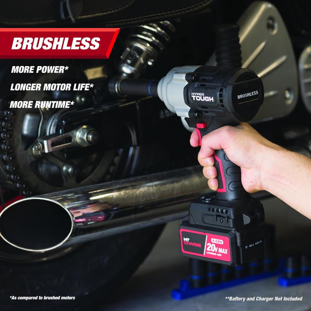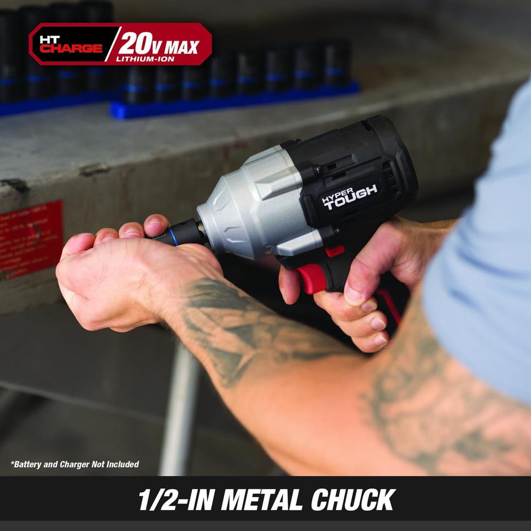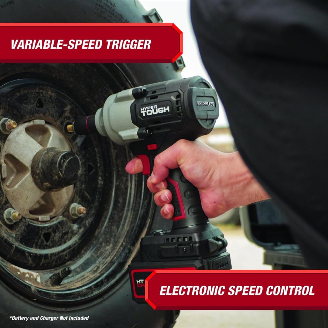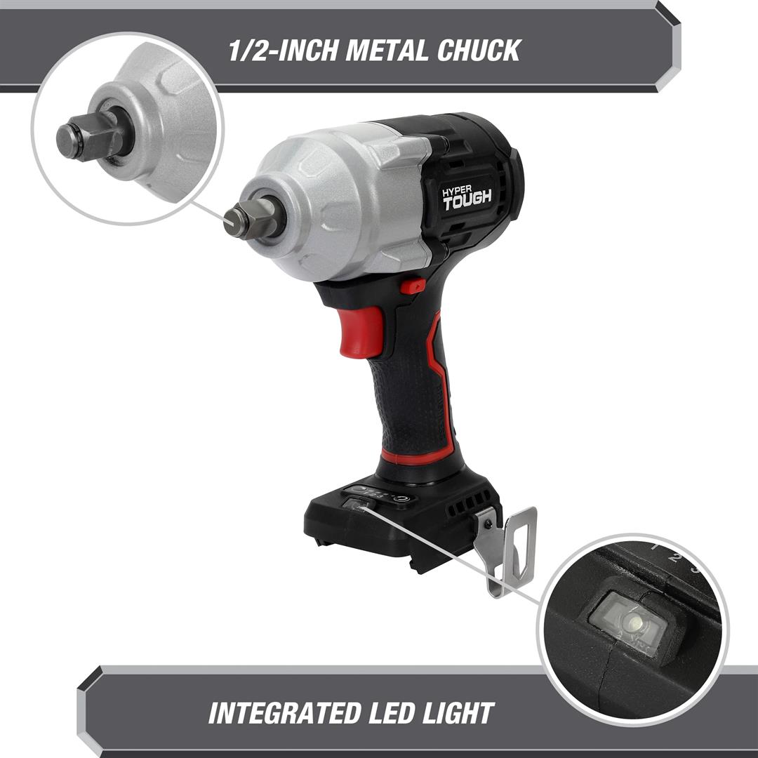 Hyper Tough 20V Max Brushless 1/2-inch Mid-Torque Cordless Impact Wrench 550 ft-lbs Torque Bare Tool 550 ft. lbs. breakaway torque 3 Speed Control Built-in LED work light 5.51 lbs product weight Includes tool only, no battery or charger
