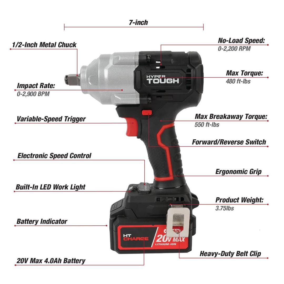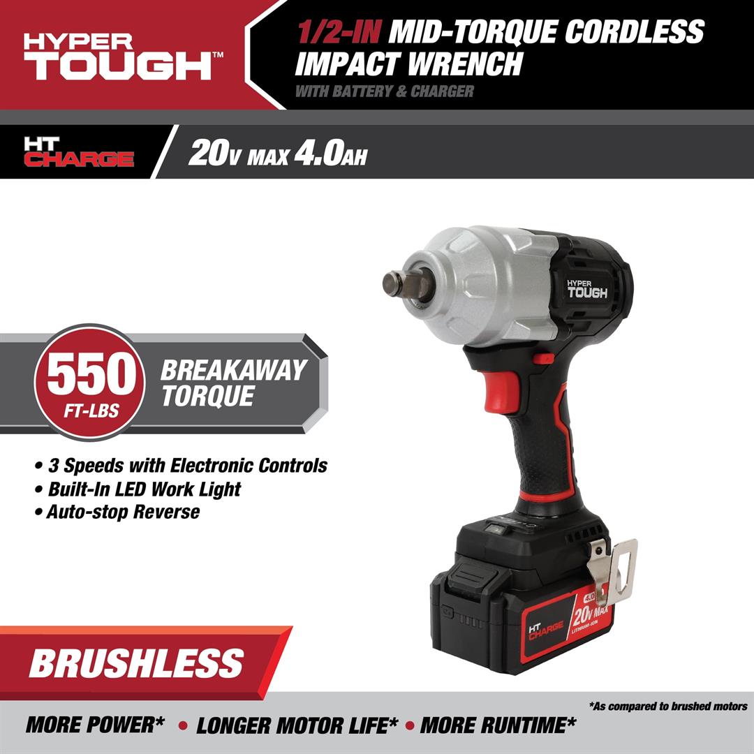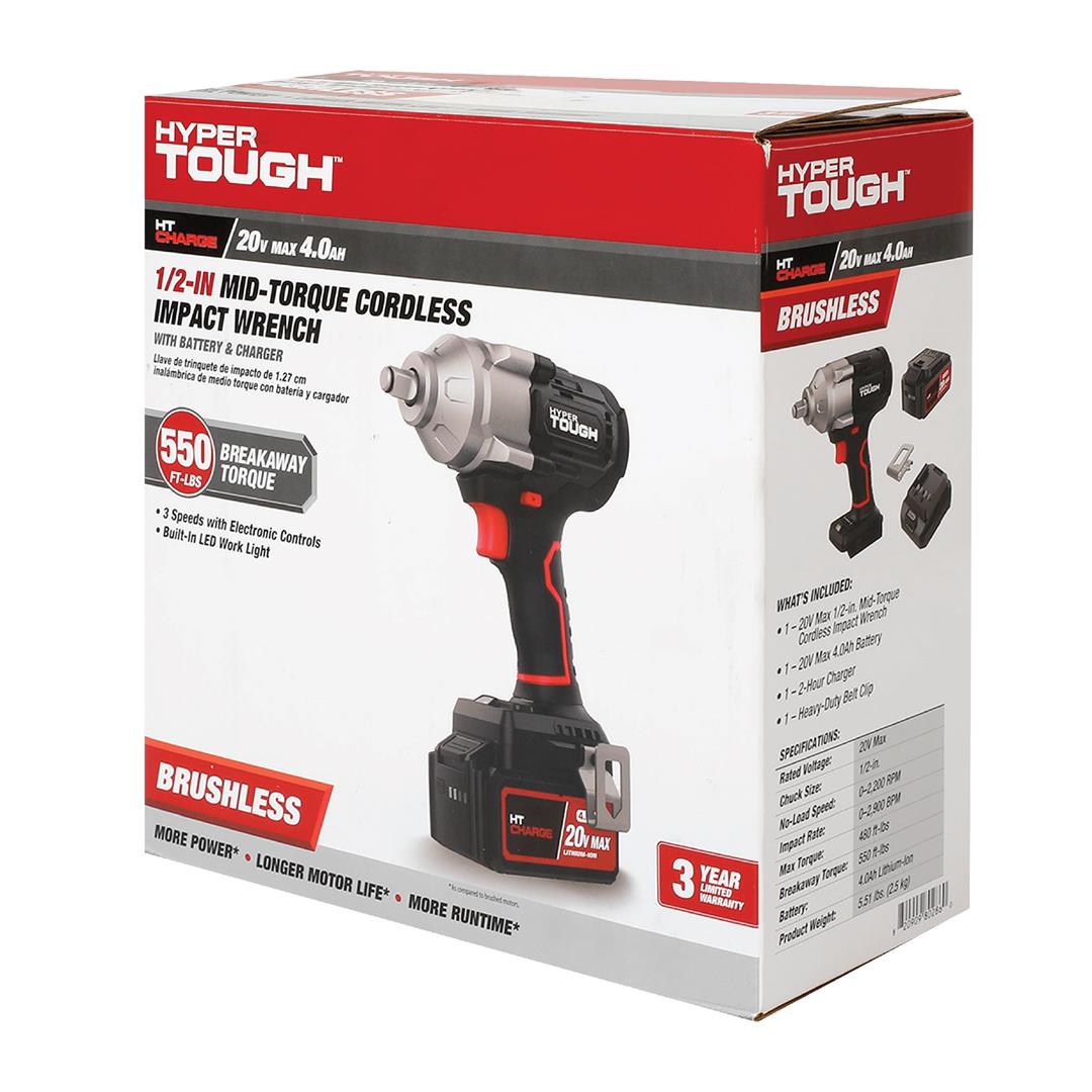 Hyper Tough 20V Max Brushless 1/2-inch Mid-Torque Cordless Impact Wrench with 4.0Ah Lithium-Ion Battery and Charger 550 ft-lbs breakaway torque 3 Speed Control Built-in LED work light With belt clip 5.51-lbs product weight