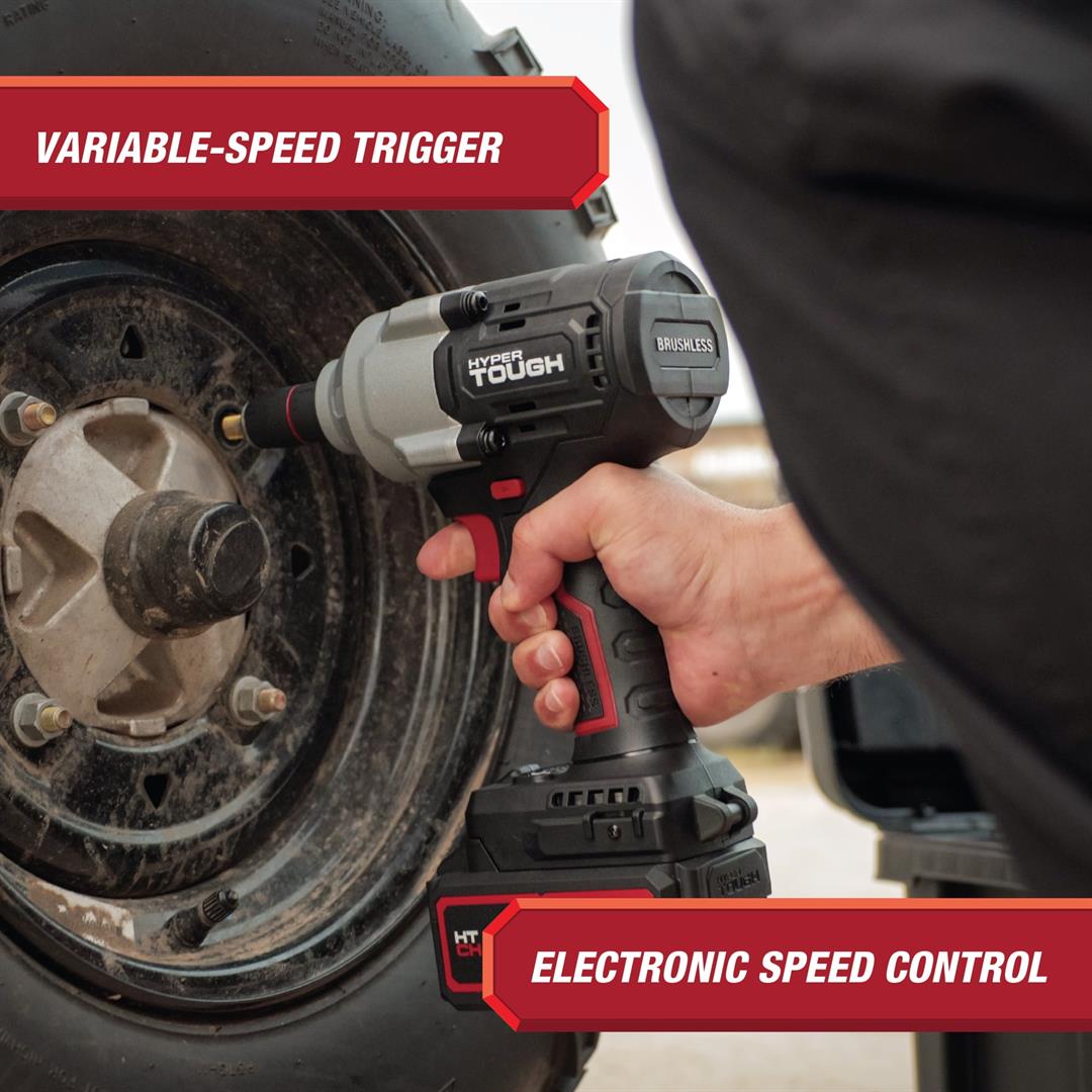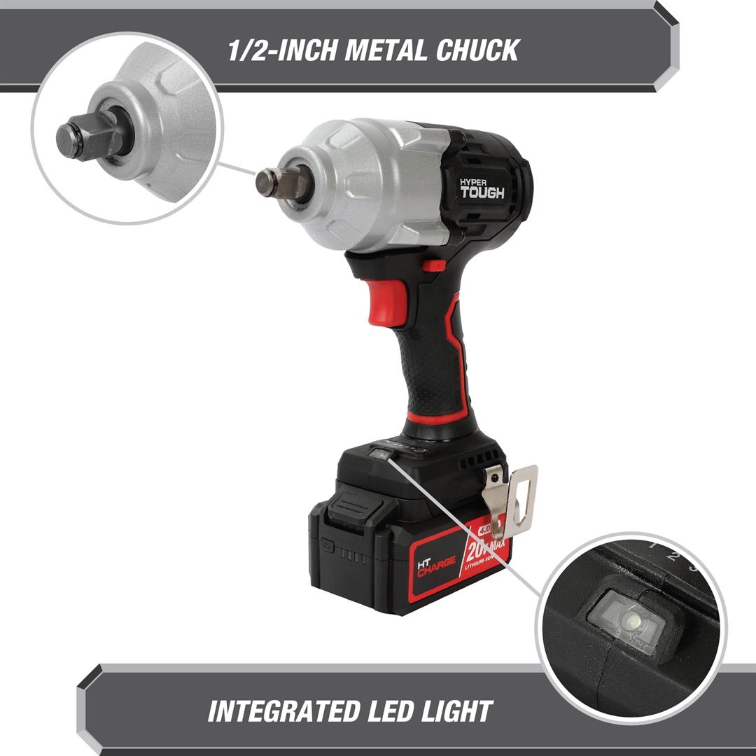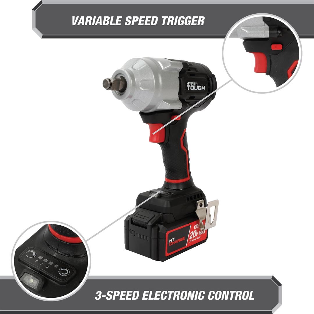 Hyper Tough 20V Max Brushless 1/2-inch Mid-Torque Cordless Impact Wrench with 4.0Ah Lithium-Ion Battery and Charger 550 ft-lbs breakaway torque 3 Speed Control Built-in LED work light With belt clip 5.51-lbs product weight