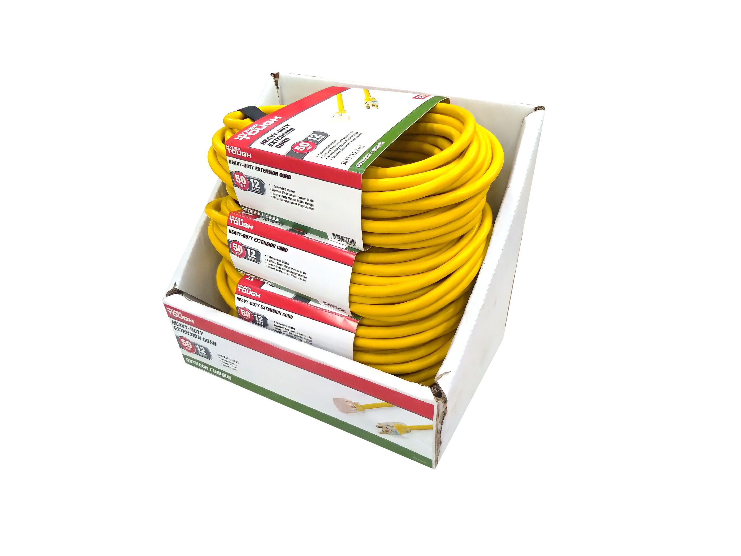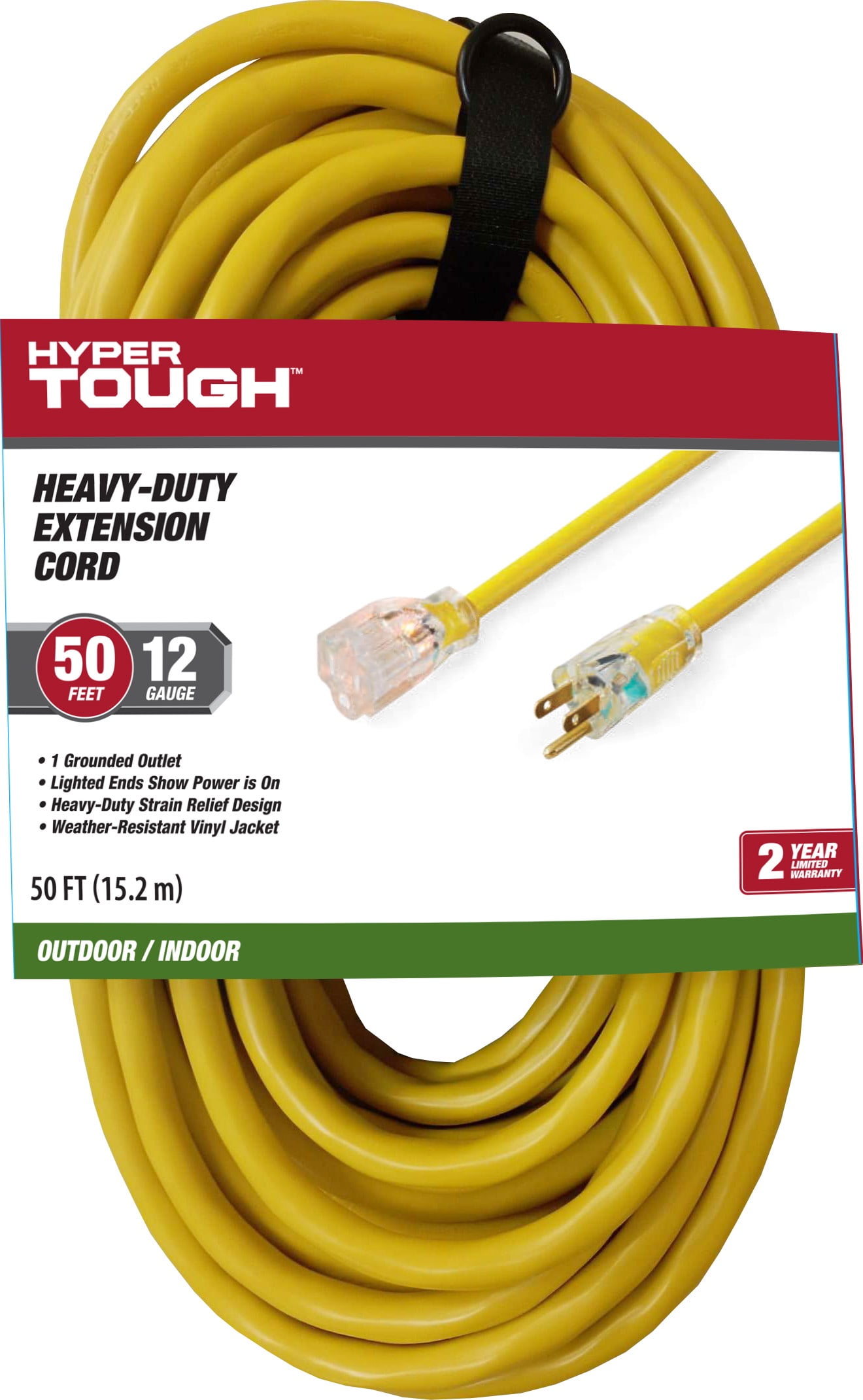 Hyper Tough Indoor/Outdoor Heavy Duty Extension Cord, 50: One grounded outlet Lighted ends show power is on Heavy-duty strain relief design Weather-resistant vinyl jacket Can be used indoors and outdoors Rated 15 Amp, 125-Volt, 1875-Watt Be sure to check out the entire Hyper Tough line for all of your home improvement or construction needs