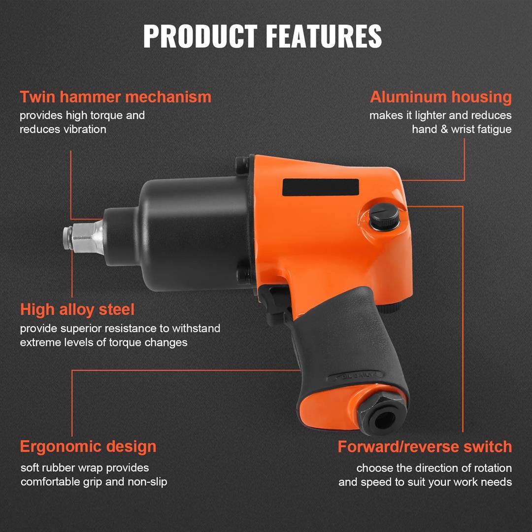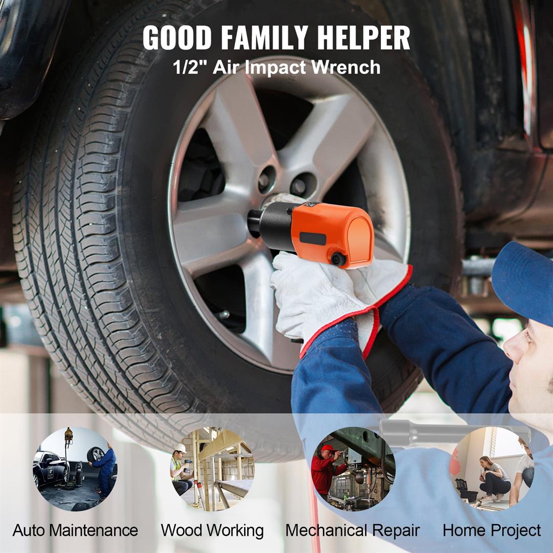Product Description 1/2 Inch Air Impact Wrench Ready to embark on a high-torque experience? With up to 880 foot-pounds output and lightweight design, the KFFKFF air impact wrench is powerful and reasonably priced that can handle automotive and light truck wheel lugs and light suspension work while still being handy and maneuverable. Whether you’re a car hobbyist or a professional mechanic, KFFKFF is your top pick to get the job done. Busting Breakaway Torque The freedom speed of 7500rpm and the loose torque of 880 feet are equivalent to the power of 27 people working together, stubborn bolts and nuts. Lightweight Design KFFKFF 1/2 -inch pneumatic wrench weight is only 5.9 pounds, providing a first -class power weight ratio. Ergonomic Design The rubber handles are anti -slip and comfortable, and the operation is comfortable. Torque Adjustment The 5-bit power regulator means that you can switch between the power mode and adjust the torque output of each task, and the forward-back-back button can change the direction in the breeze. Quiet Tuned Exhaust System Multiple exhaust holes can reduce vibration and noise. One Kit For Every Project It can handle the most tricky work, from family maintenance to automotive or industrial applications. Specifications Working Torque: 560 ft-lb Max Torque: 680 ft-lb Max Loosening Torque: 880 ft-lb Free Speed: 7500 RPM Air Hose: 3/8″ID Square Drive: 1/2″ Avg. Air Consumption: 5 CFM Operation Pressure: 90-120 PSI Main Material: Aluminum Weight: 5.7 lb / 2.7 kg Package Content 1 x Air Impact Wrench 1 x Air Quick Connector 1 x Oil Pot 1 x M6 Hexagon Wrench