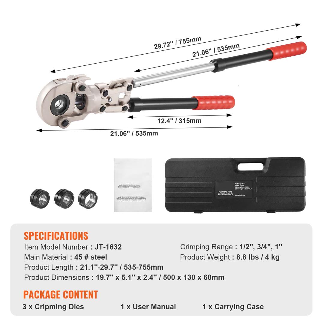 Product Description KFFKFF Copper Tube Fittings Crimping Tool KFFKFF The copper pipe joint crimping tool has excellent crimping ability and can quickly complete pipeline crimping tasks. It is equipped with three copper tube molds: 1/2 “, 3/4”, and 1 “, which can meet various crimping needs. The locking pin mechanism allows for easy mold replacement within seconds. High Efficiency KFFKFF Copper pipe fitting crimping tool has excellent crimping ability, can quickly complete the pipe crimping task. 3 Crimping Dies The Copper Fitting Crimp Tool has excellent crimping capabilities for quick It comes with three copper tube dies: 1/2″, 3/4″ and 1″ for a variety of crimping needs. The locking pin mechanism makes it easy to change dies in seconds. Complete pipe crimping tasks. 360 Rotating Head Provides greater versatility and accessibility in tight spaces. Compact Body It allows for easy manipulation and positioning of tools in narrow areas, enabling efficient crimping even in challenging environments. High-strength Steel Crimping Tool Provides a strong, powerful crimp that ensures a safe, leak-free and precise connection. Easy Operation By following these 4 simple steps, you can quickly and efficiently achieve a safe and reliable crimp connection. Specifications Item Model Number: JT-1632 Crimping Range: 1/2″, 3/4″, 1″ Product Length: 21.1”-29.7″/ 535-755mm Product Weight: 8.8 lbs / 4 kg Main Material: 45# Steel Product Dimensions: 19.7″x 5.1″x 2.4″/ 500x130x60mm Package Content 1 x Copper Tube Fittings Crimping Tool 3 x Crimping Dies 1 x Carrying Case 1x User Manual