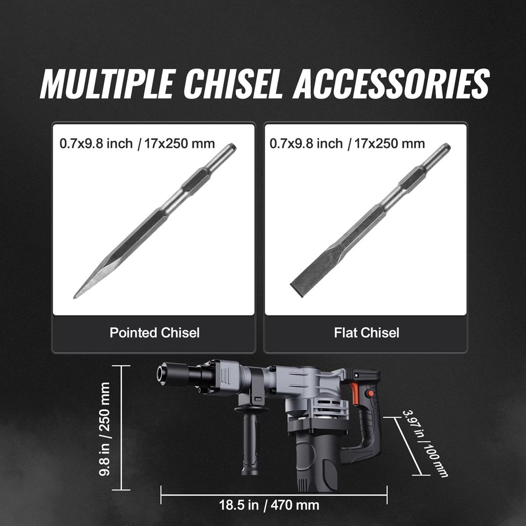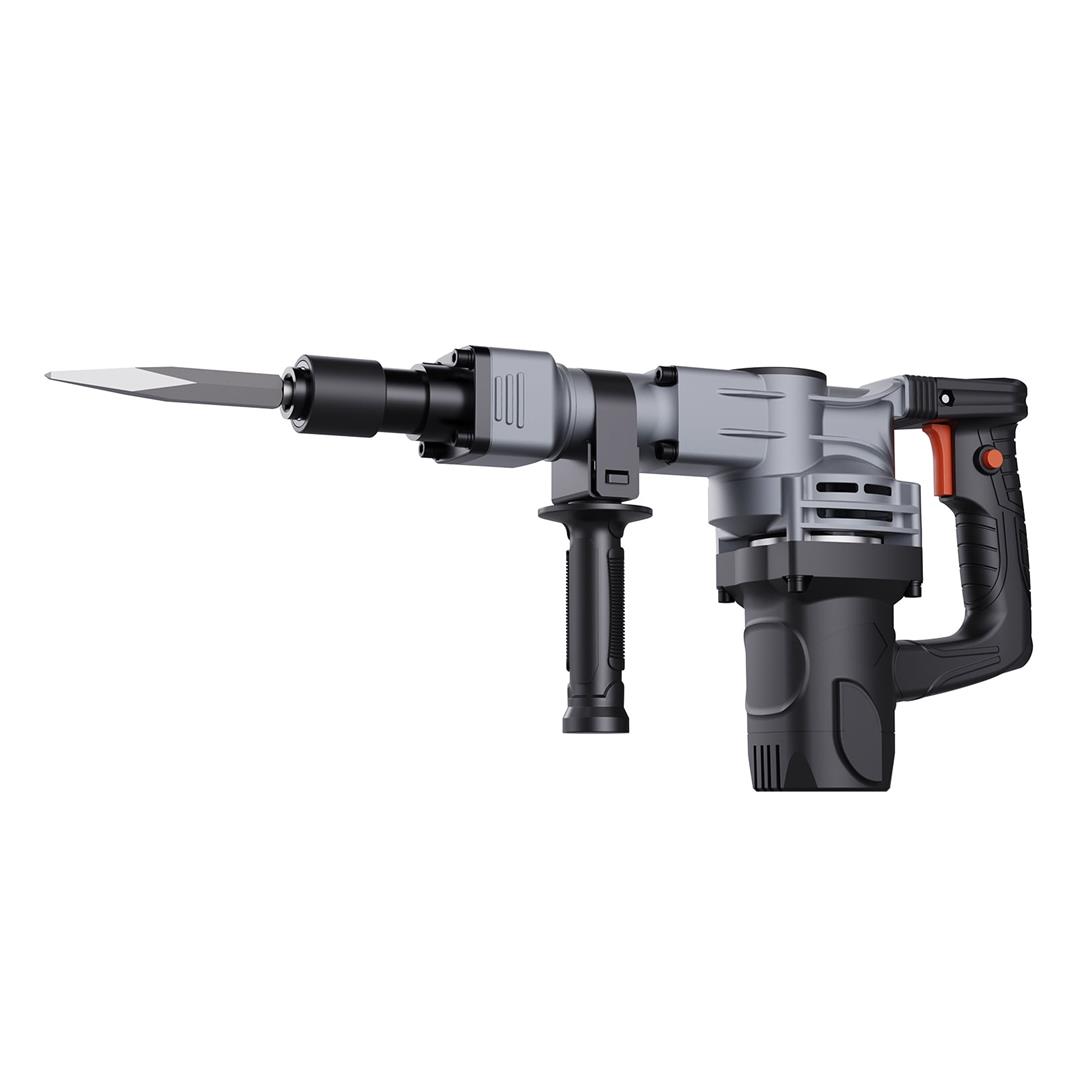 Product Description Electric Jack Hammer Whether you are a professional worker or a DIY user, this jack hammer is your wise choice. This 1400W electric chisel hammer adopts high strength aluminum alloy chuck. An adjustable 360?? grip provides extra control and comfort during extended use. It is suitable for various scenes such as concrete crushing, wall slotting and floor wiring, and road chiseling, etc. It is an excellent tool for daily family interior decoration and small projects. Powerful Motor This electric chisel hammer is lightweight and has a robust 1400W motor. It delivers powerful impact energy to complete demolition, chiseling, excavation, grooving, and cutting projects. This electric chisel hammer is lightweight and has a robust 1400W motor. It delivers powerful impact energy to complete demolition, chiseling, excavation, grooving, and cutting projects. The increased spring can reduce the vibration caused by the demolition. You can finish the job without breaking a sweat. The big trigger button provides a more comfortable grip. Automatic Locking Design You can realize continuously work with these convenient designs. It can release your hands and reduce the pressure of holding and controlling the chipping hammer. Ground Breaking Capable of breaking concrete or rock floor slabs and for home decoration and minor projects. Wall Demolition Jack hammer shovel provides 2900 shocks per minute and breaks down the wall efficiently. Drill Removing Capable of removing porcelain drill. A big trigger and rotary handle make the slotting more flexible. Specifications Model:JH-0840 Noise: ???103dB Input Power: 1400W Rated Impact Frequency: 2900BPM Single Impact Energy: 19J Chuck Type: 5/8″ Hex Shank Net Weight: 17.8 lbs/ 8.1 kg Package Size: 20 x 5.1 x 14 inch/ 510 x 130 x 355 mm Voltage: 110V Package Content 1 x Hammer 1 x Pointed Chisel 1 x Flat Chisel 1 x Wrench 2 x Carbon Brushes 1 x Grease 1 x Gloves 1 x Goggles 1 x Mask 1 x Portable Case