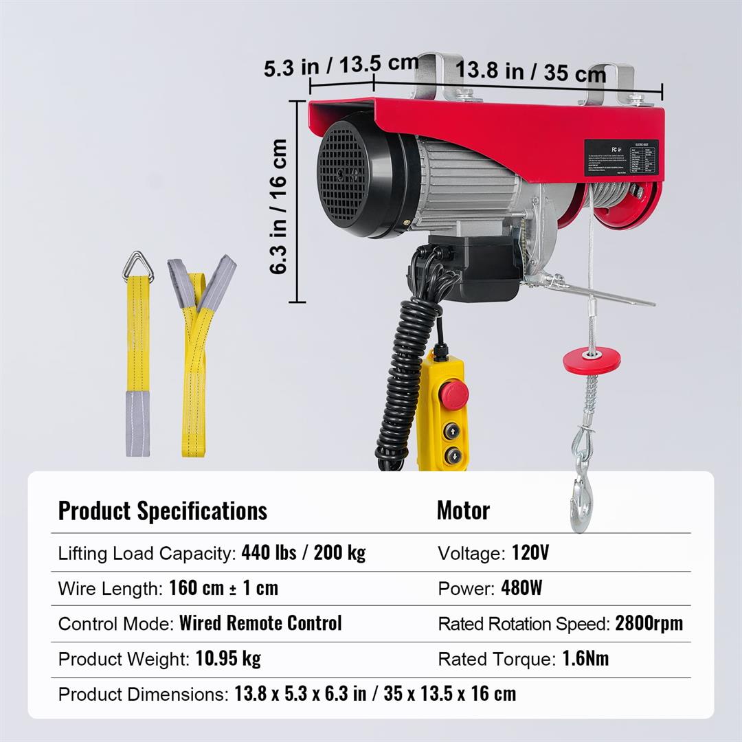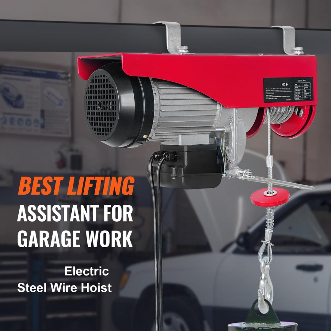 440 lbs Load Capacity: This garage lifting machine can easily lift small engines, transmissions, large workshop tools, or construction supplies. Capacity: 220 lbs (Single Line), 440 lbs (Double Lines). Powerful Motor: The high-quality copper motor provides 480W of strong power, which can withstand large forces without causing deformation of the electric winch. In addition, the large cooling fan can quickly cool the machine to avoid overheating. Therefore, this powerful motor ensures efficient operation and saves you more time and energy. Convenient to Install: It can be directly hanged on the ceiling using metal or solid wooden strips. Moreover, it is equipped with an emergency stop switch and electromagnetic braking system to avoid abnormal sliding. Remote Control: Wired remote control is achieved through the switch of a controller on the cable installed on the machine. The length of the extended cable is approximately 14ft, allowing you to operate within a secure distance. Multiple Uses: It is widely used in garages, factories, warehouses and families, as well as professionals and amateurs; Suitable for repairing ships, cars, lawn mowers, golf carts, home decor, engines, boulders, trees, etc.