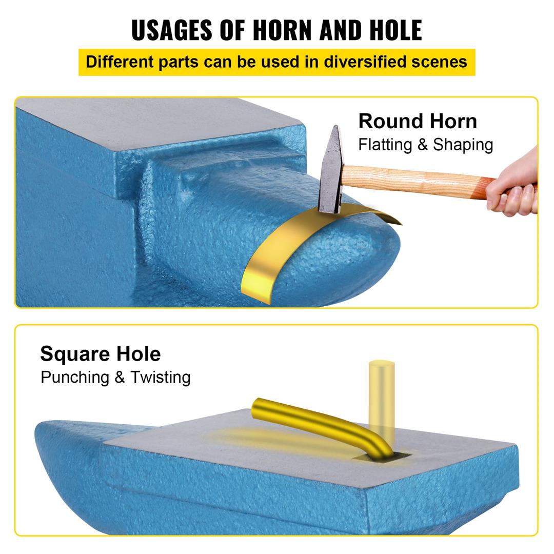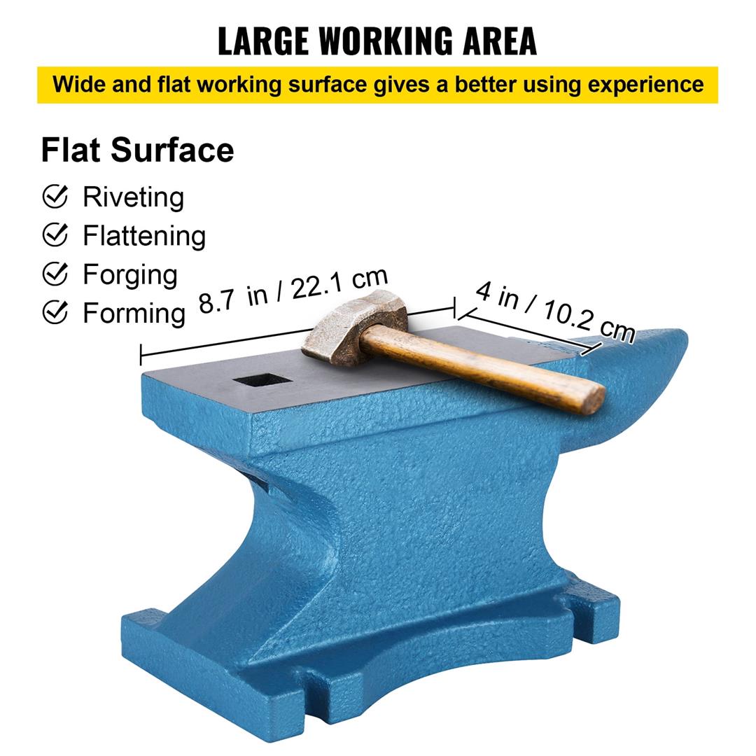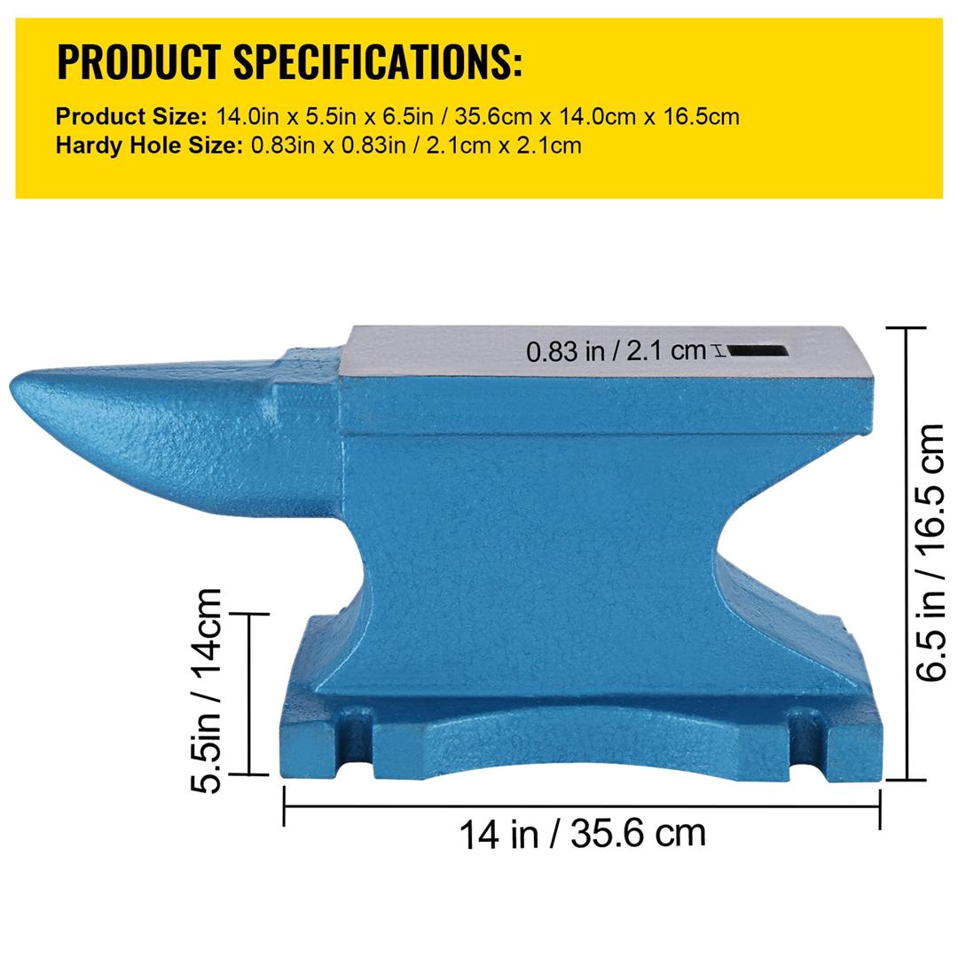 Product Description 55 Pounds Iron Anvil This steel anvil has a single horn and a square hole. A rounded horn is for smooth bending and shaping; the hole is better for accessories punching and bending. It is perfect for metal-smiths, riveting, flattening, forging, and forming metal. The cast iron material is rigid enough to bear heavy blows. Cast Iron Construction Our 55-pound anvil features a graded cast iron body. Hammering and using it to form any metal will give you a great workpiece. Thanks to the drop wrought iron with maximum strength, it can withstand heavy blows. Square Hole & Horn The rounded corners of the cast iron anvil are used for smooth bending and forming. Square holes can be used for fittings, punching, and bending. Surface Treatment Our forged anvils have a fully polished surface area, excellent finish, and protective varnish for corrosion and rust resistance. Solid & Stable Design The sturdy base keeps the 55-pound anvil blacksmith stable by metal manipulation or forging. Large Countertop This metal forging comes with a flat and wide work surface, giving you a larger work area to work with metalwork. Various Application The sturdy cast iron anvil is perfect for metalsmithing, riveting, flattening, forging and forming metal, making it perfect for any handyman or hobbyist. Specifications Material: Cast Iron Working surface(L x W): 8.7 x 4 inch Horn length: 5.5 inch Hole size(L x W): 0.83 x 0.83 inch Net weight: 55 lbs Gross weight: 56 lbs Overall Length : 15 inch High: 6-5/8 inch Product size(LXWXH): 14.2 x 4 x 6.5 inch Packing size: 15 x 7 x 8 inch Package Content 1 x 55 LB Anvil