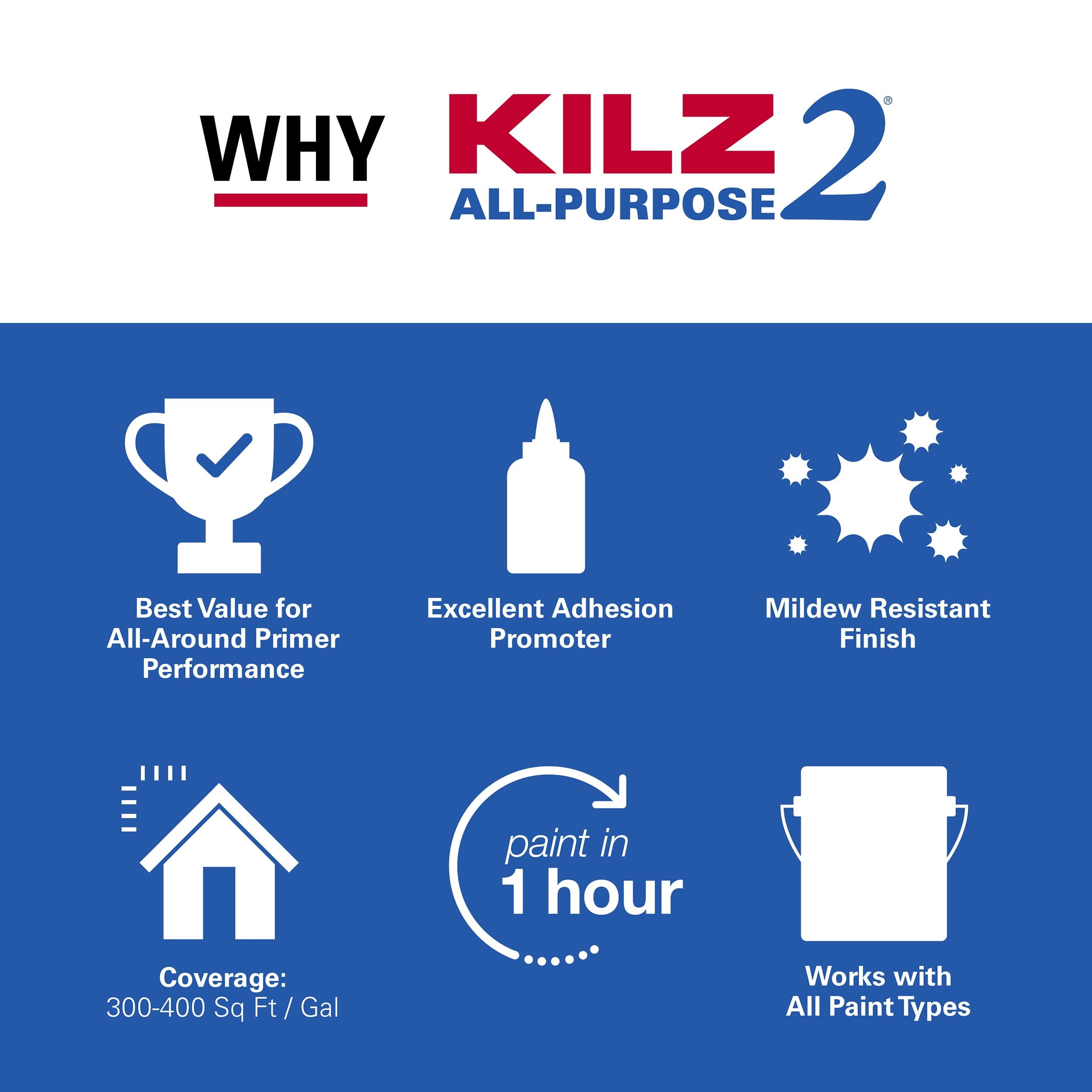 Get great paint results inside and out with KILZ 2 ALL-PURPOSE Primera trusted, water-based formula designed for excellent adhesion, stain-blocking, and sealing. This versatile primer-sealer blocks medium stains like minor water damage, rust, grease, ink, pencil, and felt marker, while providing a mildew-resistant coating and very low odor. Perfect for prepping a wide range of surfaces, KILZ 2 is ideal for drywall, wood, masonry, plaster, paneling, brick, painted metal, and even properly prepared glossy surfaces. Whether youre painting over bold colors or freshening up older surfaces, its enhanced hiding power helps reduce the number of paint coats neededsaving you time and money. Fast-drying and easy to clean with soap and water, this primer can be used under or over both water-based and oil-based paints. Its not recommended for flooring. With over 50 years of trusted performance, KILZ 2 ALL-PURPOSE Primer is your go-to solution for a smoother, longer-lasting paint finishon nearly any surface.