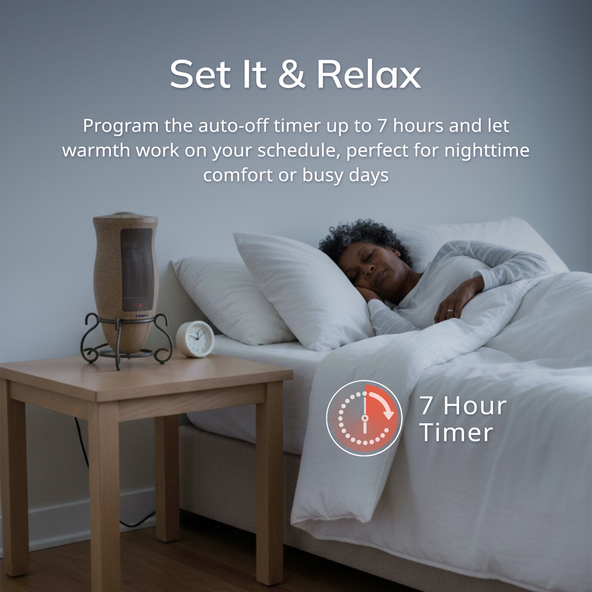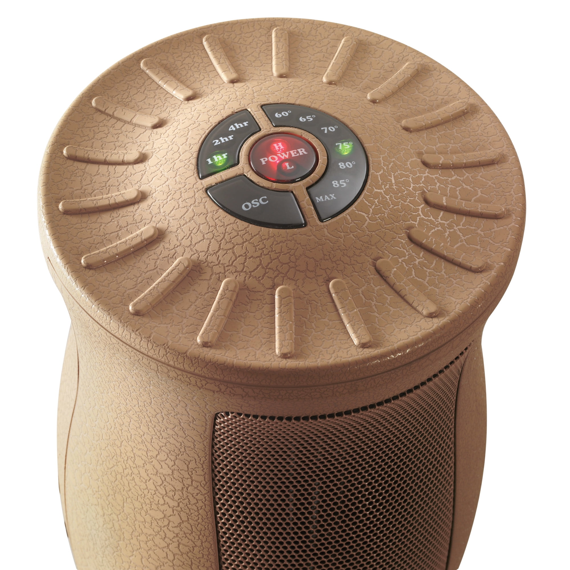 Unique, stylish heater design that blends into your dcor while keeping you warm Top-mounted electronic controls 2 quiet heat settings Adjustable thermostat maintains preferred temperature setting 7-hour auto-off timer Widespread oscillation for full-room coverage Multi-function remote control operates the heater from a distance Comes fully assembled and ready to use Built-in safety features help to keep this ceramic heater from overheating, and a cool touch exterior helps keep the exterior housing from reaching dangerous temperatures, even after it has been running for hours 3-year limited warranty