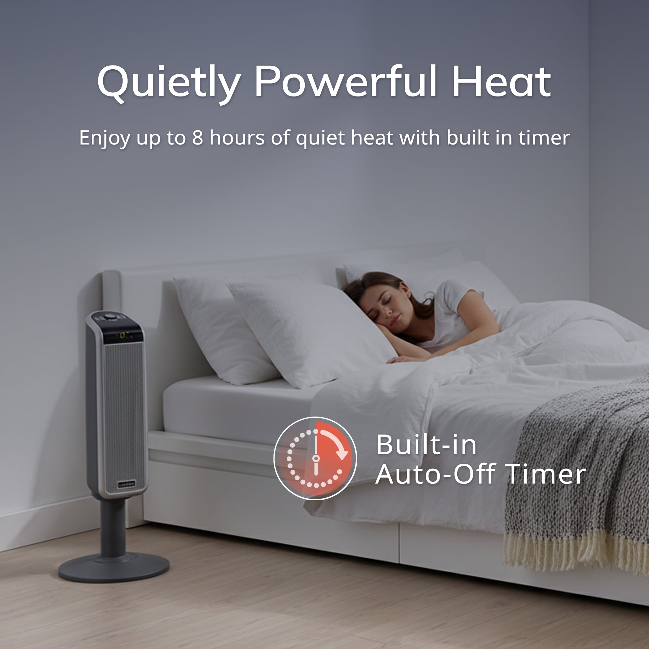 Top-mounted electronic controls with easy-to-read digital display Features 2 quiet heat settings (1500 watts on high, 900-watts on low) 8-hour auto-off timer Widespread oscillation for full room coverage Adjustable thermostat maintains the desired room temperature Multi-function, digital remote gives you total control of your space heater’s functions–even from across the room Built-in carry handle for easy portability Built-in safety features, including overheat protection, self-regulating ceramic element, and cool-touch housing Simple assembly required Ideal for medium-sized rooms such as the bedroom, living room and home office Condition: New