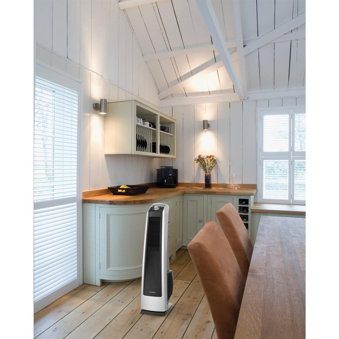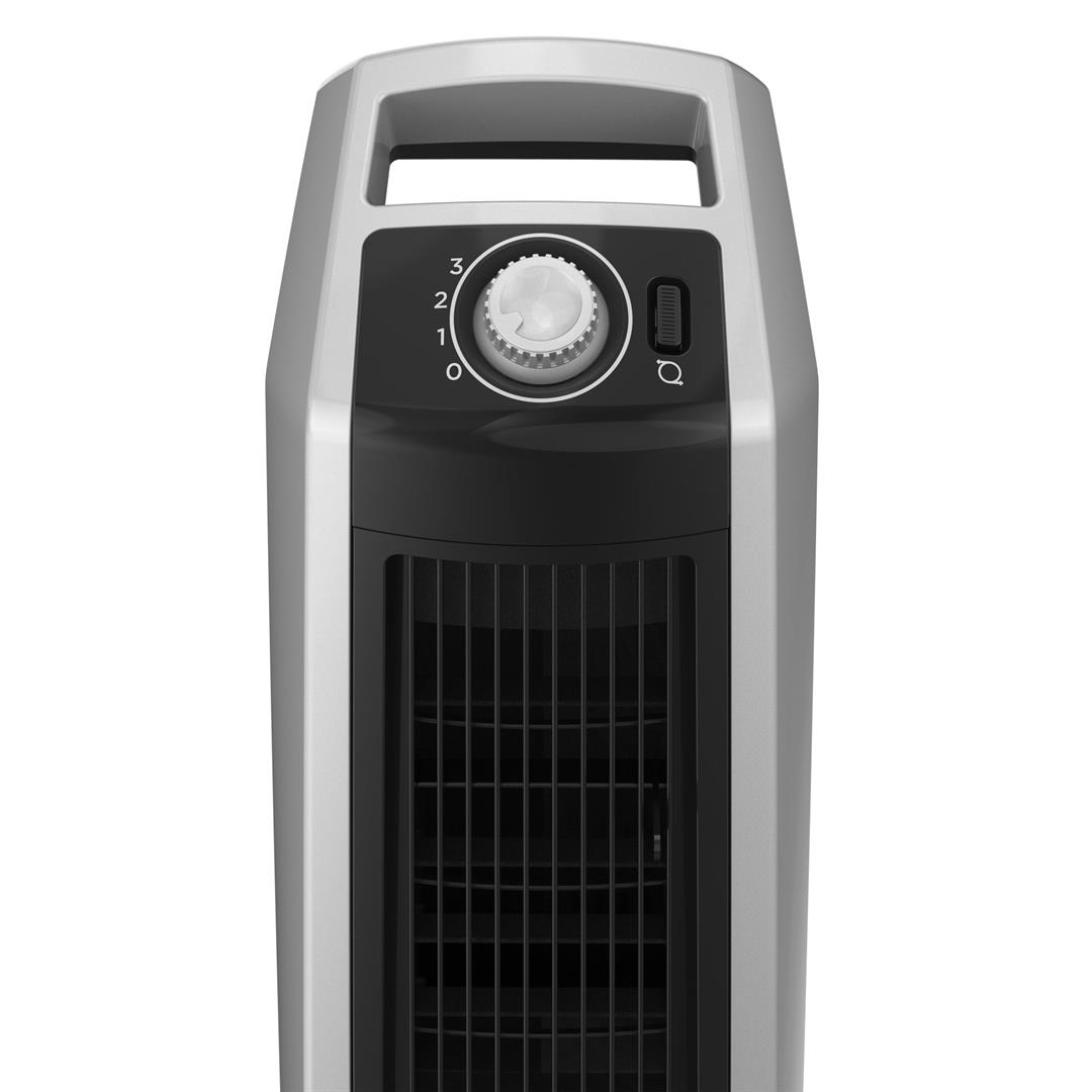 Space-saving tower fan design for home or office High-powered motor for maximum performance 3 powerhouse speeds Fully assembled and ready for use Directional louvers for precision air delivery Easy-to-use, top-mounted manual controls Oscillation for broad room coverage Easy-grip carry handle for simple portability Features patented safety fuse technology Durable construction and powerful air velocity make this ideal for garages, basements, and more