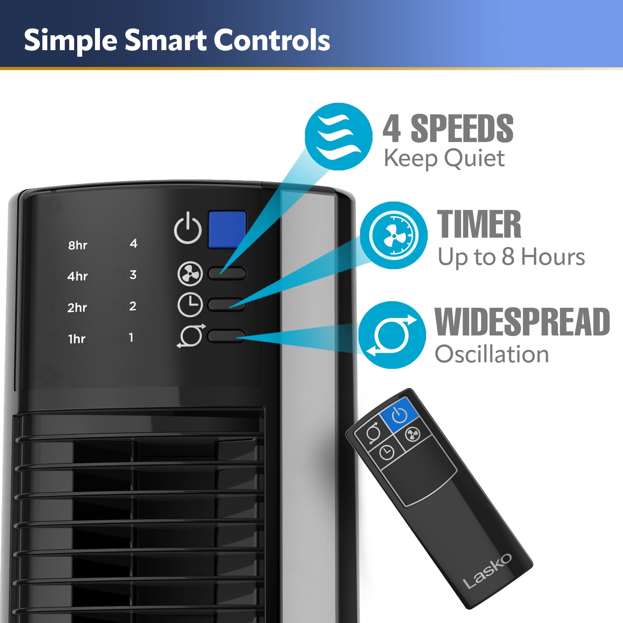 Provides over 25% more air velocity than traditional tower fans for enhanced cooling performance Slim, space-saving design is ideal for use in home or office environments Features an 8-hour auto shut-off timer for added convenience and energy efficiency Offers 4 powerful fan speeds to suit your cooling needs Comes equipped with a multi-function remote control for easy operation from a distance Widespread oscillation ensures full-room coverage for optimal air circulation Built-in carry handle makes it easy to move the portable fan from room to room Simple, front-facing controls provide intuitive operation Includes Lasko’s trusted safety fuse technology for peace of mind Sleek, neutral design blends seamlessly with your existing home decor