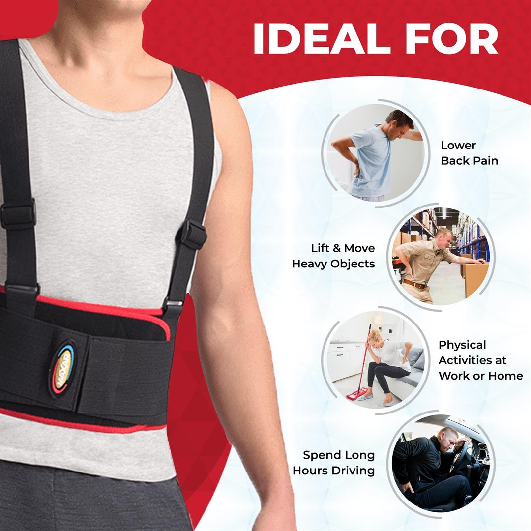 MAXAR Work Belt, Industrial Lumbosacral Support Back Brace provides excellent support and comfort abdominal and lumbosacral areas. It helps form correct posture and avoid back injuries while working or lifting heavy loads. Our deluxe work belt comes with detachable suspenders and has 6 spring metal stays to reduce pain and protect from lower back injuries.