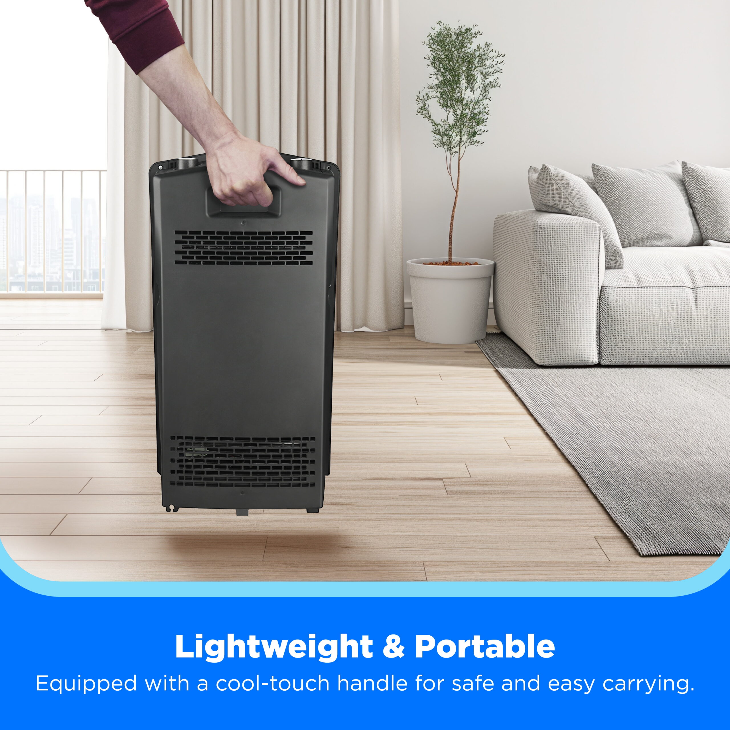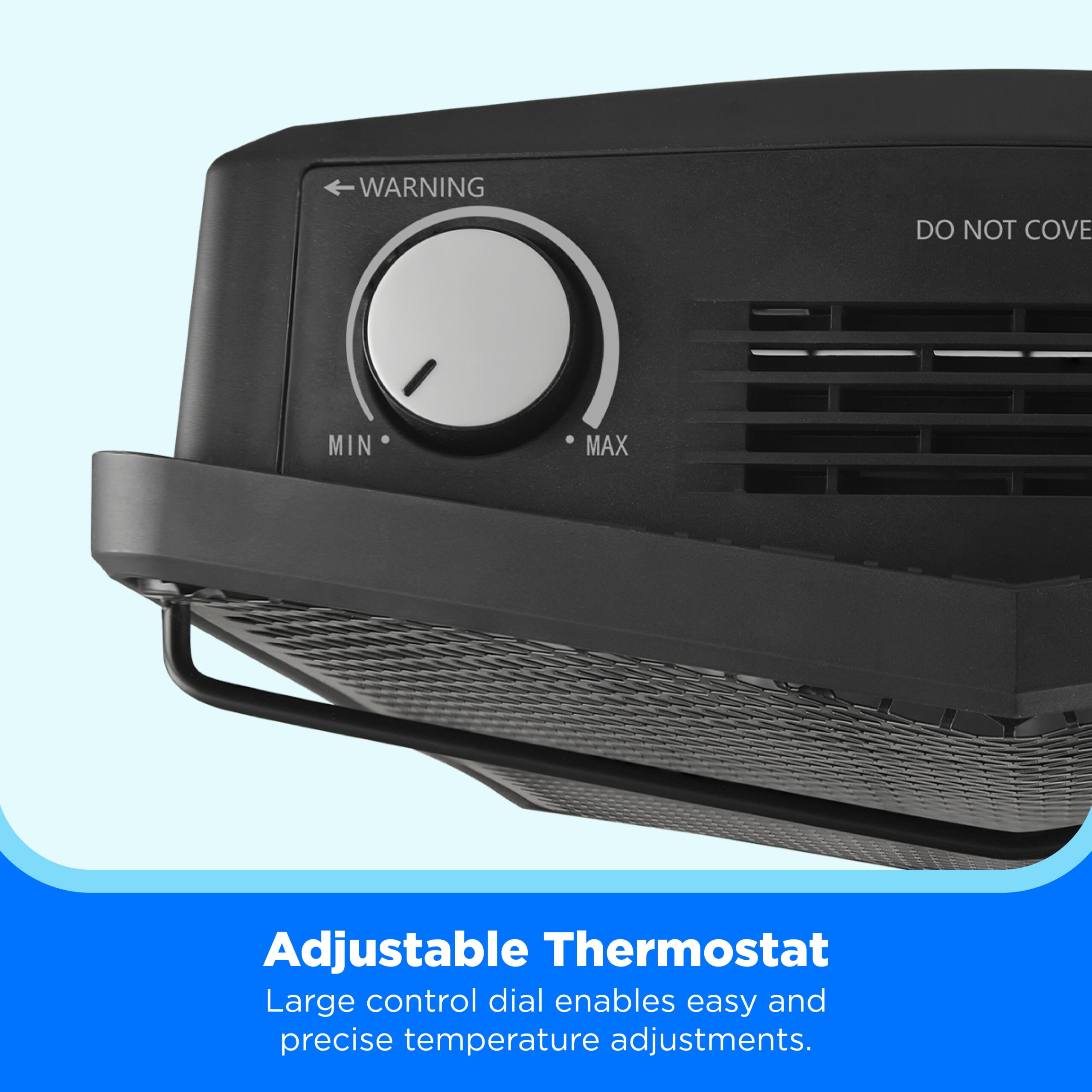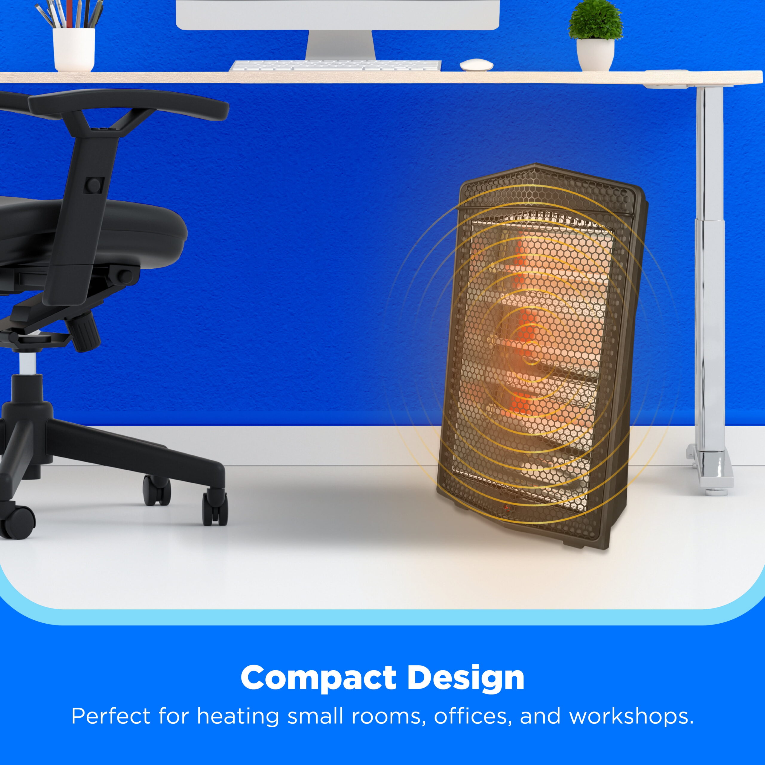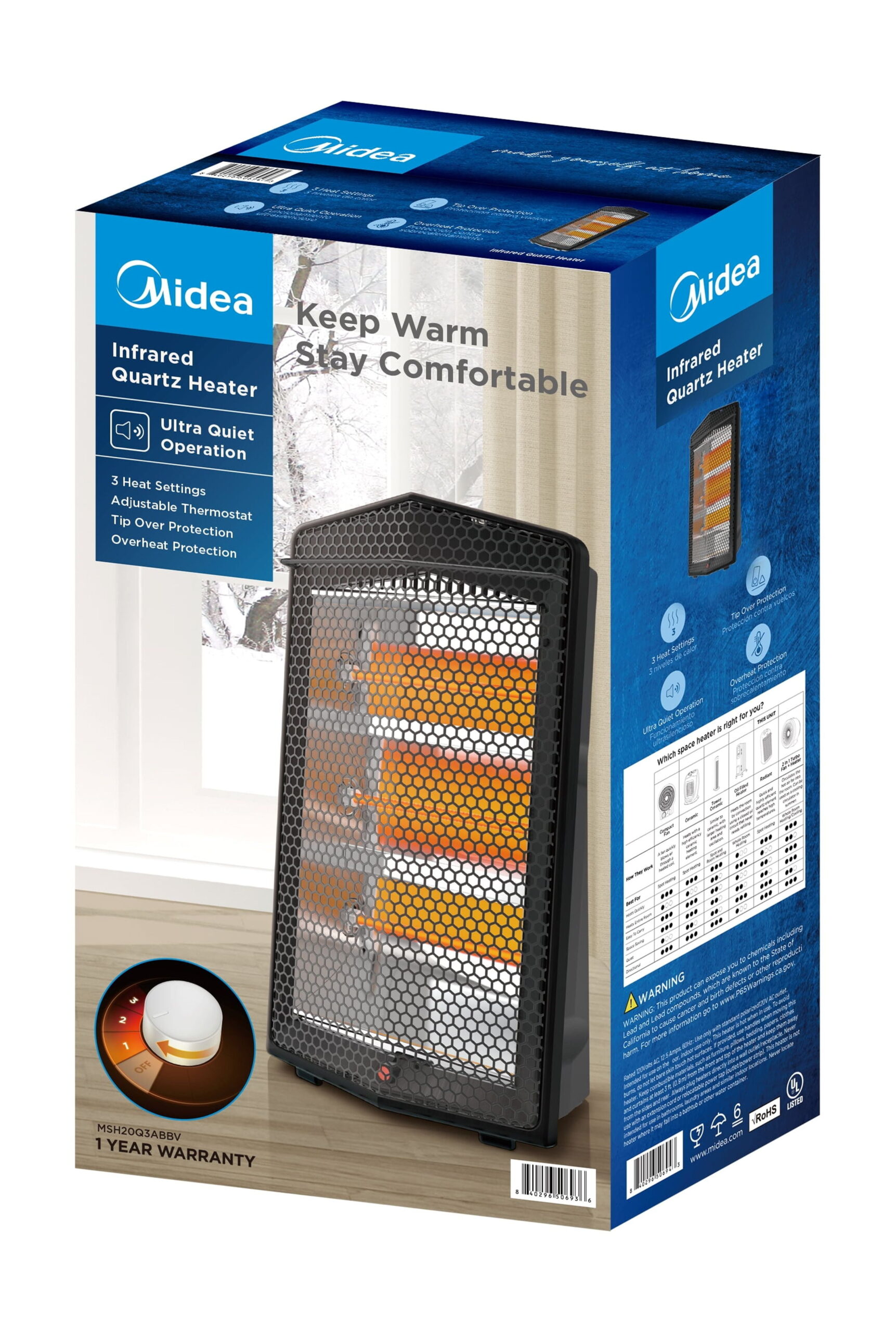 Midea 1500W Quartz Indoor Electric Space Heater, MSH20Q3ABBV, Black, New Personalized Comfort: Choose from 3 heat settings that provide instant, even, and targeted heating. Adjustable Thermostat: Large control dial enables easy and precise temperature adjustments. Lightweight & Portable: Equipped with a cool-touch handle for safe and easy carrying. Enhanced Safety Features: Offers overheat protection and tip-over protection for worry-free operation. Compact Design: Perfect for heating small rooms, offices, and workshops.