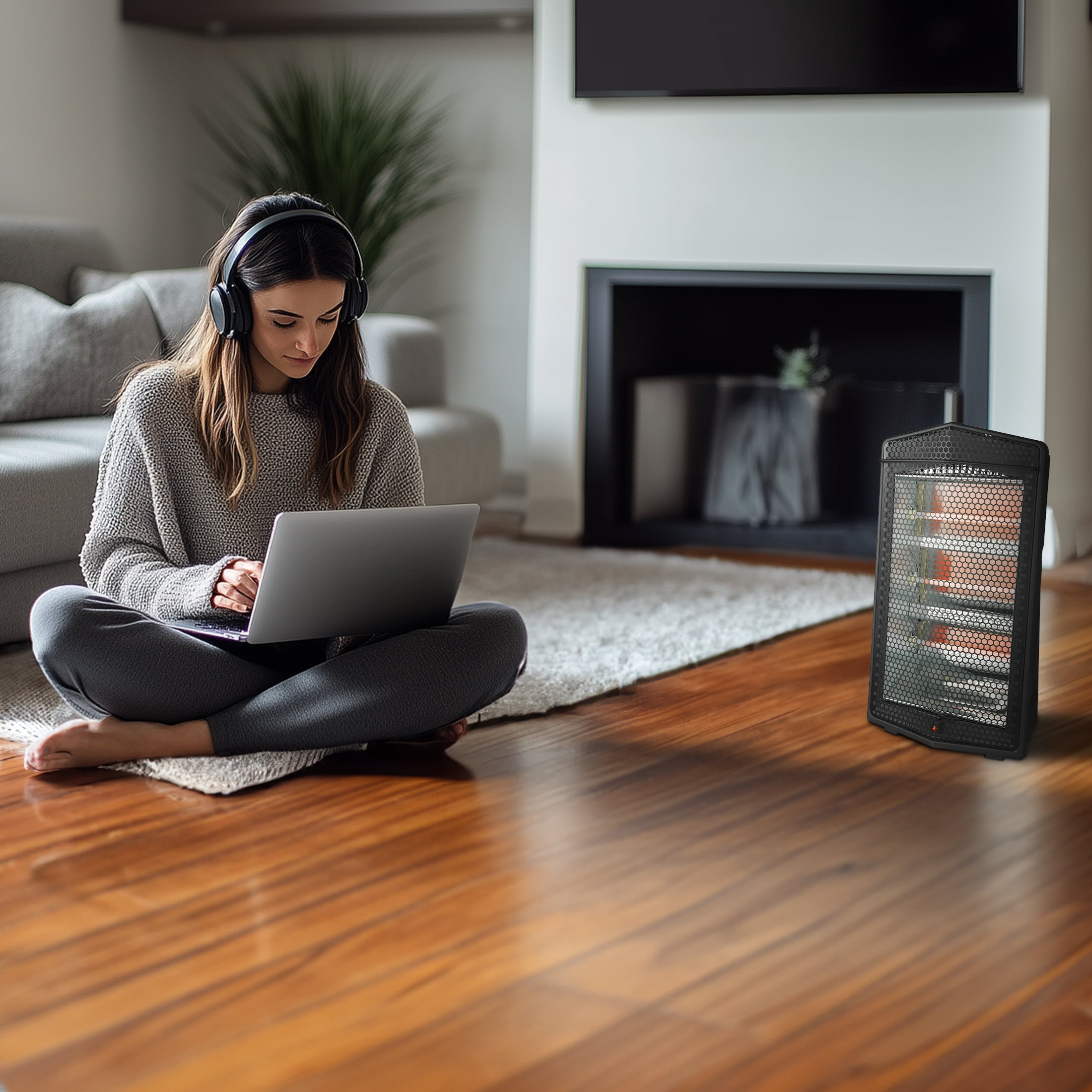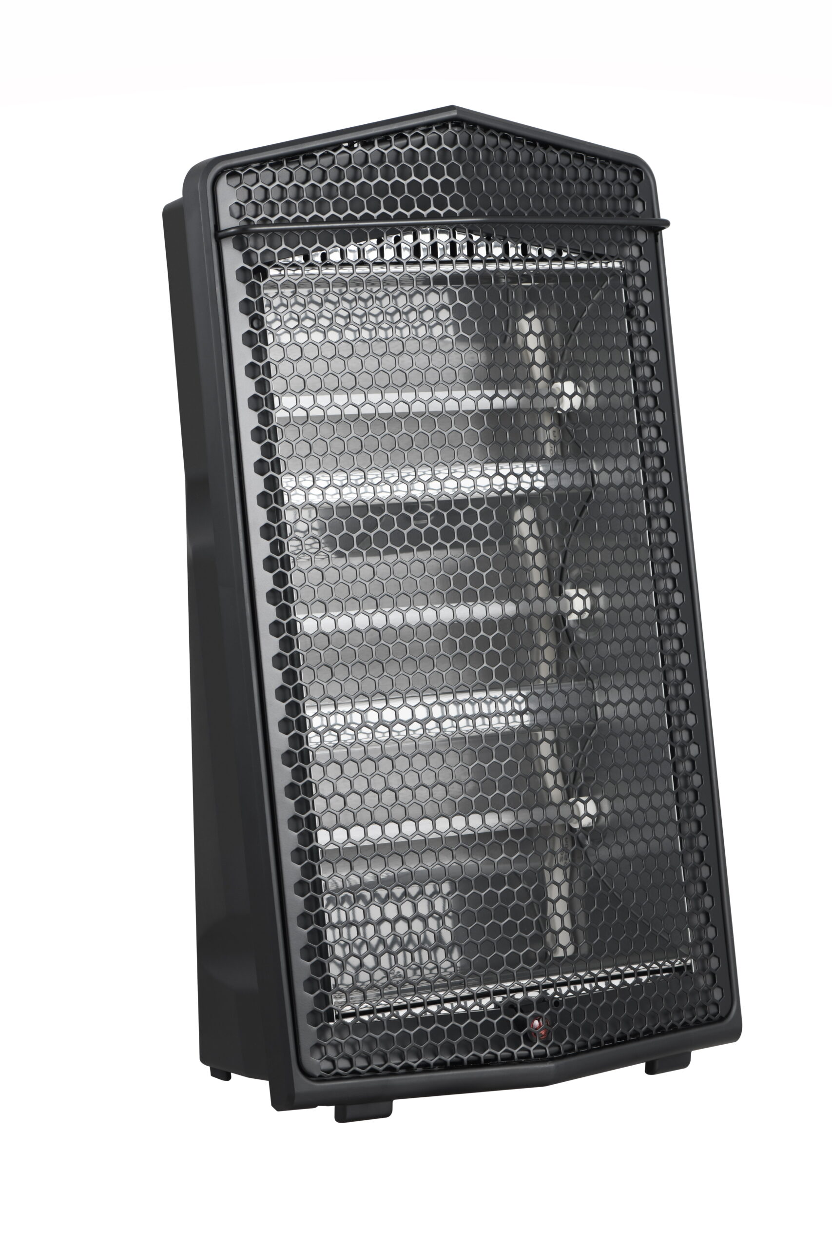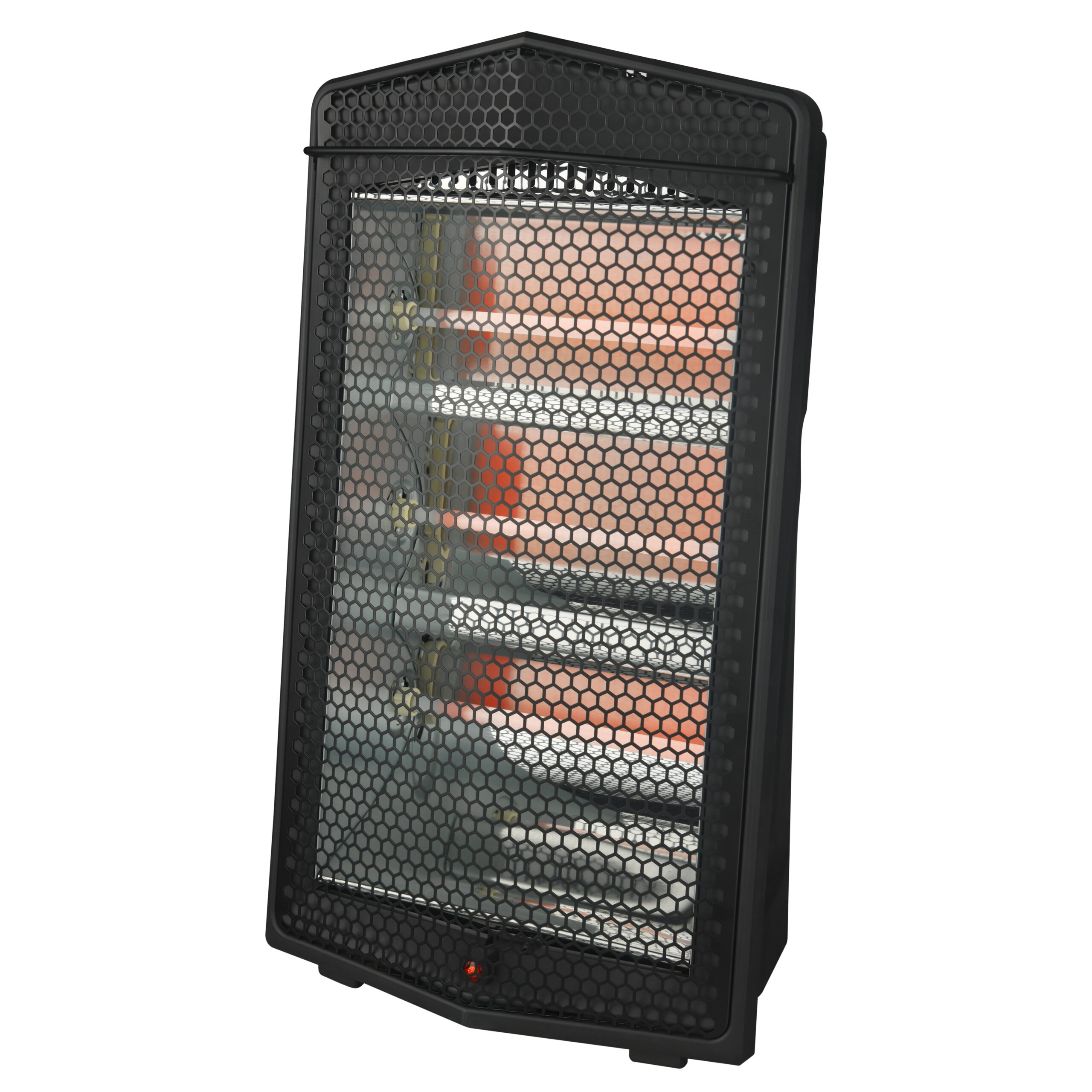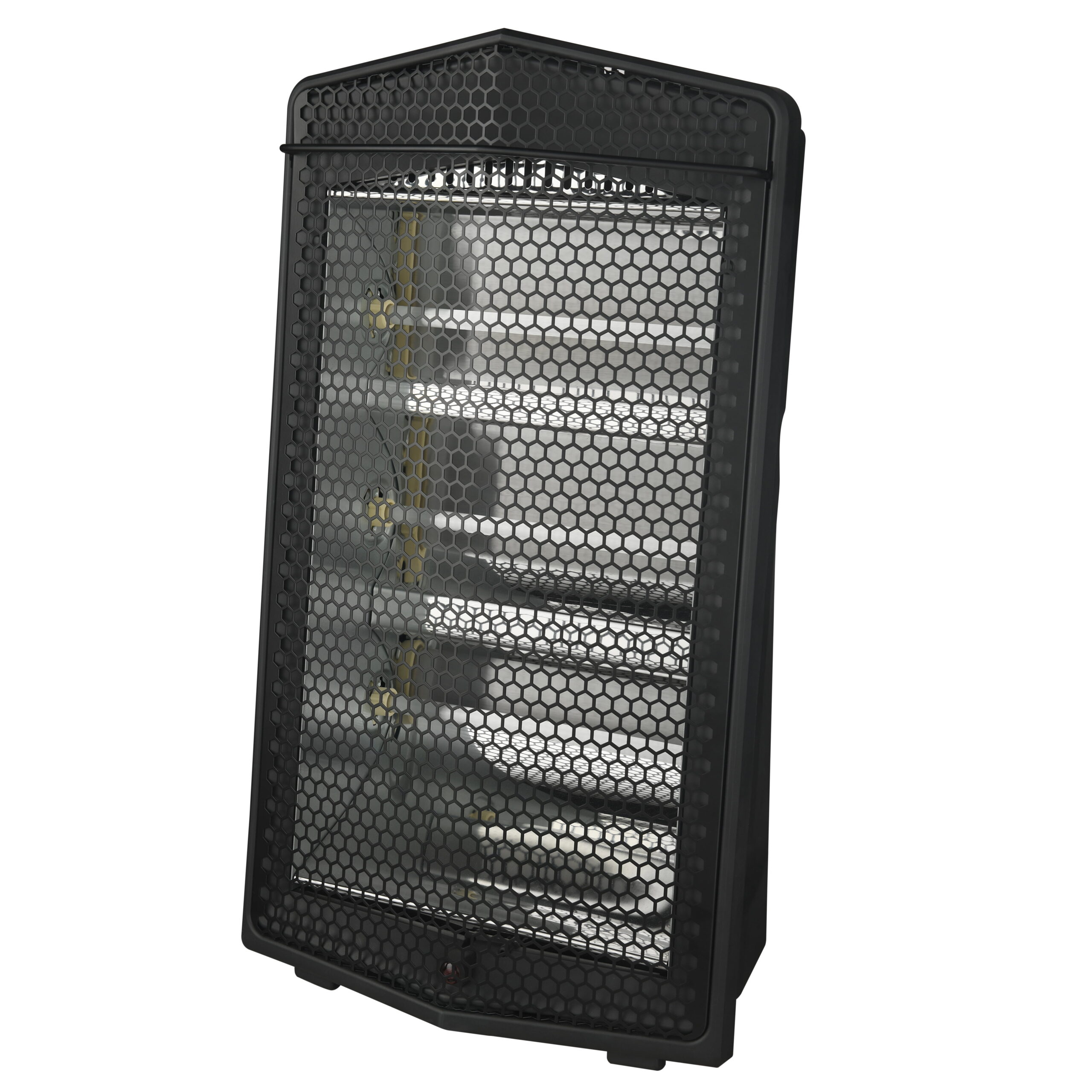 Create a warm and comfortable space for work or relaxation with this new Midea radiant quartz heater. By lowering your home thermostat slightly and using this heater to warm just the room you are occupying, it can lead to significant savings on your heating bills. The heater employs three quartz tubes, which heat up quickly and give off a warm glow when in use. The quartz heater offers 3 different heat settings. You can switch between the high, medium and low heat settings by simply turning a control knob at the top of the unit. A second knob allows you to easily adjust the thermostat to just the right temperature for your space. This heater is designed with safety in mind, a tip-over switch automatically turns the heater off if it is knocked over, while a built-in sensor helps to prevent the unit from overheating. A molded handle makes it easy to carry, and the stay-cool handle and housing allow you to safely transport it from room to room. The Midea quartz heater has a space-saving design that fits into small rooms with ease. It comes in a sleek black finish that effortlessly complements a wide variety of different decor styles.