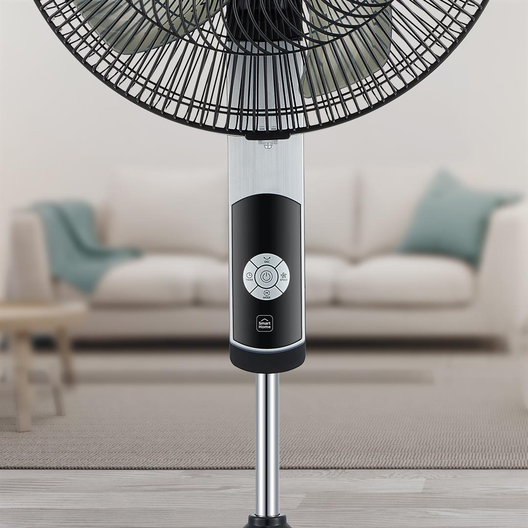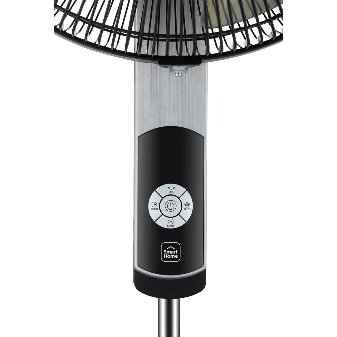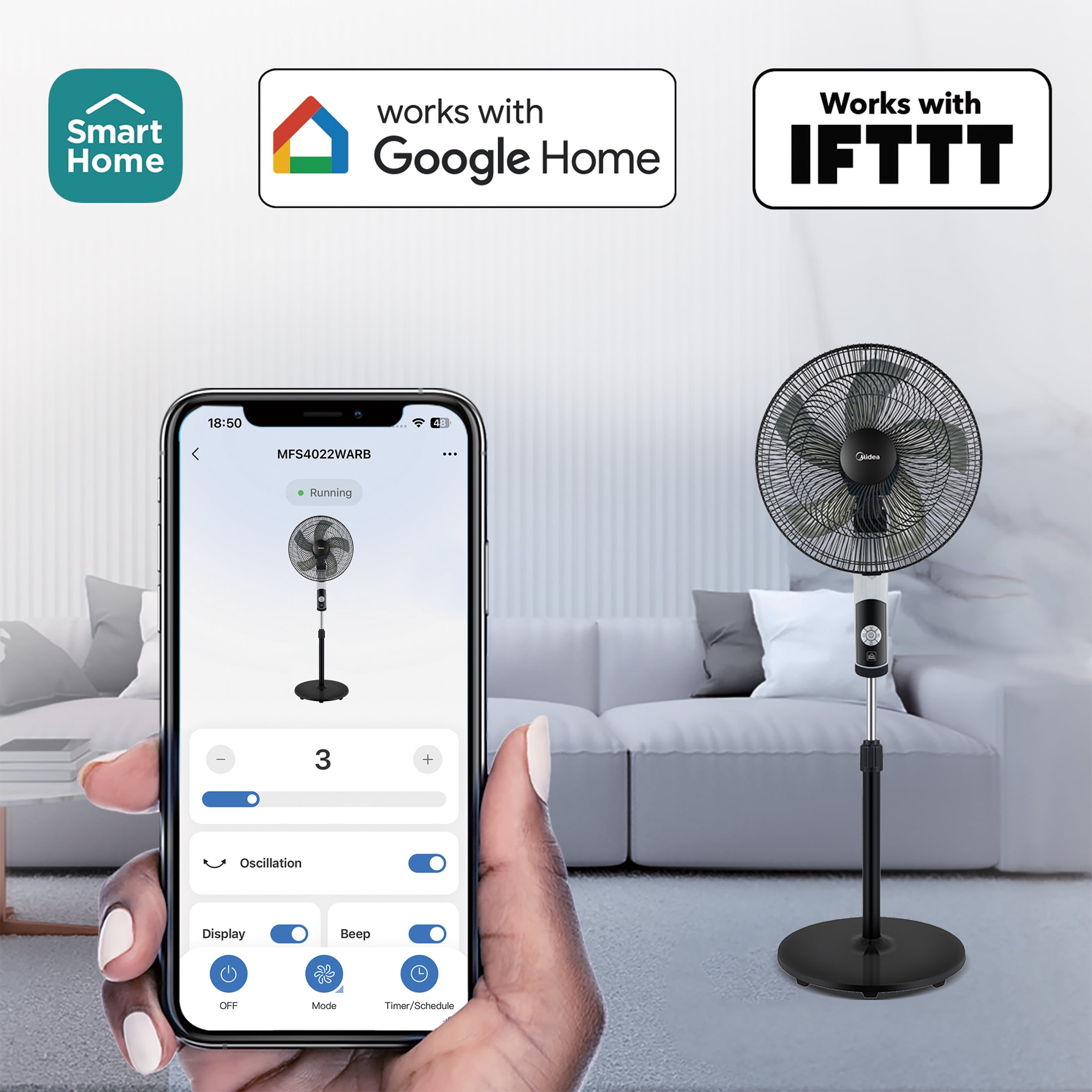 Make comfort smarter with the New Midea 16-inch Smart Stand Fan. With 12 speed settings, a 12-hour programmable timer, adjustable height, and 4 fan modes, you can customize your cooling to match your needs. With the ultra-quiet DC motor, you can keep cool while reading a book, watching your favorite movie, or enjoying undisturbed sleep. This Smart Fan is Wi-Fi enabled with the MSmartHome App. Voice controls are available with Alexa and Google Assistant Devices. Along with the smart features, this fan can also be controlled with the easy-to-read LED display and included remote control.