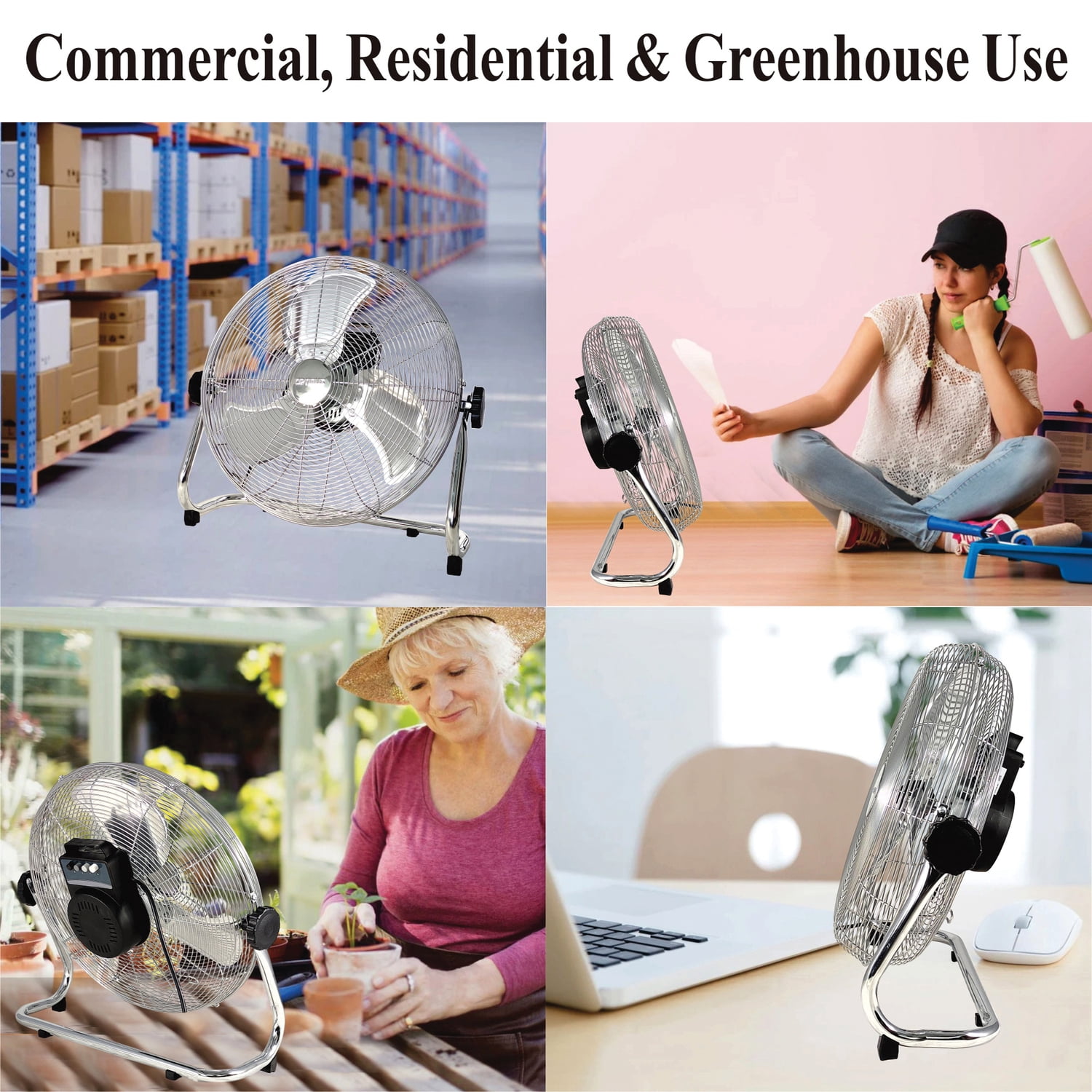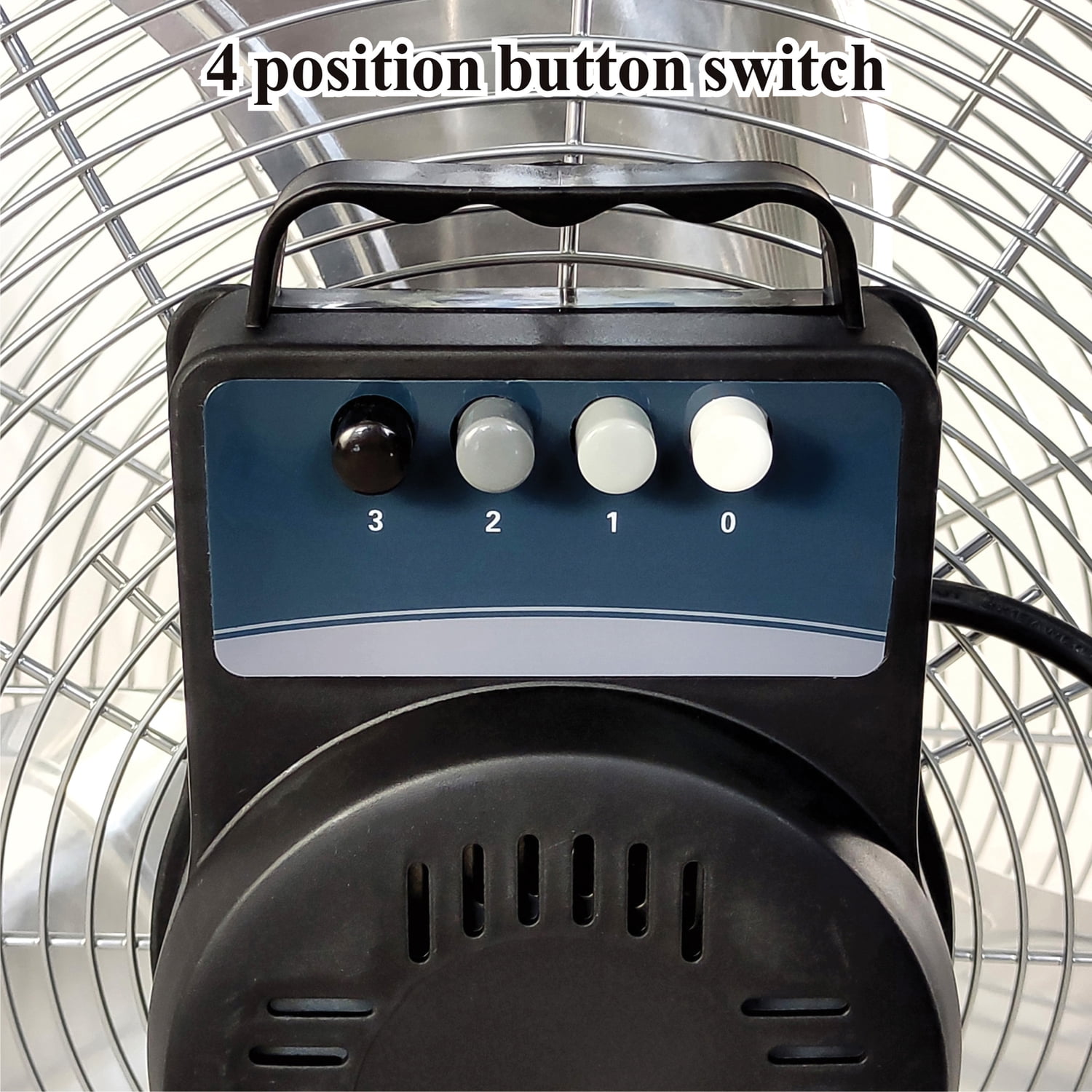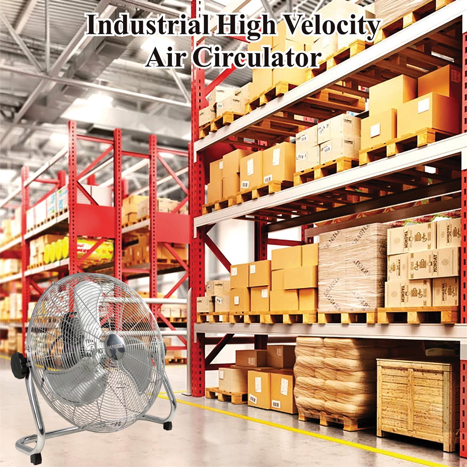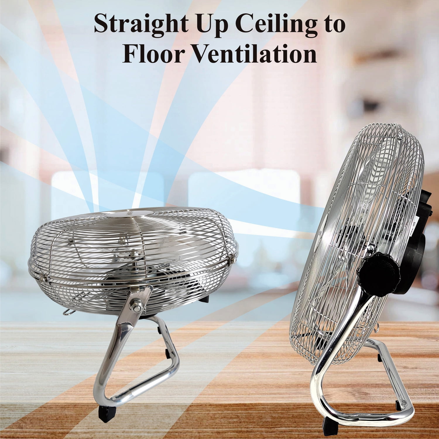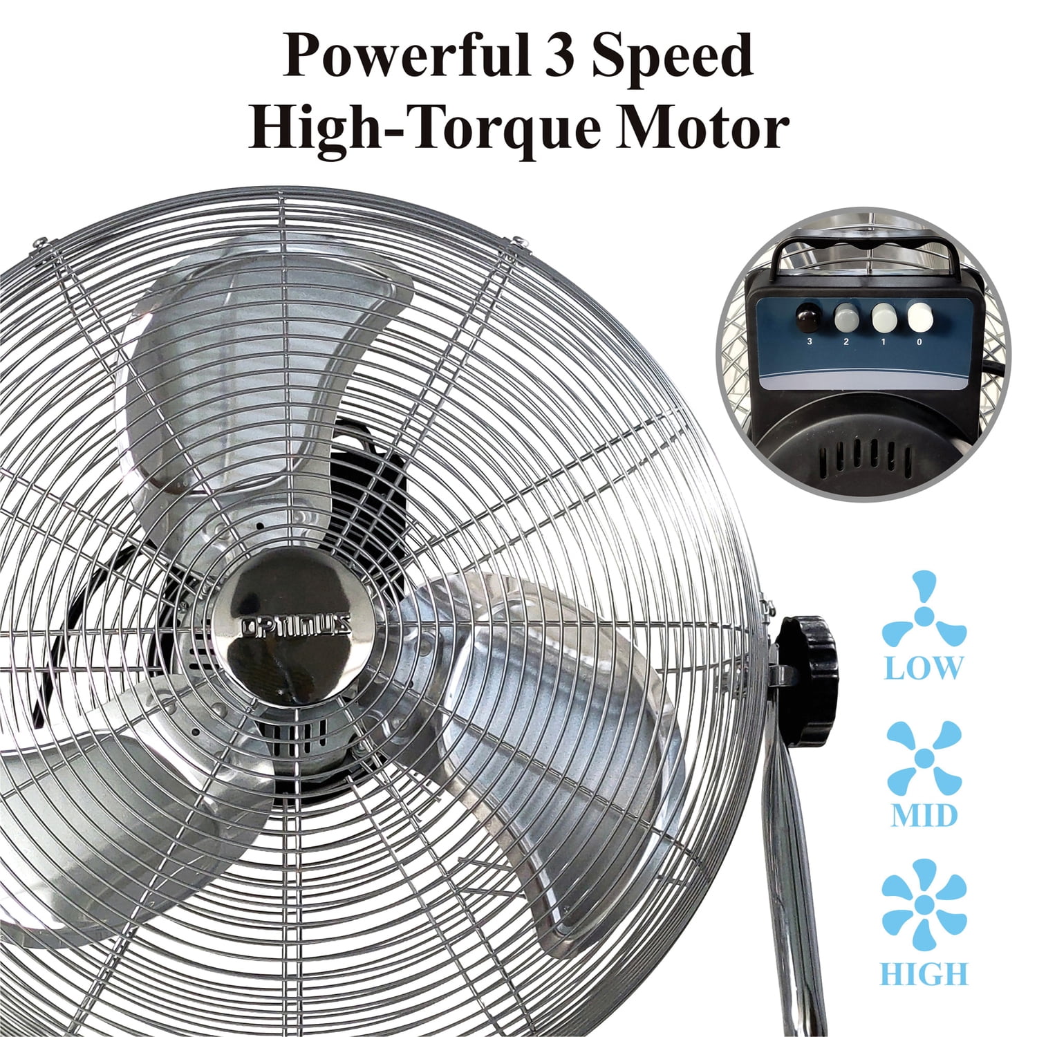 High-torque motor with 3 powerful fan speeds; 4-position rotary switch All-metal construction with heavy-duty aluminum blade; reinforced, circular chrome wire grille for added safety; ideal for industrial settings as well as any area that needs to move high volumes of air Fan head tilts 360 for use as air circulator; can also point straight up for floor to ceiling ventilation Sturdy base stabilizes operation 3-prong SPT2 plug on power cord ETL/Intertek listed