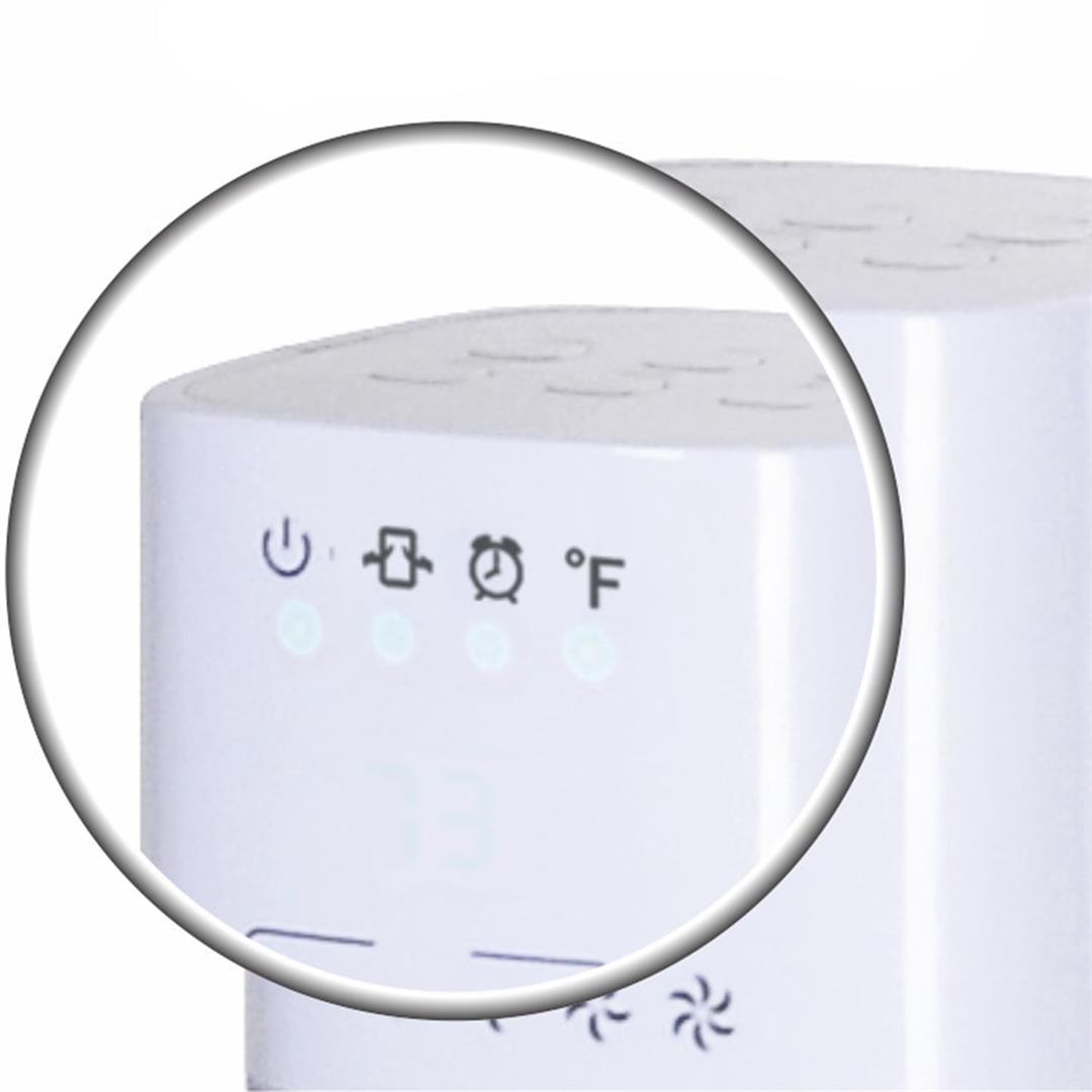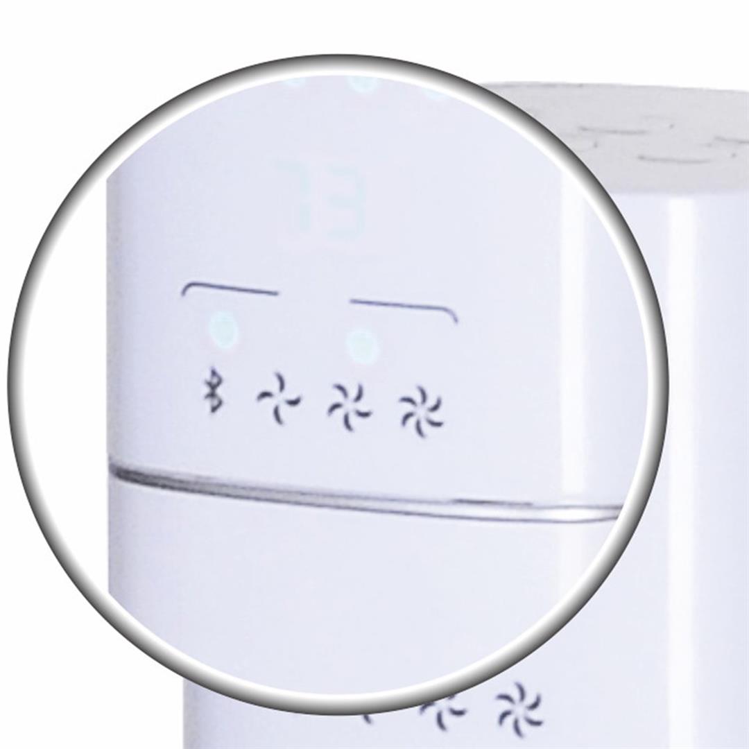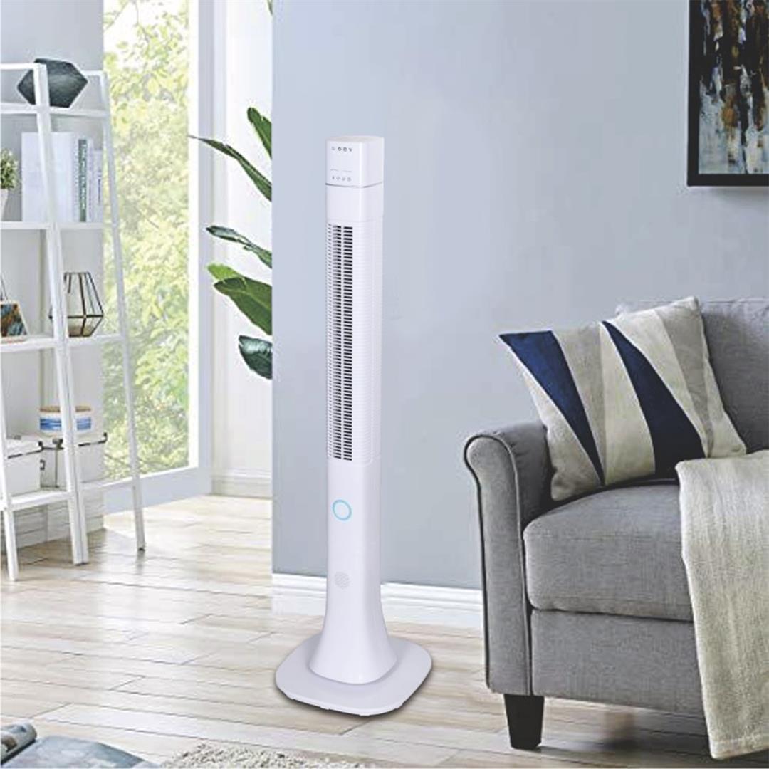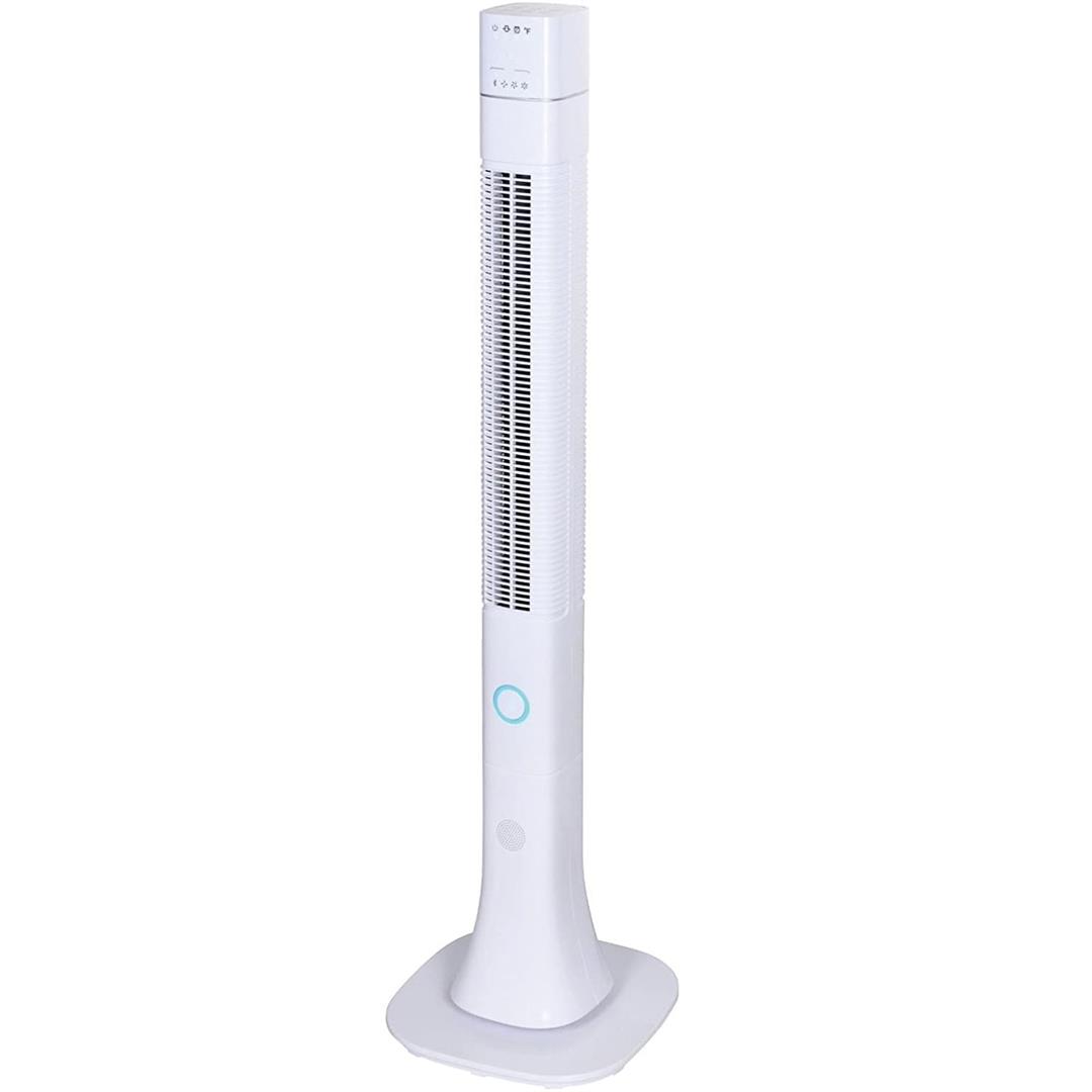 Sleek portable tower fan oscillates to keep you cozy and cool all year long Simple touch buttons on the base allow for ease of use and the included remote helps with long-range control Energy-saving motor with 3 air speeds provides whisper-quiet, powerful cooling for your home or office, all while reducing your energy bill 12-hour timer will automatically shut down so you can enjoy peace and quiet while sleeping, studying, or working from home Integrated Bluetooth speaker lets you listen to music or podcasts, adding entertainment and ambiance to any room LED display and night light makes reading the temperature or walking around in the dark a breeze 75-degree air oscillation covers all nooks and corners of your space, helping your rooms stay well ventilated Slim and compact design is great for small areas like a workshop or studio apartment Color: White Dimensions [L x W x H]: 12.6 x 12.6 x 47.3 inches Weight: 10.3 pounds Manufacturer warranty: 1-year warranty Sleek portable tower fan oscillates to keep you cozy and cool all year long Simple touch buttons on the base allow for ease of use and the included remote helps with long-range control Energy-saving motor with 3 air speeds provides whisper-quiet, powerful cooling for your home or office, all while reducing your energy bill 12-hour timer will automatically shut down so you can enjoy peace and quiet while sleeping, studying, or working from home Integrated Bluetooth speaker lets you listen to music or podcasts, adding entertainment and ambiance to any room LED display and night light makes reading the temperature or walking around in the dark a breeze 75-degree air oscillation covers all nooks and corners of your space, helping your rooms stay well ventilated Slim and compact design is great for small areas like a workshop or studio apartment Color: White Dimensions (L x W x H): 12.6 x 12.6 x 47.3 inches Weight: 10.3 pounds Manufacturer warranty: 1-year warranty