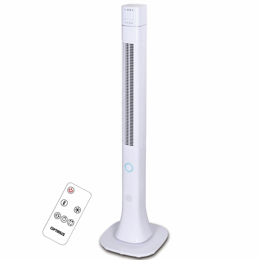On a blistering summer day, stay cool and refreshed with the Optimus 3-Speed Oscillating Portable Tower Fan. Enjoy a crisp breeze while taking a nap or after finishing yard work with this powerful and energy-efficient floor fan. This oscillating tower has 3 air speeds that are so quiet you’ll forget the blower is running. Before dozing off, set the 12-hour timer to automatically power down, helping you save energy and sleep in peace. In the dark, the optional night light and LED temperature display make for easy viewing. At 48 inches tall, this compact floor fan fits perfectly in small spaces or corners, and the lightweight frame can easily be moved to any room of your house. Control this cooling unit from the comfort of your couch by tapping the included remote. Electronic touch buttons on the base also let you adjust the fan’s settings. 75-degree oscillation helps keep you sweat-free while sipping drinks with buddies on the patio or while watching sports in the garage. Rock out to your favorite playlist thanks to the integrated Bluetooth speaker. Whether you’re tinkering in your workshop or partying at home, beat the heat with the 3-Speed Oscillating Portable Tower Fan by Optimus.
