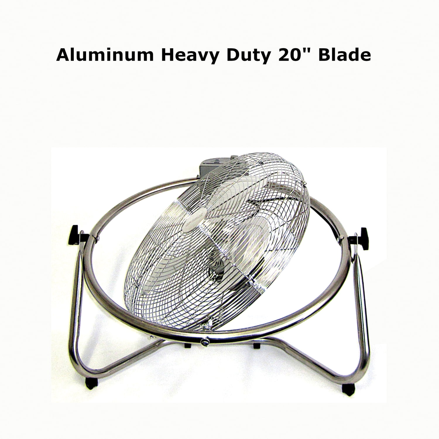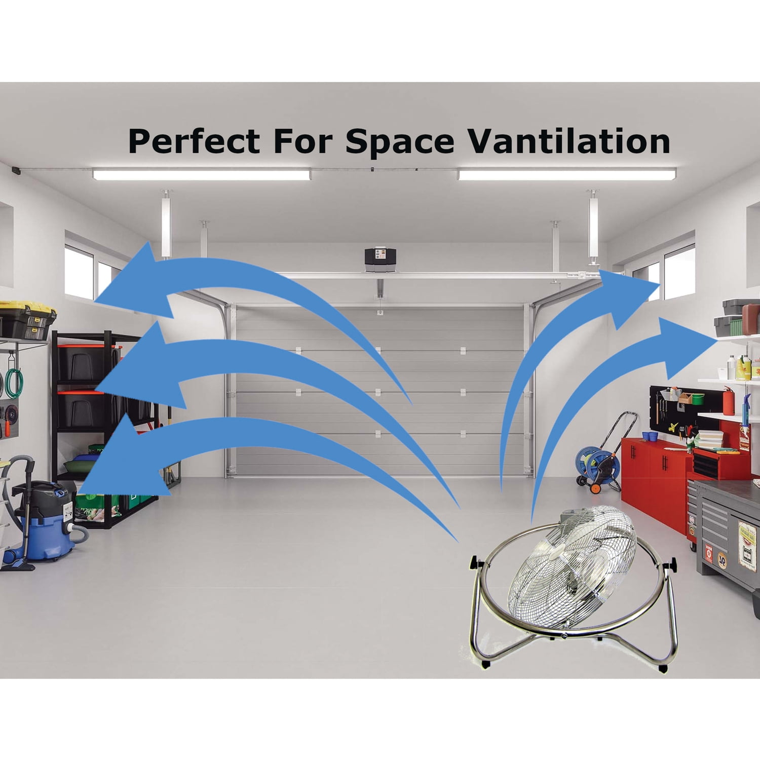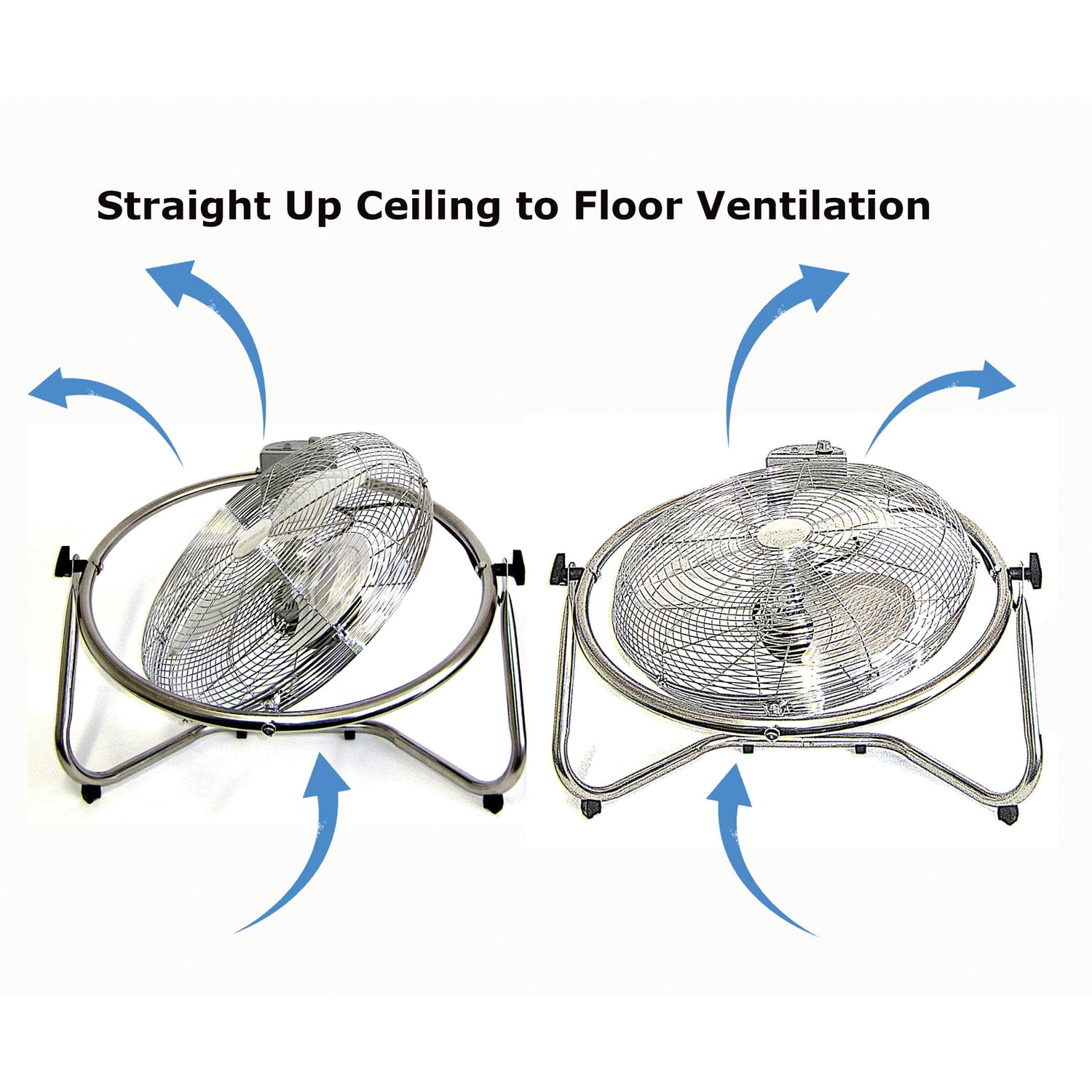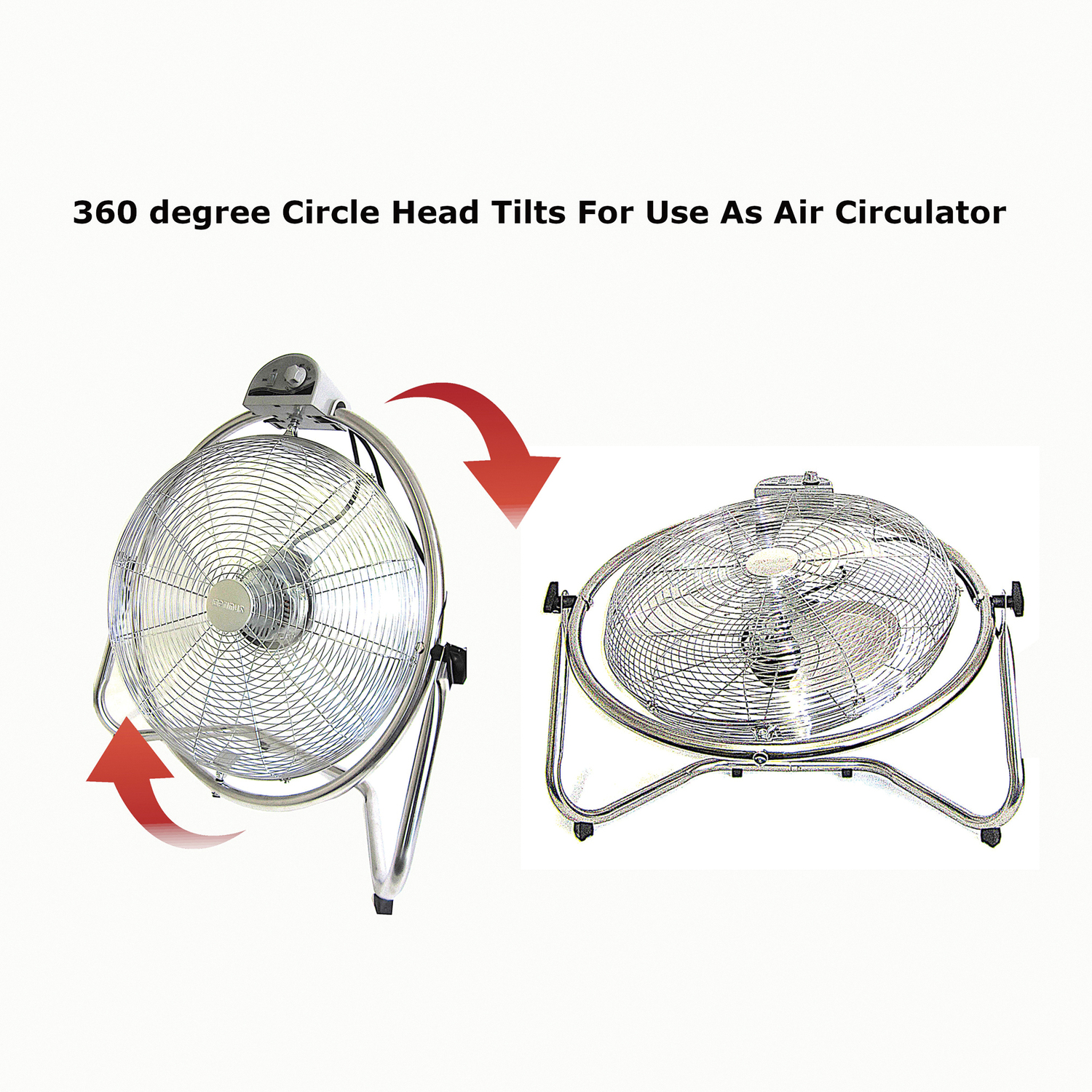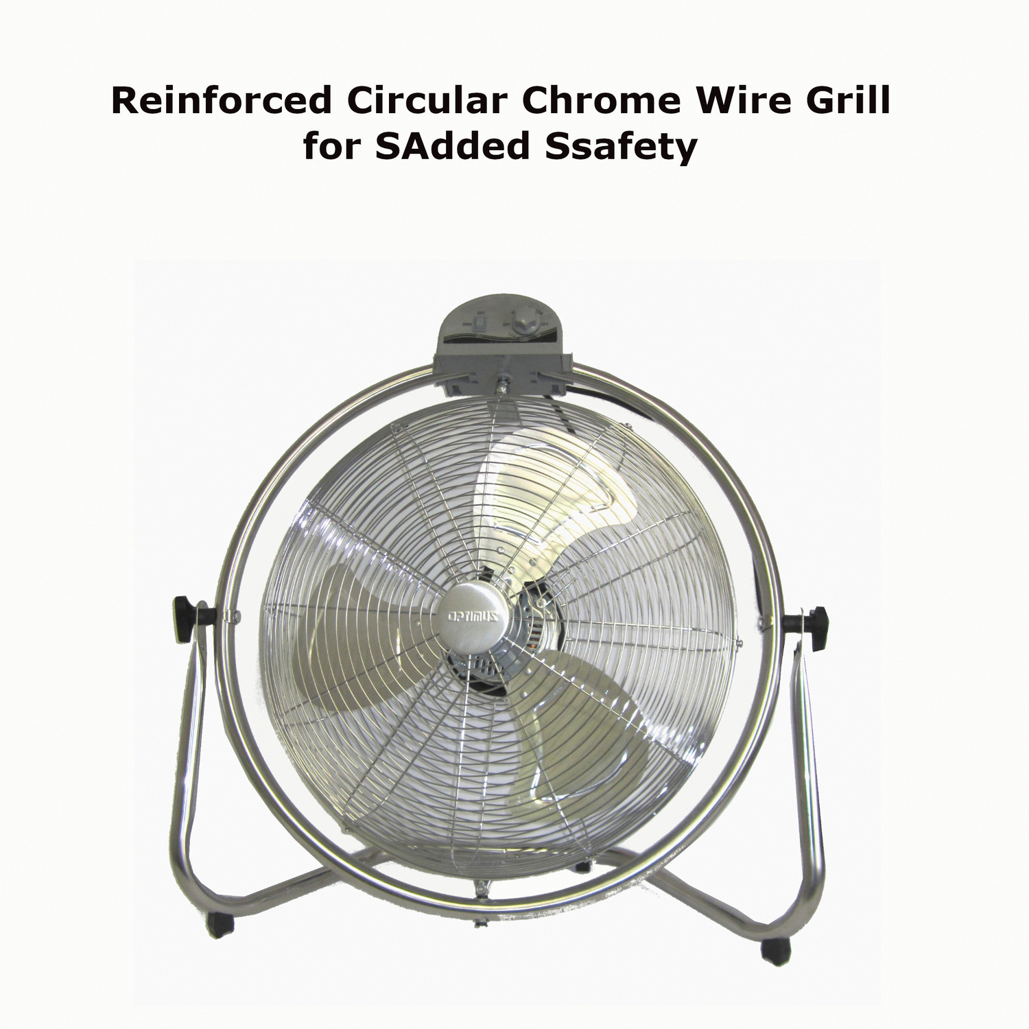High-torque motor with 3 powerful fan speeds; rotary speed switch with multiple speed positions and rocker on/off oscillation All-metal construction with heavy-duty aluminum blade; reinforced, circular chrome wire grille for added safety; ideal for industrial settings as well as any area that needs to move high volumes of air 75 of oscillation; fan head tilts 360 for use as air circulator; can also point straight up for floor to ceiling ventilation Sturdy base stabilizes operation 3-prong SPT2 plug on power cord ETL/Intertek listed