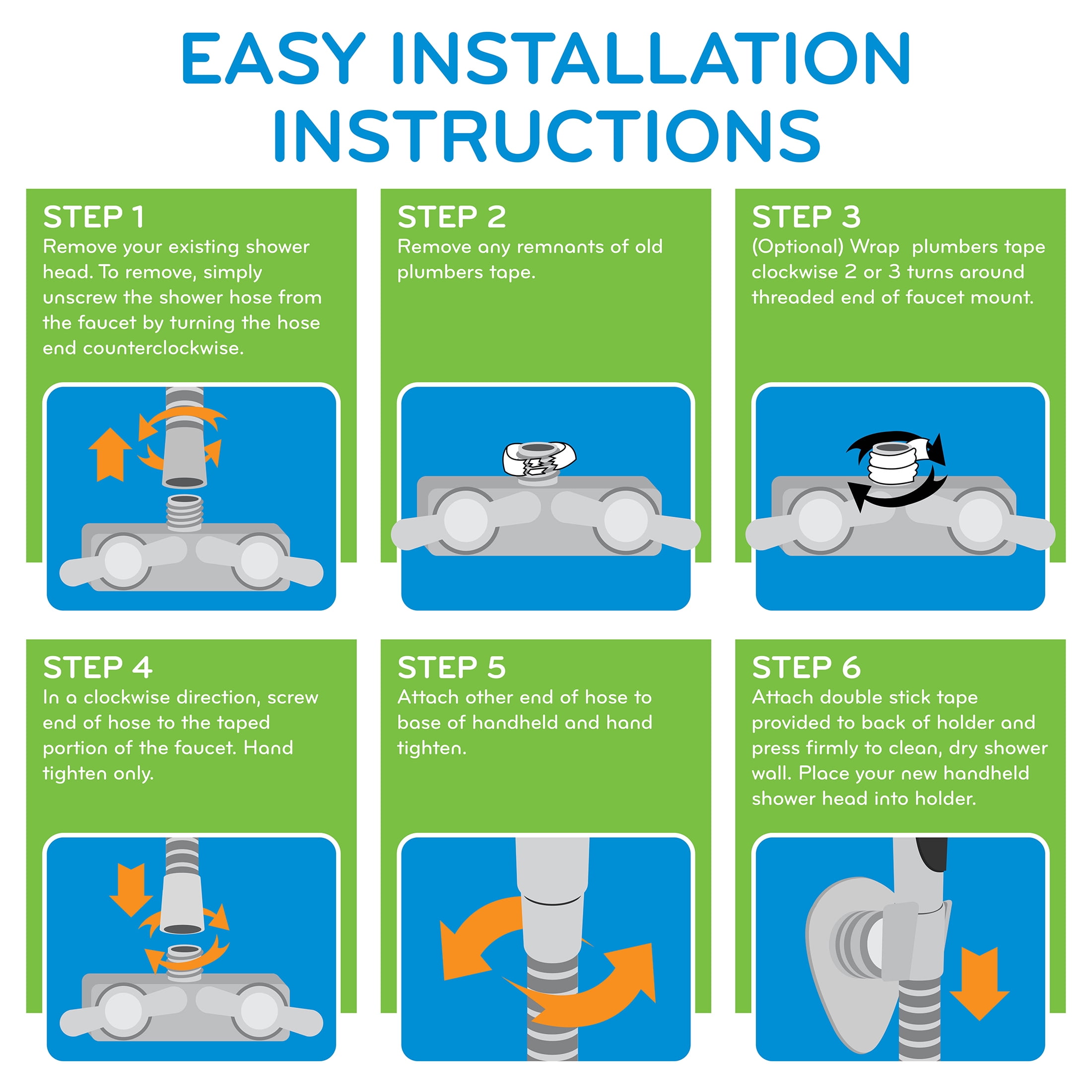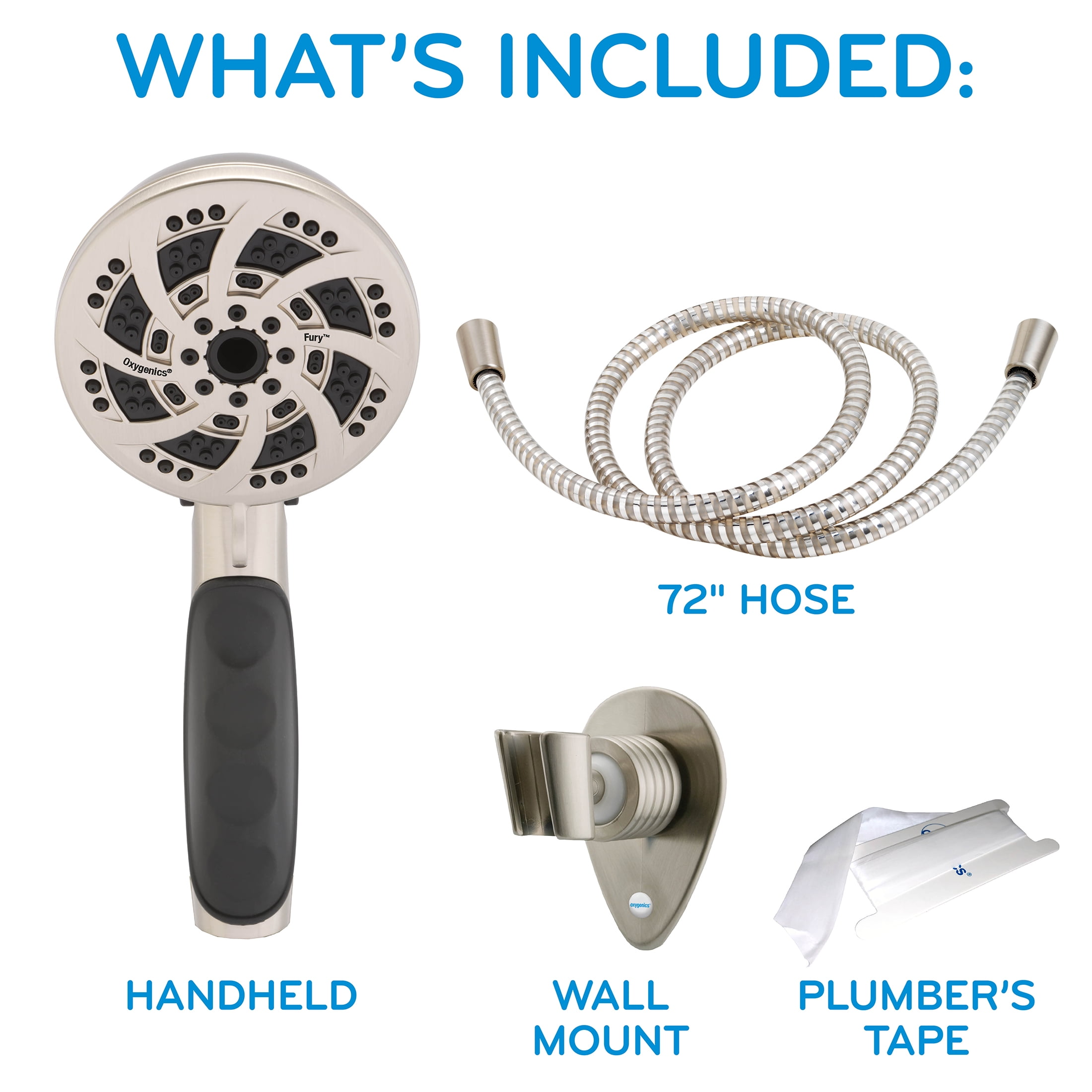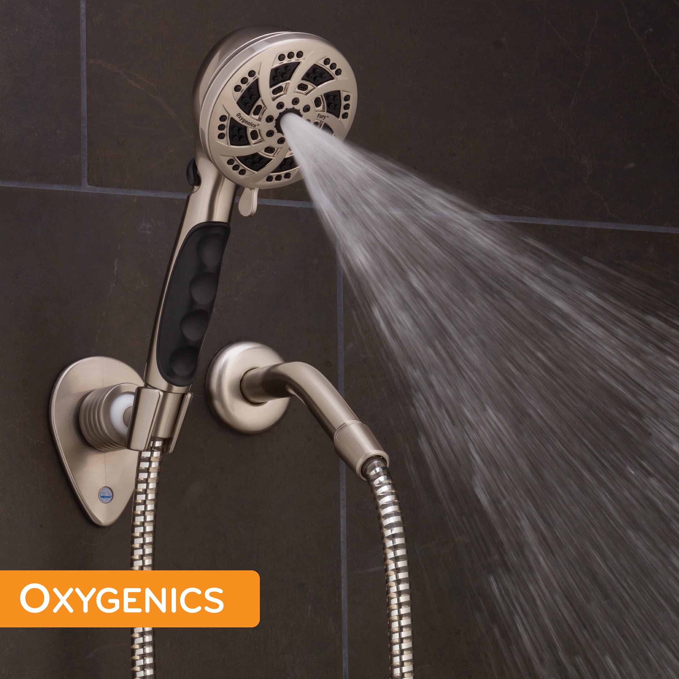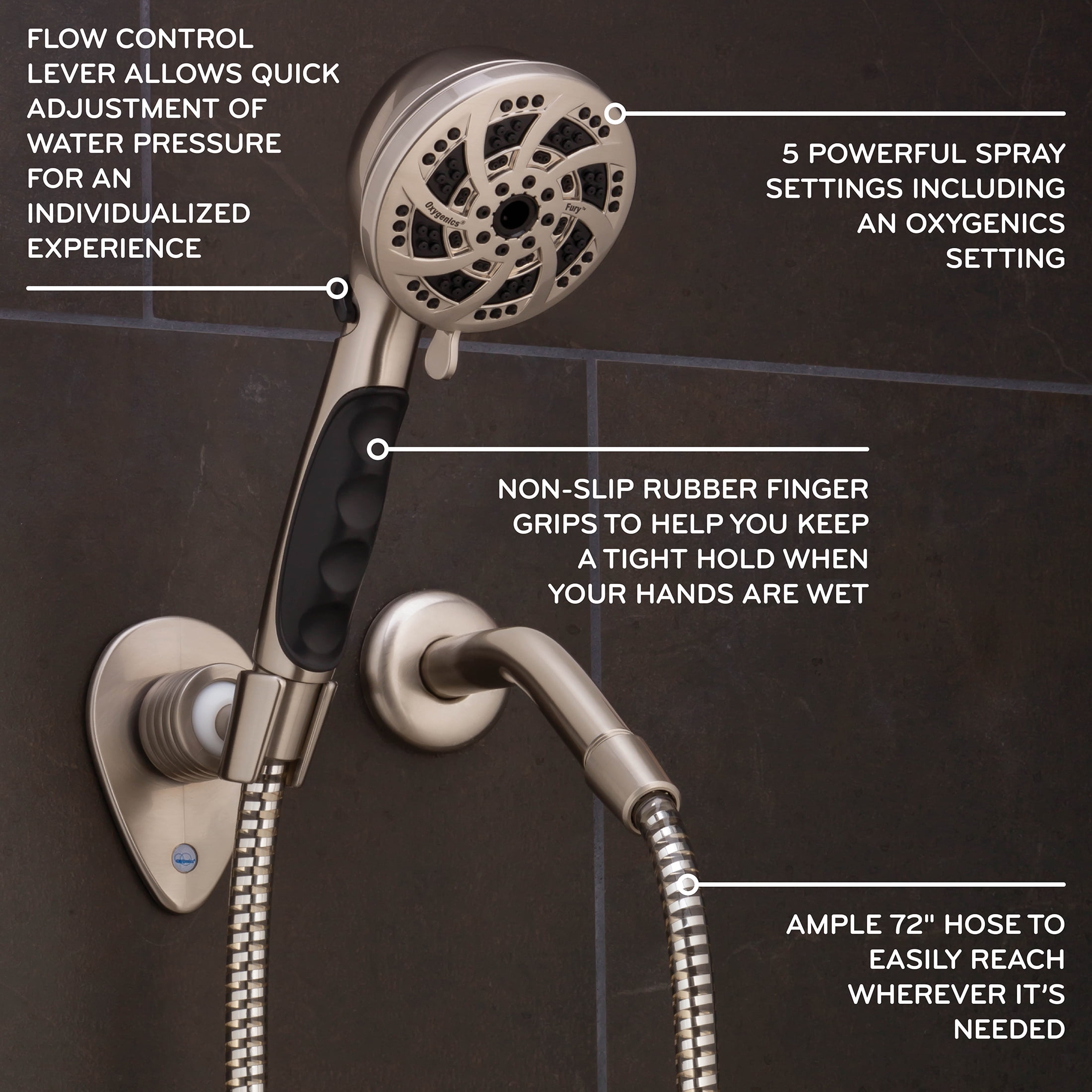5-Settings, including an Oxygenics setting powered by the Oxygenics engine Rubber finger grip prevents any slipping or dropping Flow control lever quickly adjusts shower pressure for a more versatile experience and extends tank use Includes a 72-inch hose to easily reach anywhere in the shower Customize placement with included wall mount for the perfect height Saves up to $125+ per year on water and energy costs Non-stick internal parts prevent clogging or corrosion for consistent performance