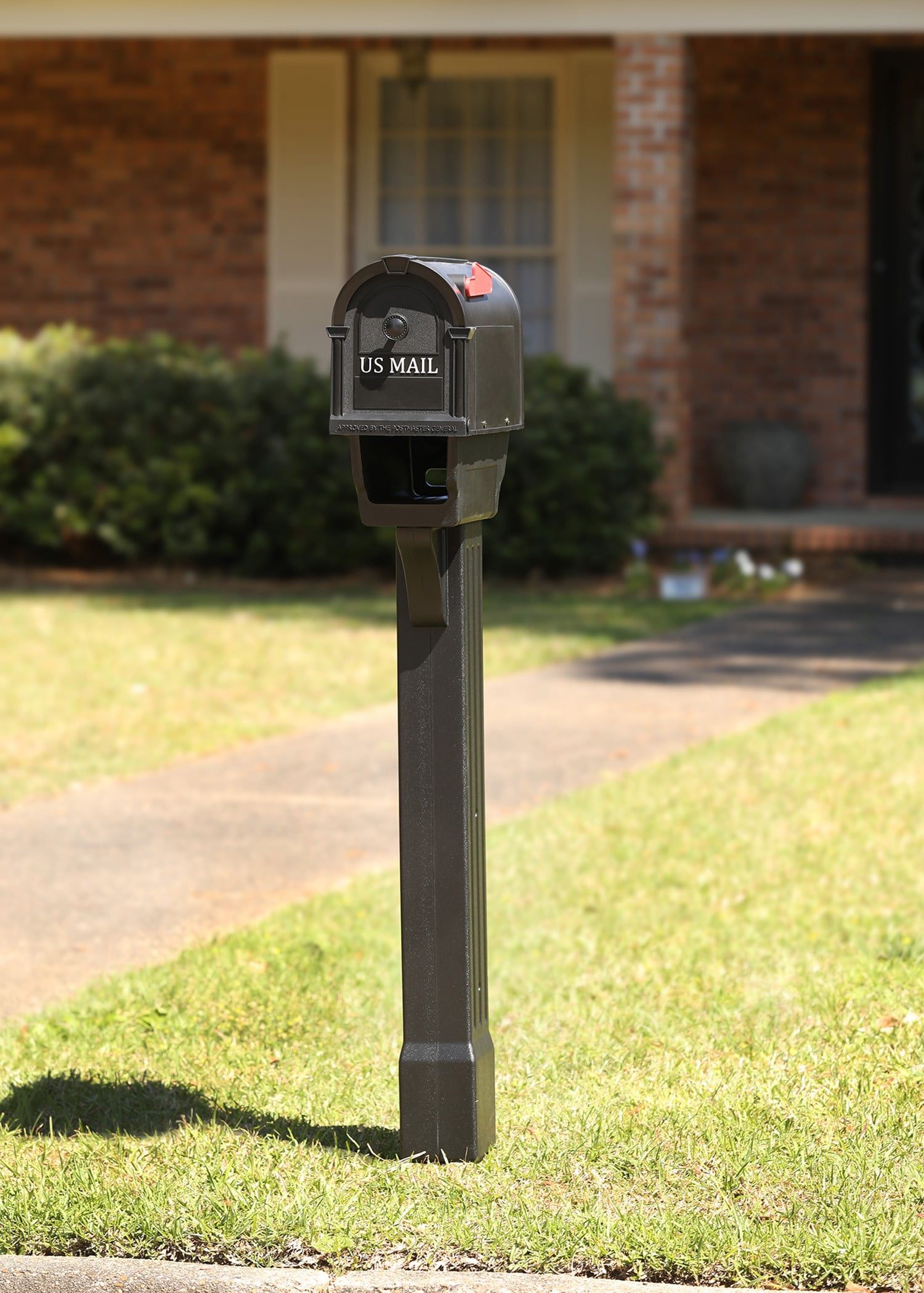 The Hampton Black Mailbox and Post Kit are constructed of high density plastic for lasting durability. The kit includes an attractive mailbox with highlighted “U.S. Mail” lettering on the door, a newspaper port, and a post sleeve that slides over a new or existing 4 in. x 4 in. x 48 in. treated pine post (not included). The mailbox also has 30% more capacity than standard mailboxes making it both roomy and stylish. Instant curb appeal will be achieved when you install the Hampton Black Mailbox and Post Kit.