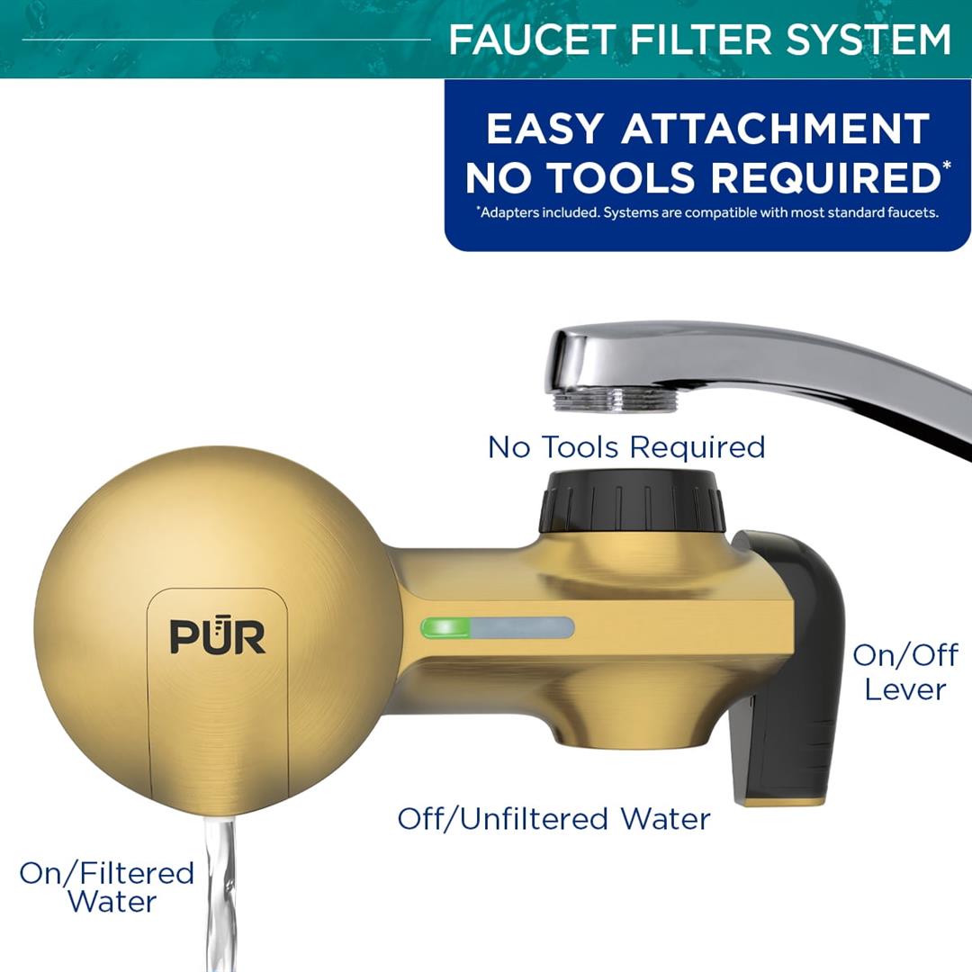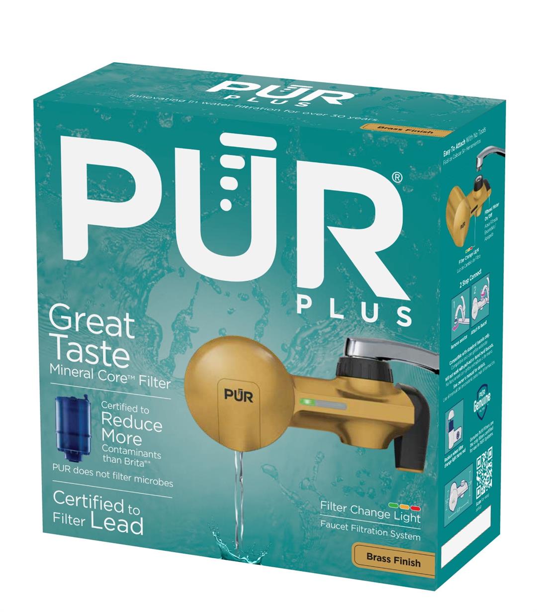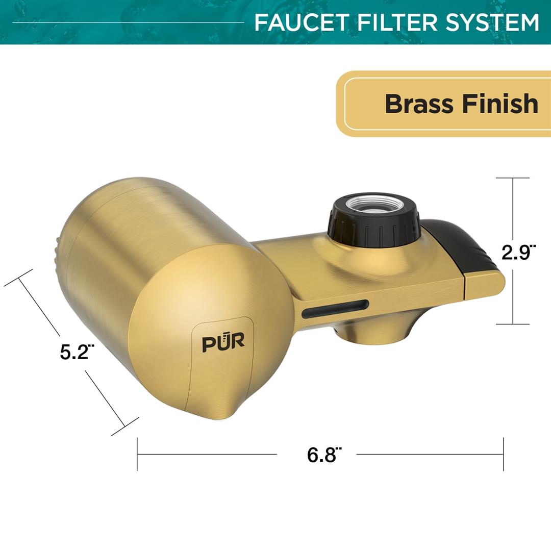 The PUR PLUS Horizontal Faucet Mount Water Filtration System in Brass (PFM410F) has been engineered to deliver superior water filtration directly from your water faucet. Have confidence in your drinking water with PUR’s powerful 3-in-1 filtration technology that reduces 10x more chemical & physical substances than Brita’s leading pitcher filter.* As the #1 selling brand in faucet filtration, PUR has been trusted for over 35 years because of its rigorous water filtration standards and certifications. PUR is the only faucet filter brand certified by WQA and NSF to reduce 70 chemical & physical substances, including lead, from your drinking water. In addition to having confidence in cleaner, better-tasting drinking water, PUR has also engineered its PUR PLUS Faucet Mount Water Filtration System to be easy to use. No tools are necessary, simply thread the PUR PLUS Faucet Mount Water Filtration system on to your faucet for cleaner water, on demand. It is also equipped with an on/off lever so you can easily switch from non-filtered water over to filtered water. A filter change light ensures you’ll always know when it’s time to change your Genuine PUR PLUS Faucet Mount Replacement Filter. Remember, compatible doesn’t mean comparable. Only Genuine PUR Faucet Mount Replacement Filters are certified to work with the PUR PLUS Horizontal Faucet Mount Water Filtration System in Brass. Engineered for superiority, PUR believes that everyone deserves cleaner, better-tasting drinking water. Product dimensions: 6.8″ L x 5.2″ W x 2.9″ H Disclaimers: *Versus best-selling Brita pitcher filter OB03. Brita is a trademark of Brita LP. Based on comparing a years worth of bottled water (16.9 oz) to a PUR system and 3 filters. Adapters included. Systems are compatible with most standard faucets. Based on Nielsen sales data for the 52 weeks ending 7/1/23. Like other leading brands, PUR does not filter microbes. As of 7/1/23 Brita and ZeroWater were not certified to filter microbes. Brita is a trademark of Brita LP. ZeroWater is a trademark of Zero Technologies, LLC.