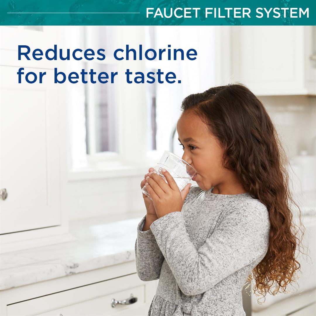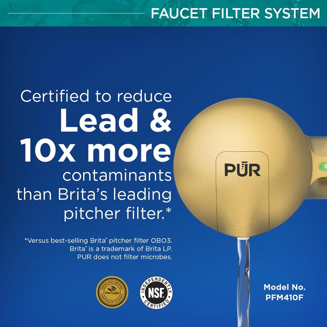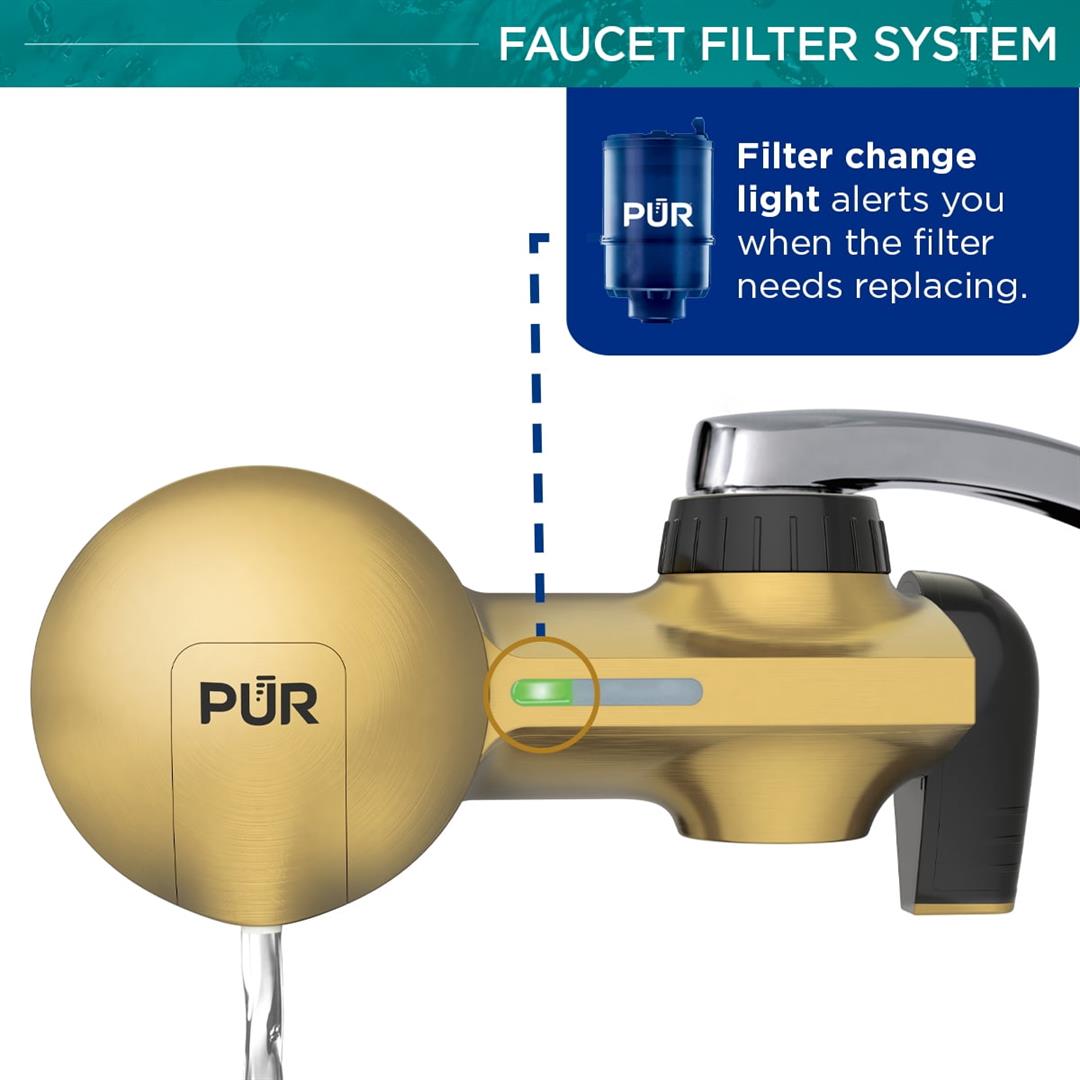 The PUR PLUS Horizontal Faucet Mount Water Filtration System in Brass (PFM410F) has been engineered to deliver superior water filtration directly from your water faucet. Have confidence in your drinking water with PUR’s powerful 3-in-1 filtration technology that reduces 10x more chemical & physical substances than Brita’s leading pitcher filter.* As the #1 selling brand in faucet filtration, PUR has been trusted for over 35 years because of its rigorous water filtration standards and certifications. PUR is the only faucet filter brand certified by WQA and NSF to reduce 70 chemical & physical substances, including lead, from your drinking water. In addition to having confidence in cleaner, better-tasting drinking water, PUR has also engineered its PUR PLUS Faucet Mount Water Filtration System to be easy to use. No tools are necessary, simply thread the PUR PLUS Faucet Mount Water Filtration system on to your faucet for cleaner water, on demand. It is also equipped with an on/off lever so you can easily switch from non-filtered water over to filtered water. A filter change light ensures you’ll always know when it’s time to change your Genuine PUR PLUS Faucet Mount Replacement Filter. Remember, compatible doesn’t mean comparable. Only Genuine PUR Faucet Mount Replacement Filters are certified to work with the PUR PLUS Horizontal Faucet Mount Water Filtration System in Brass. Engineered for superiority, PUR believes that everyone deserves cleaner, better-tasting drinking water. Product dimensions: 6.8″ L x 5.2″ W x 2.9″ H Disclaimers: *Versus best-selling Brita pitcher filter OB03. Brita is a trademark of Brita LP. Based on comparing a years worth of bottled water (16.9 oz) to a PUR system and 3 filters. Adapters included. Systems are compatible with most standard faucets. Based on Nielsen sales data for the 52 weeks ending 7/1/23. Like other leading brands, PUR does not filter microbes. As of 7/1/23 Brita and ZeroWater were not certified to filter microbes. Brita is a trademark of Brita LP. ZeroWater is a trademark of Zero Technologies, LLC.