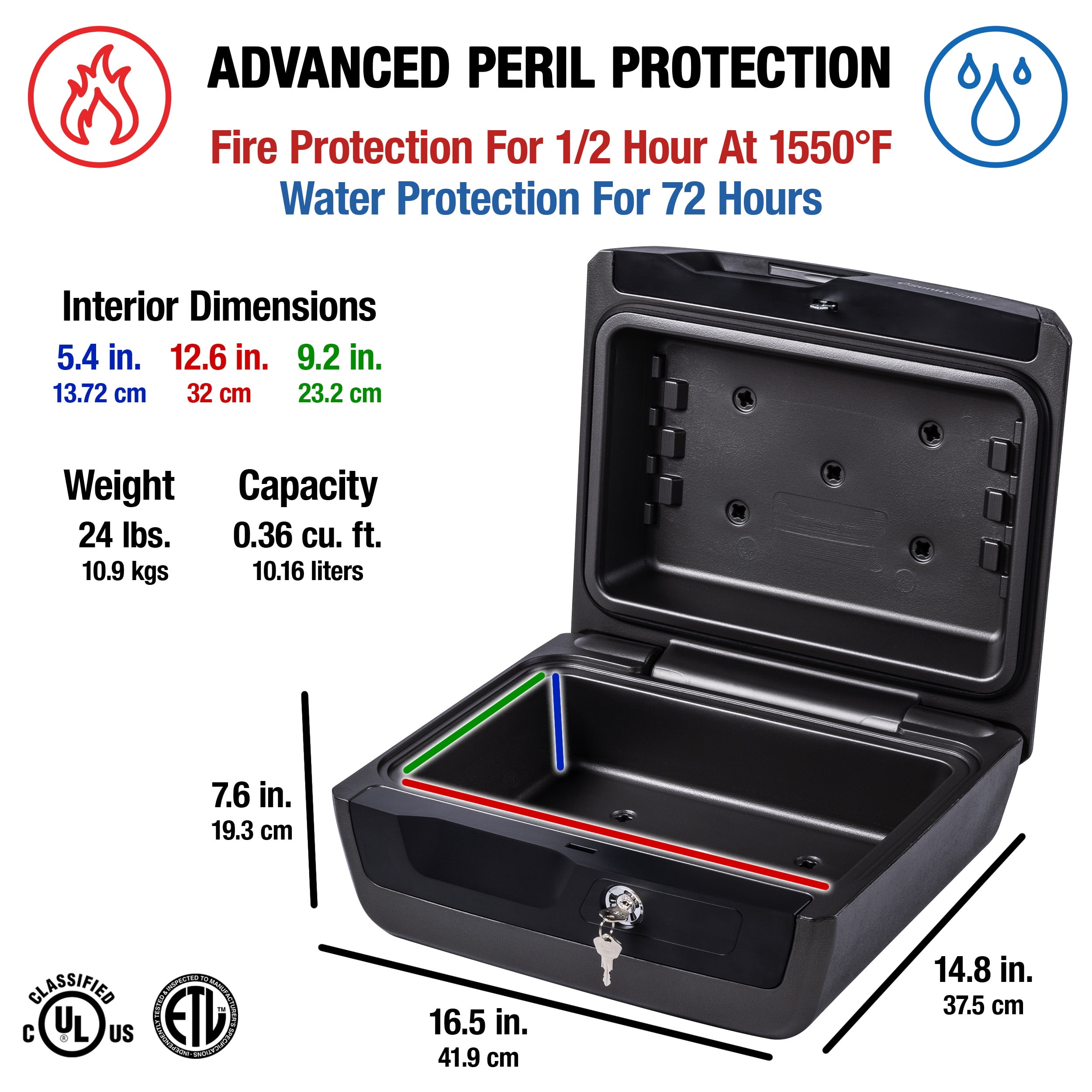 Safe Box, fire-resistant and water-resistant, keeps important papers, digital media and other valuables secure and protected from fire and flood and comes equipped with convenient carrying handle Fire safe box is UL classified for fire endurance (1/2 hour at 1550F) to protect documents and valuables; ETL verified (1/2 hour at 1550F) to protect CDs, DVDs, memory sticks and USB drives ETL verified for water submersion to protect against flood damage up to 72 hours Fire resistant safe has a tubular key lock for added security and to prevent the lid from opening in the event of fire; includes two keys Built-in straps for easy storage of passports and other documents. Safety box holds A4 size paper flat; Dimensions: Exterior – 7.6 in H X 14.8 in D X 16.5 in W, Interior – 5.4 in H X 9.2 in D X 12.6 in W