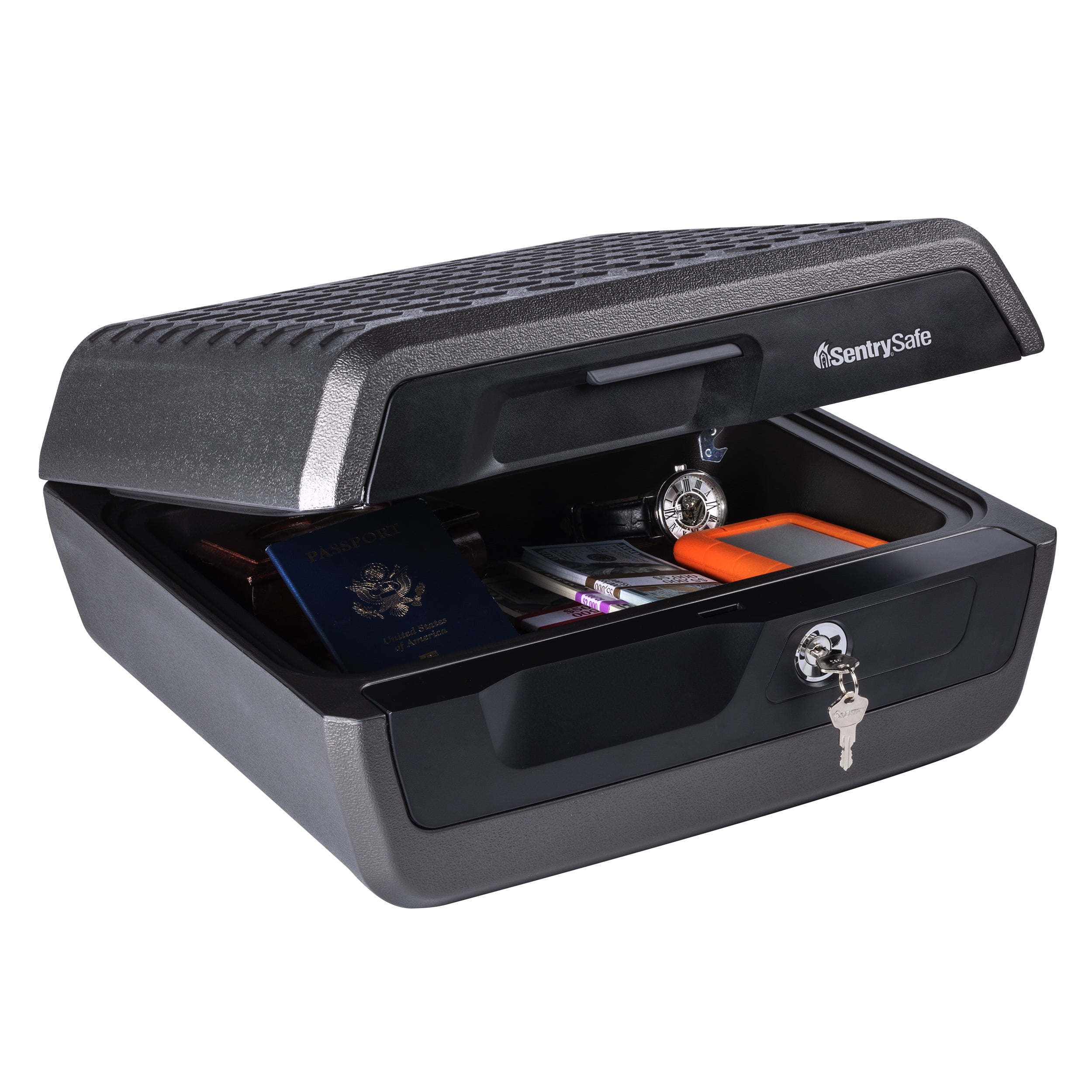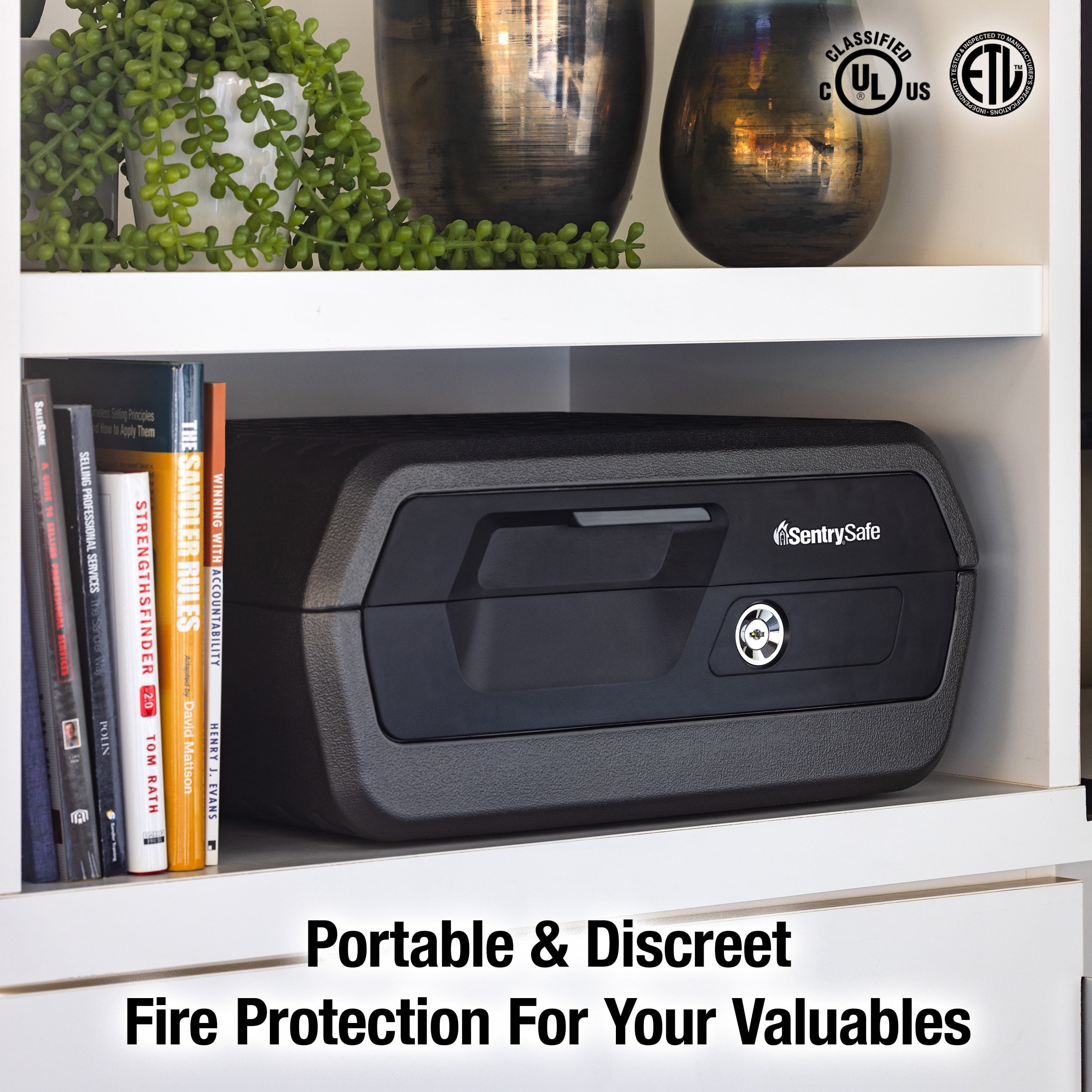 The SentrySafe CHW30100 is a robust and reliable safe designed to offer superior protection against the elements, making it an indispensable addition to your home or office security measures. Constructed with durable fireproof and waterproof materials, this safe ensures your valuables remain secure under adverse conditions. It boasts a UL classification to withstand fires up to 1550F (843C) for half an hour, and its ETL verification assures 72 hours of water protection. Its spacious interior comfortably accommodates essential documents and digital media, while the key lock provides an added layer of security for sensitive items. Compact yet spacious, the safe fits conveniently in discreet locations such as closets or under beds. The exterior dimensions measure 7.6 inches in height, 16.5 inches in width, and 14.8 inches in depth, while the interior dimensions are 5.4 inches in height, 12.6 inches in width, and 9.2 inches in depth, offering a storage capacity of 0.36 cubic feet with a weight of 24 pounds.