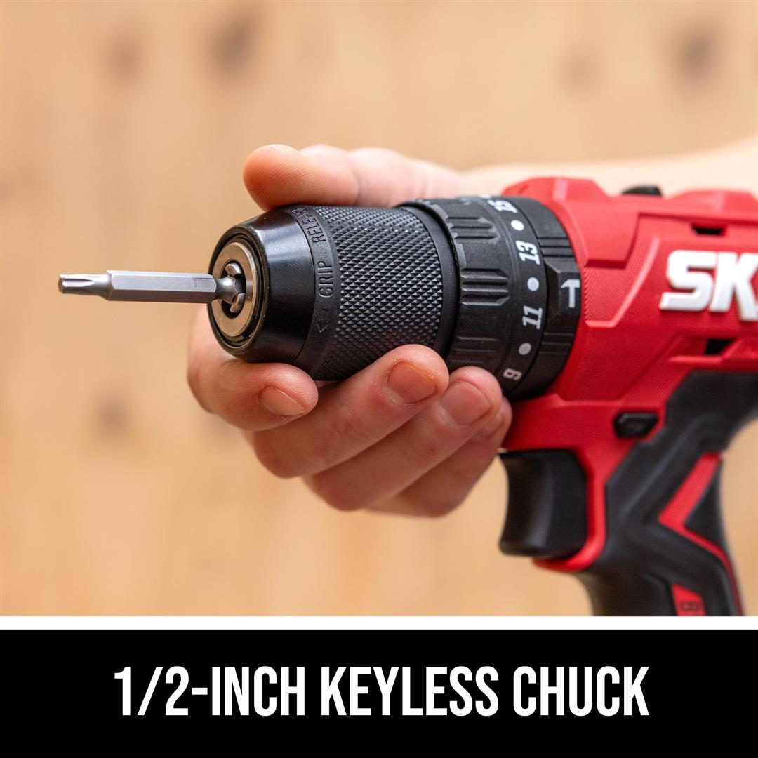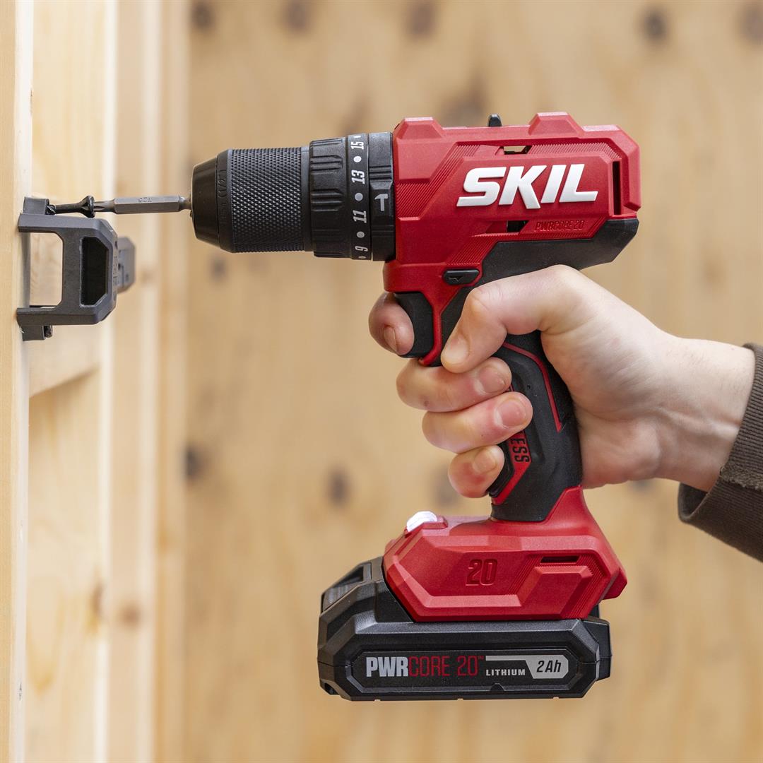 Reach for the SKIL 20V Brushless Hammer Drill when drilling pilot holes into masonry and driving screws whether youre remodeling your basement, installing a mailbox, or adding a flag mount to a brick wall. This cordless hammer drill features a digital brushless motor that delivers up to 400-inch pounds of torque and up to 25,500 IPM, with 17 torque settings for various driving and drilling applications. Easily transition between hammer drill, drill, and screwdriver modes, and quickly change bits with the -inch single-sleeve keyless ratcheting chuck. The 20V hammer drill includes a bonus 75-piece bit set of commonly used bits for drilling and driving packed into an interlocking case that snaps onto the larger suitcase-style hammer drill carrying case. The hammer drill kit includes the hammer drill, 20V 2.0Ah battery, 30W charger, and 75-piece drilling and driving bit set.