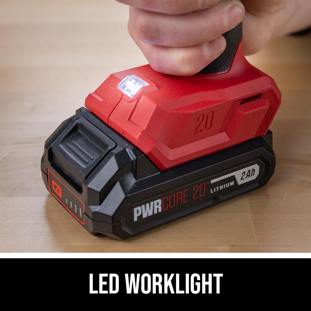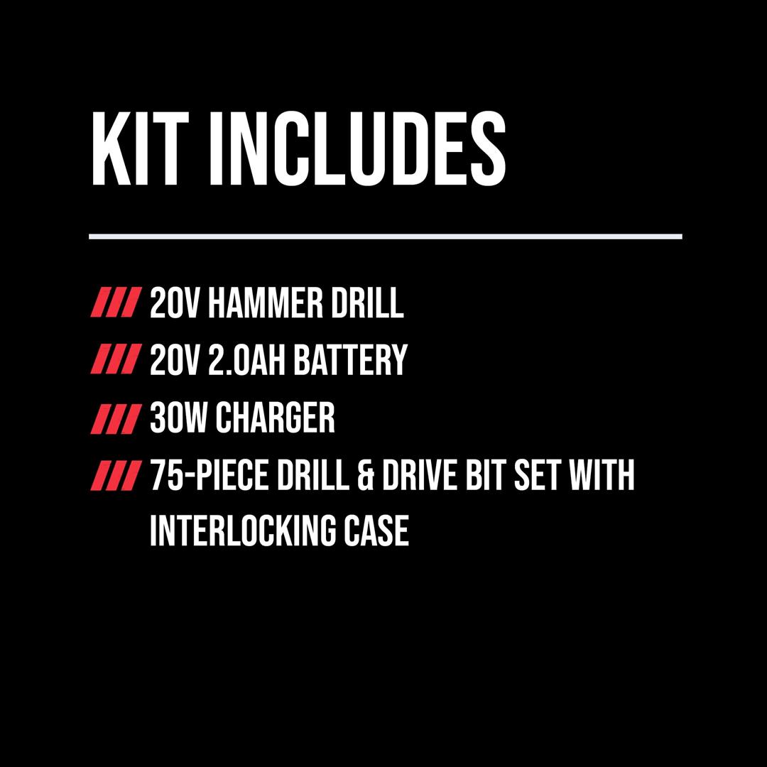 CORDLESS HAMMER DRILL SET INCLUDES 20V hammer drill, 2.0Ah battery, 30W charger, and 75-piece drill & drive bit set with interlocking case BONUS 75-PIECE BIT SET INCLUDED – Bit kit includes 75 commonly used drilling & driving bits; bit case interlocks with suitcase-style carrying case containing hammer drill set DIGITAL BRUSHLESS MOTOR Delivers high performance with up to 400 inch-pounds of torque and extended tool life 1/2-INCH KEYLESS RATCHETING CHUCK – For fast, easy bit changes LED WORKLIGHT – With pre-light and afterglow for maximum visibility THREE TOOLS IN ONE Easily transition between hammer drill, drill, and screwdriving modes