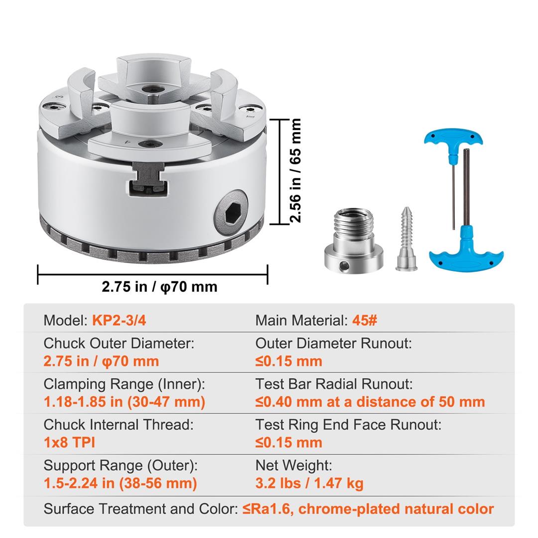 Product Description SKYSHALO Lathe Chuck Experience the exceptional craftsmanship of this SKYSHALO lathe chuck. With its innovative and refined design, it offers unparalleled stability and dependability. The compact and efficient construction ensures effortless operation and increased convenience, allowing users to effortlessly grasp its usage techniques. Unmatched Strength and Durability Introducing the SKYSHALO lathe chuck, a tool designed to securely hold and rotate workpieces for precise machining tasks. Crafted from high-strength #45 material, this exceptional product is built to withstand the rigorous demands of production environments. Manufactured using top-quality materials, our lathe chuck guarantees exceptional durability and long-lasting performance. Unparalleled Precision and Accuracy At SKYSHALO, we pride ourselves on the exquisite technological craftsmanship applied to the manufacturing process of our lathe chuck. Every step, from material selection to machining techniques, undergoes rigorous control and optimization. Through precision casting, meticulous machining, and skillful calibration processes, our lathe chuck achieves an alignment accuracy of 0.3 mm. Enhanced Flexibility for Optimal Efficiency The flexibility and convenience of a lathe chuck’s functionality are crucial for enhancing work efficiency. That’s why our SKYSHALO chuck features adjustable jaws, allowing operators to effortlessly expand and clamp the jaws using a T-handle wrench. This innovative design provides enhanced flexibility, enabling you to handle workpieces of various sizes and shapes with ease. Experience optimal efficiency and productivity with our versatile lathe chuck. Seamless User Experience Experience the ease of operation with the SKYSHALO lathe chuck. Meticulously crafted with a simple yet efficient structure, this chuck is widely favored for its straightforward design. With user-friendly controls, there’s no need for intricate training or specialized knowledge. Unmatched Versatility Our SKYSHALO chuck features an adjustable jaw design, providing unmatched versatility. With a T-handle wrench, operators can easily adjust the clamping range, accommodating workpiece sizes and shapes such as bowls, plates, vases, cups, and more. Wide Range of Applications No matter your field of expertise, the SKYSHALO lathe chuck is designed to meet your requirements. Whether you’re involved in woodworking, drilling, grinding, or other industries, our chuck’s broad adaptability ensures optimal performance. Enhance your processing efficiency, increase operational flexibility, and achieve accurate and stable machining outcomes with our reliable lathe chuck. Specifications Model: KP2-3/4 Chuck Outer Diameter: 2.75 inches / 70 mm Clamping Range (Inner): 1.18-1.85 inches (30-47 mm) Chuck Internal Thread: 1*8TPI Support Range (Outer): 1.5-2.24 inches (38-56 mm) Outer Diameter Runout: 0.15 mm Test Bar Radial Runout: 0.40 mm at a distance of 50 mm Test Ring End Face Runout: 0.15 mm Surface Treatment and Color: Ra1.6, chrome-plated natural color Main Material: 45# Net Weight: 3.2 pounds / 1.47 kg Product Dimensions: 70 x 65 mm Package Content 1 x T-Wrench 1 x Cone Screw 1 x T-Handle Wrench 1 x M33*3.5 Adapter 1 x Instruction Manual