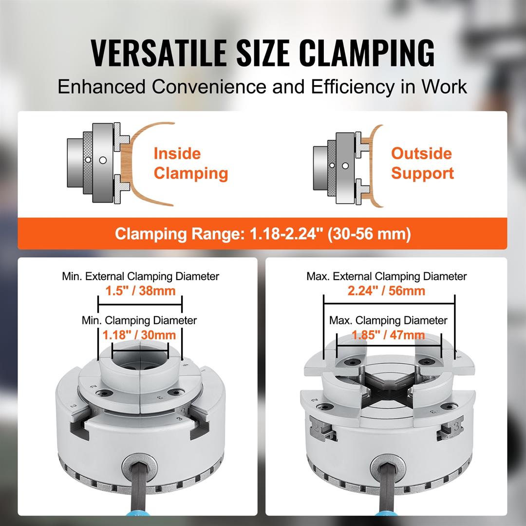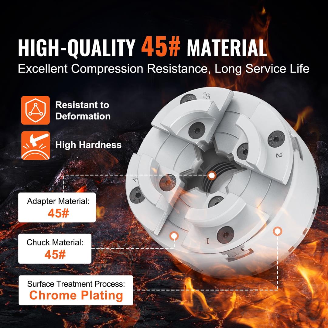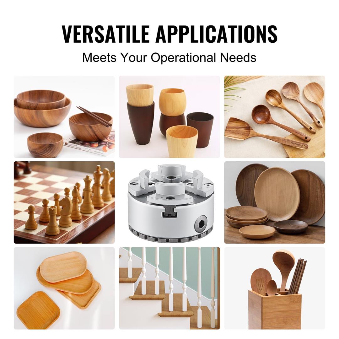 Exceptional Material: Our chuck is made from high-strength #45 material that has undergone quenching and hardening techniques. This ensures exceptional hardness and rust-resistant properties, making it perfect for both small and large workpieces. Precision Machining: We employ high-precision machining processes to ensure structural stability and machining accuracy. The refined bevel gear and three small gears aid in precise machining progress, guaranteeing excellent results. Enhanced Flexibility: Our chuck features an adjustable jaw design, allowing operators to easily adjust the clamping range using a T-handle wrench. It can accommodate various workpiece sizes and shapes with precise gripping and securing. Simplified Design: The chuck boasts a streamlined design that strikes the optimal balance between functionality and reliability. By eliminating unnecessary complex components and mechanical structures, the chuck becomes simple and compact. Installation and removal only require screws and handles, and clamping and spreading are achieved by rotating the T-handle wrench. Wide Range of Applications: Whether you’re involved in woodworking, drilling, grinding, or other fields, our chuck’s broad adaptability meets your requirements. Enhance processing efficiency, increase operational flexibility, and achieve accurate and stable machining outcomes with our reliable lathe chuck.