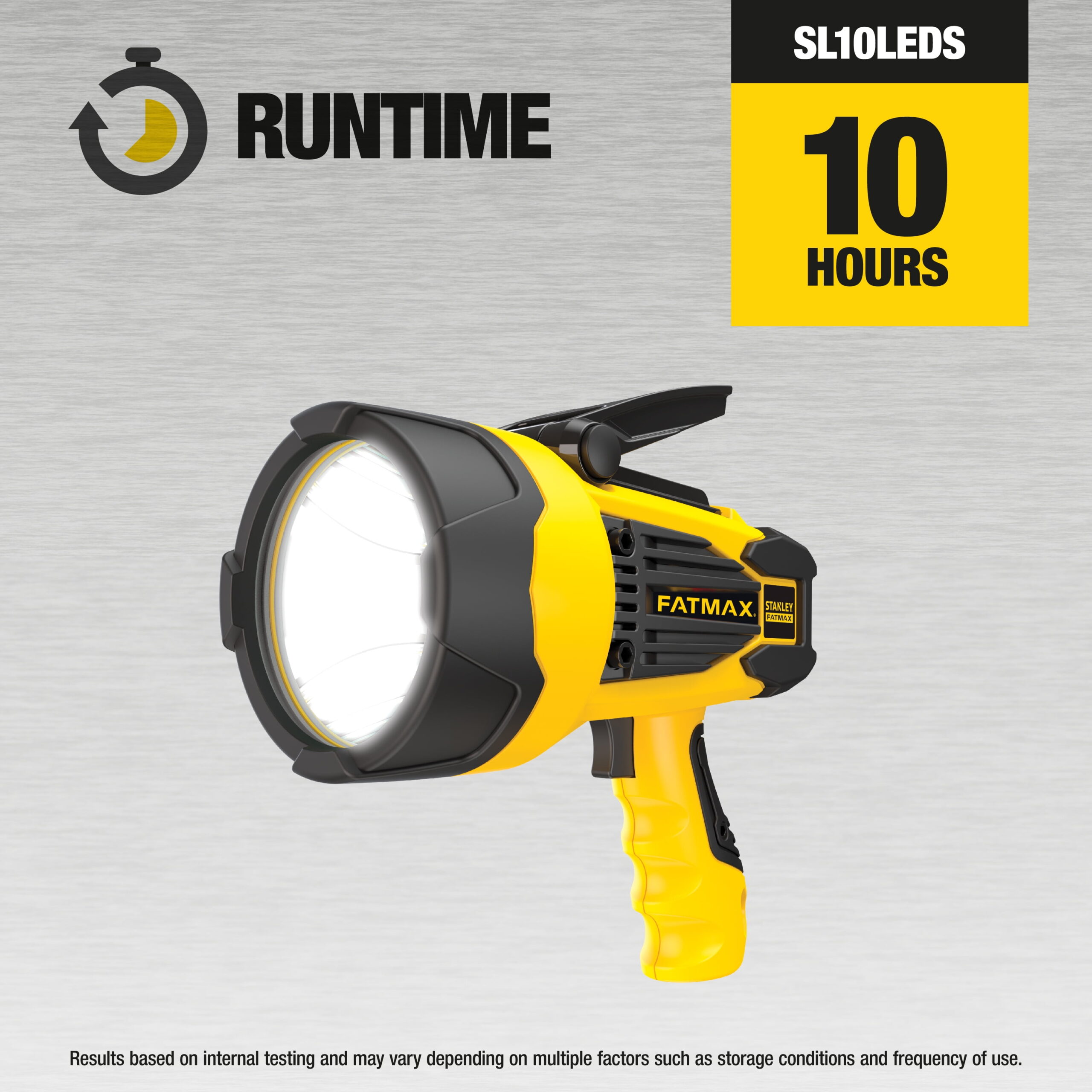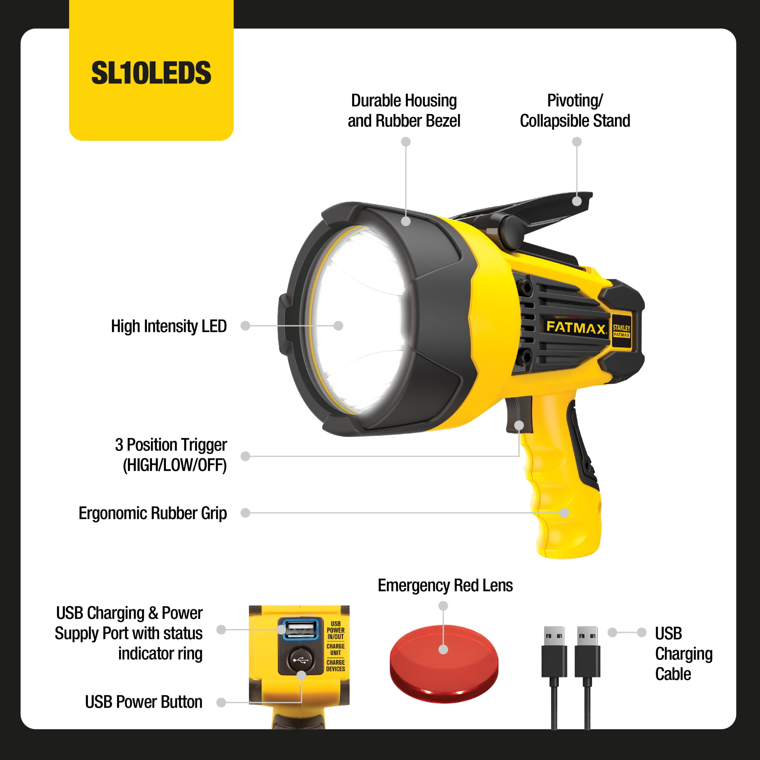 The STANLEY FATMAX SL10LEDS Lithium-Ion 2200 lumen LED Rechargeable Spotlight is a powerful and long-lasting indoor/outdoor spotlight Recharges personal Electronics with the patented 2 Way USB port that provides up to 1A USB output Rugged pistol-grip handle offers the user a comfortable grip, while the use of the locking pivoting stand and convenient trigger lock provides hands-free operation The Powerful LED provides a runtime of up to one hour on high and seven hours on low, while the lithium-ion technology allows for up to 12 months without recharging