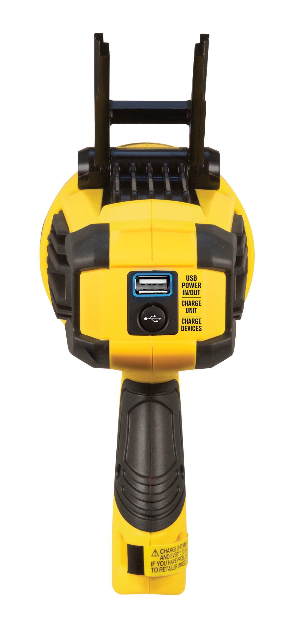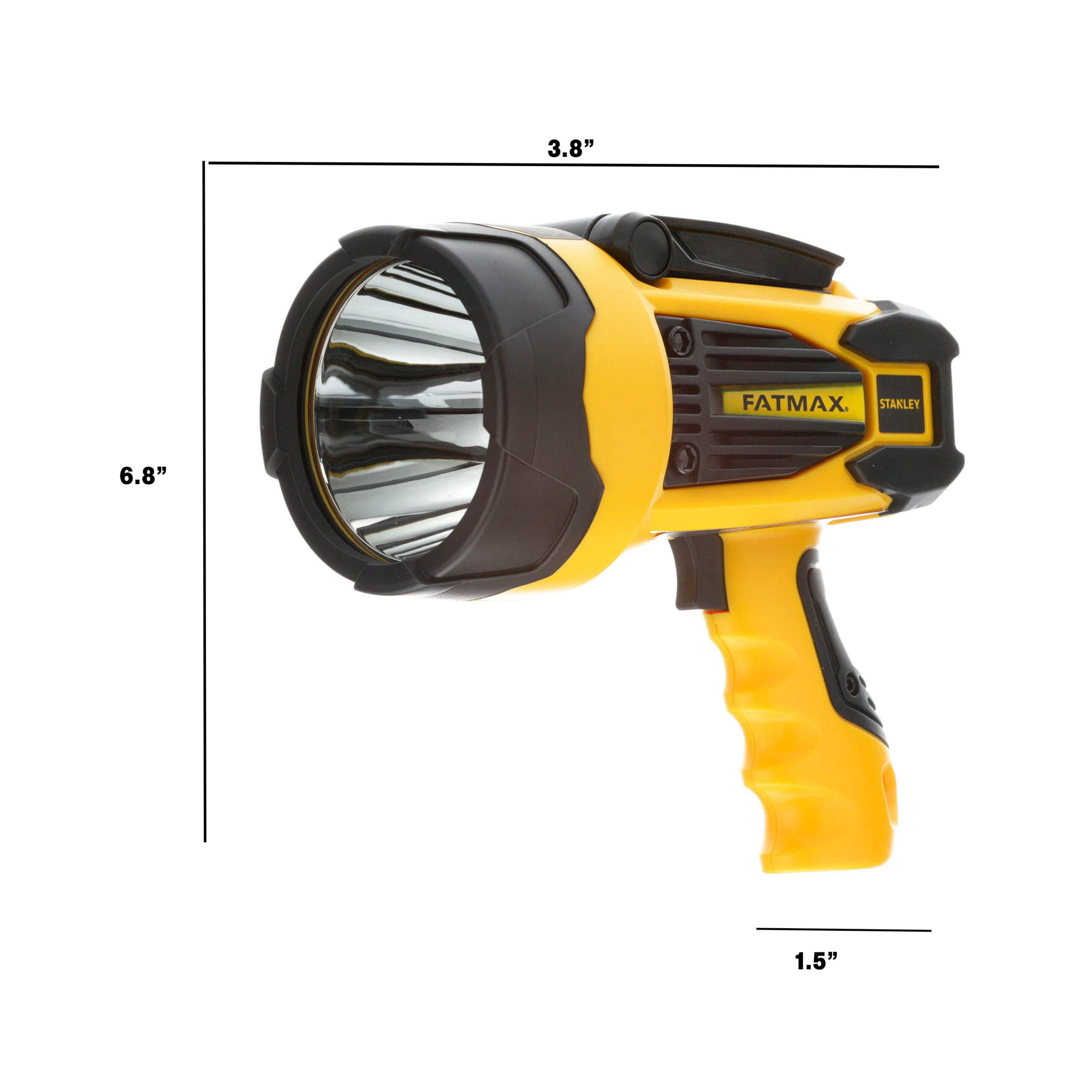 Get serious portable lighting power with the Stanley Fatmax Li-Ion 2200 lumen rechargeable LED spotlight. It provides up to 7 hours of easy handheld lighting on a single charge and has a power in/power out USB port so you can charge up your phone or tablet in an emergency. The locking trigger and collapsible stand allow for easy hands-free use, and the ergonomic pistol grip offers maximum comfort for long-lasting use. ETL certified and backed by a one-year limited warranty.
