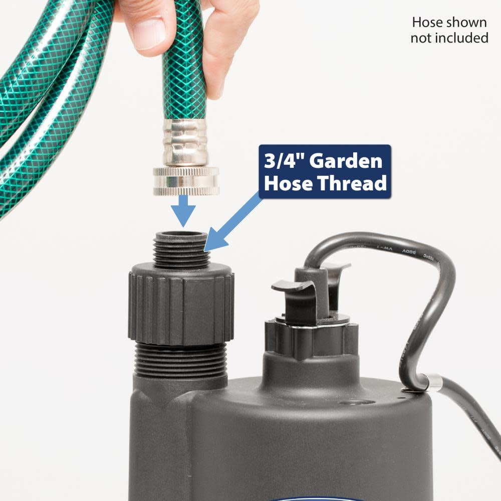 Superior Pump 91250 1/4 HP Thermoplastic Utility Water Pump with Garden Hose Adapter: Automatic water pump will move up to 120 gallons per hour at a height of 25 feet Automatic water pump will move up to 120 gallons per hour at a height of 25 feet Automatic water pump will move up to 120 gallons per hour at a height of 25 feet Continuous duty thermoplastic construction Continuous duty thermoplastic construction Continuous duty thermoplastic construction Thermally protected, split capacitor motor will power pump efficiently and stand up to heavy use season after season Thermally protected, split capacitor motor will power pump efficiently and stand up to heavy use season after season Thermally protected, split capacitor motor will power pump efficiently and stand up to heavy use season after season Large discharge size with strong output for high capacity pumping Large discharge size with strong output for high capacity pumping Large discharge size with strong output for high capacity pumping Simply add an optional float switch to use as a sump pump Suction screen on the base allows you to suck water from within an inch of the ground Simply add an optional float switch to use as a sump pump Suction screen on the base allows you to suck water from within an inch of the ground Simply add an optional float switch to use as a sump pump Suction screen on the base allows you to suck water from within an inch of the ground Pumps up to 30 gallons per minute at ground level Includes common garden hose adapter Installs simply with the use of a three-prong outlet Pumps up to 30 gallons per minute at ground level Includes common garden hose adapter Installs simply with the use of a three-prong outlet Pumps up to 30 gallons per minute at ground level Includes common garden hose adapter Installs simply with the use of a three-prong outlet Horsepower: 1/4 HP Horsepower: 1/4 HP Horsepower: 1/4 HP Amperage: 3.8 AMPs Construction: Thermoplastic Discharge size: 1- inches Discharge type: Top Cord length: 10 feet Solids handling: 1/8-inch Impeller type: Thermoplastic Color: Black Dimensions (L x W x H): 7 x 7 x 13 inches Weight: 9 pounds Manufacturer warranty: 1-year warranty Amperage: 3.8 AMPs Construction: Thermoplastic Discharge size: 1- inches Discharge type: Top Cord length: 10 feet Solids handling: 1/8-inch Impeller type: Thermoplastic Color: Black Dimensions (L x W x H): 7 x 7 x 13 inches Weight: 9 pounds Manufacturer warranty: 1-year warranty Amperage: 3.8 AMPs Construction: Thermoplastic Discharge size: 1- inches Discharge type: Top Cord length: 10 feet Solids handling: 1/8-inch Impeller type: Thermoplastic Color: Black Dimensions (L x W x H): 7 x 7 x 13 inches Weight: 9 pounds Manufacturer warranty: 1-year warranty