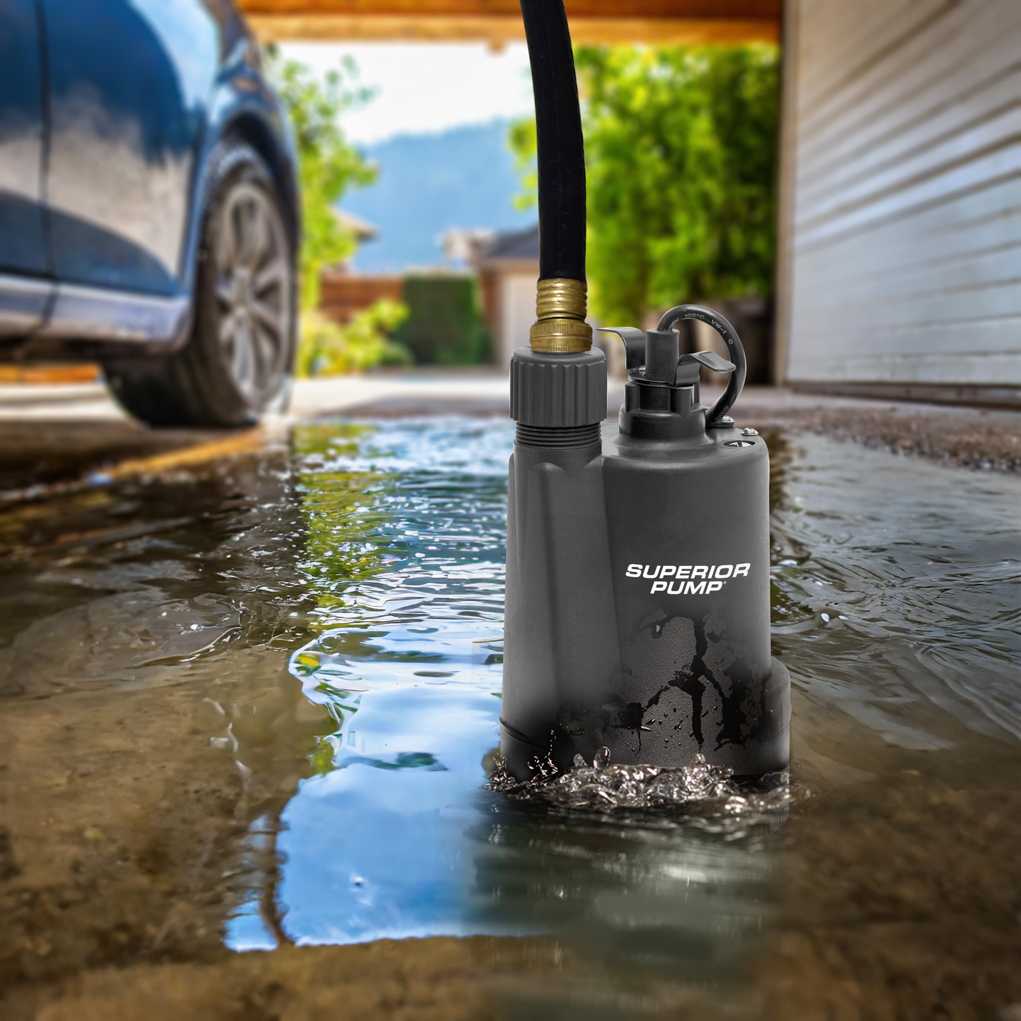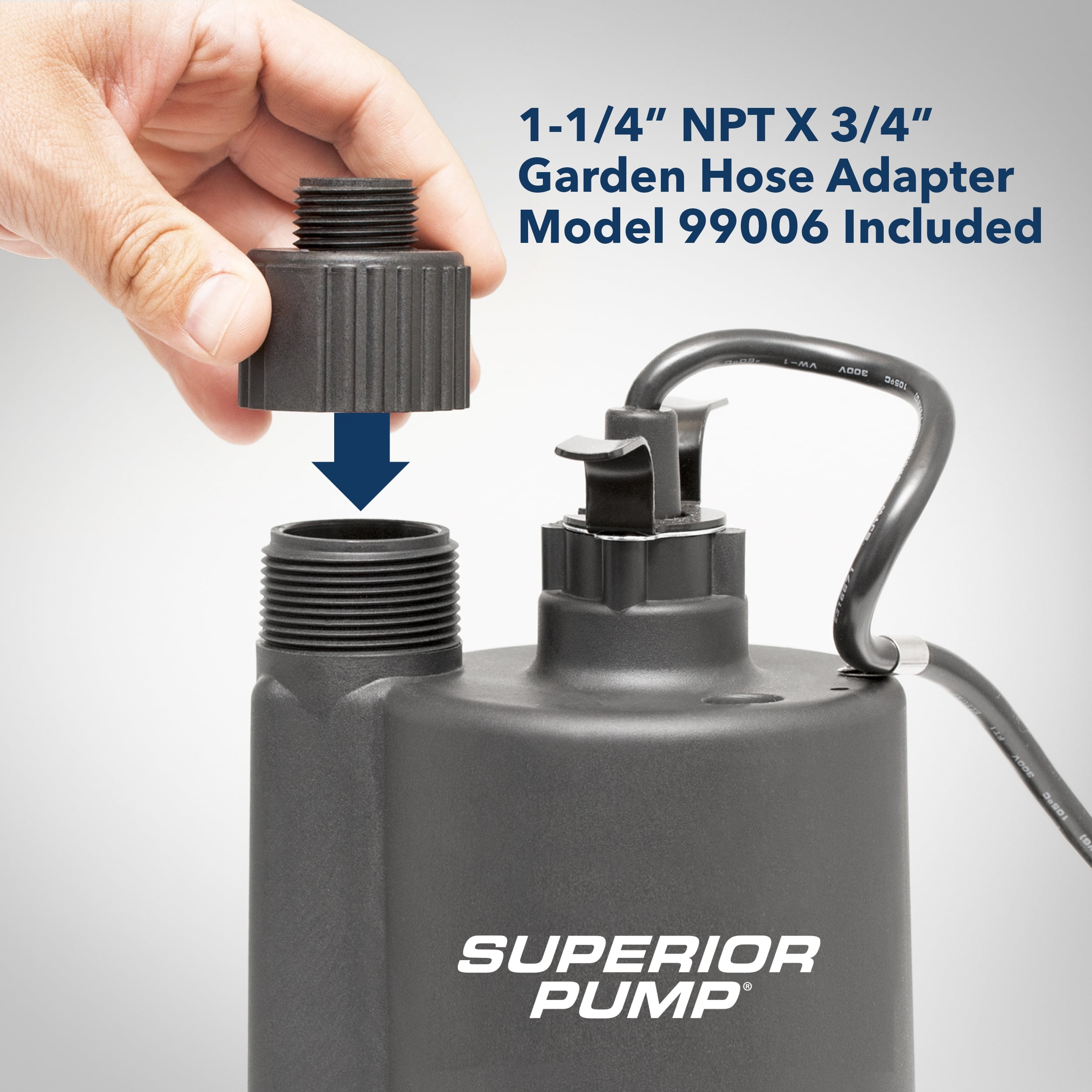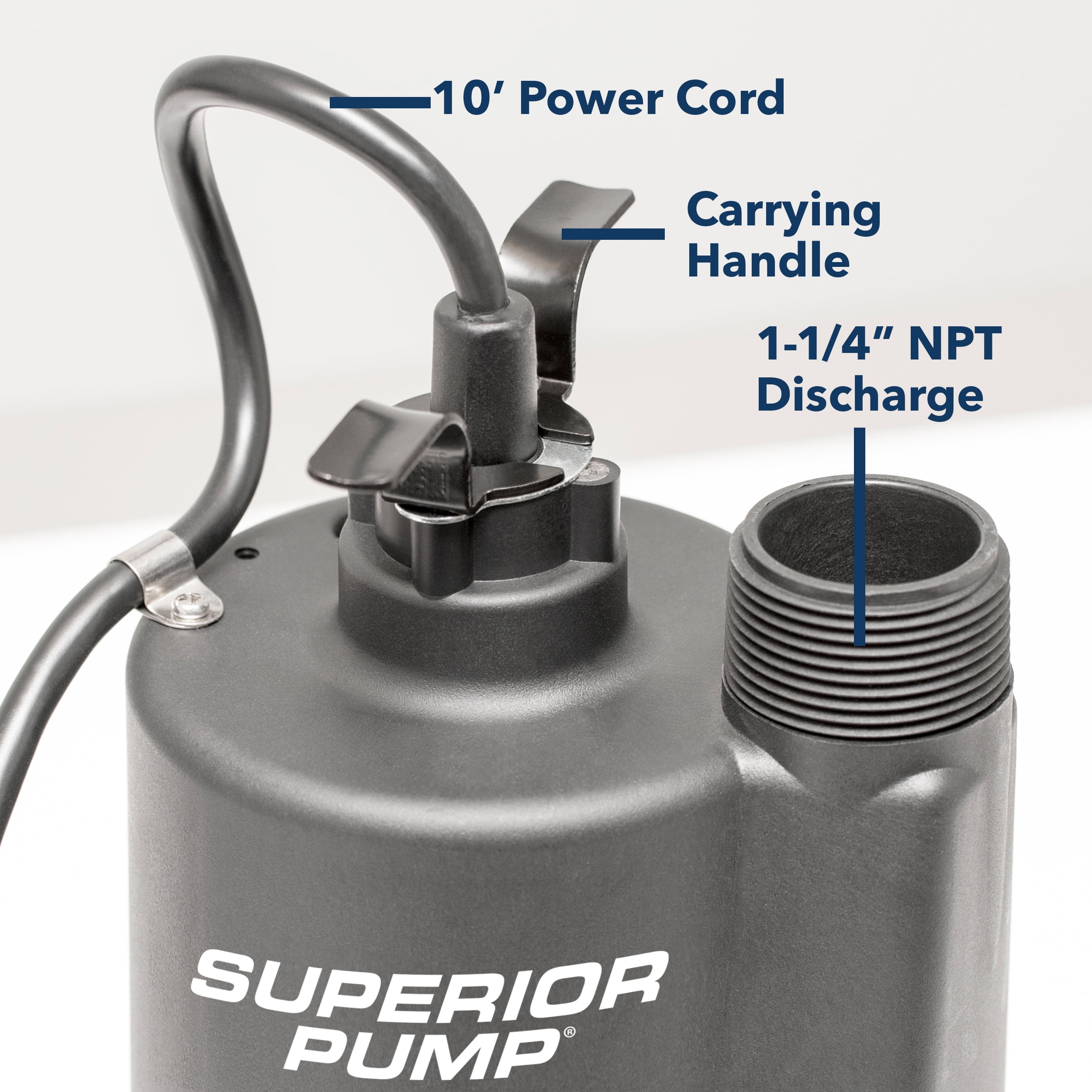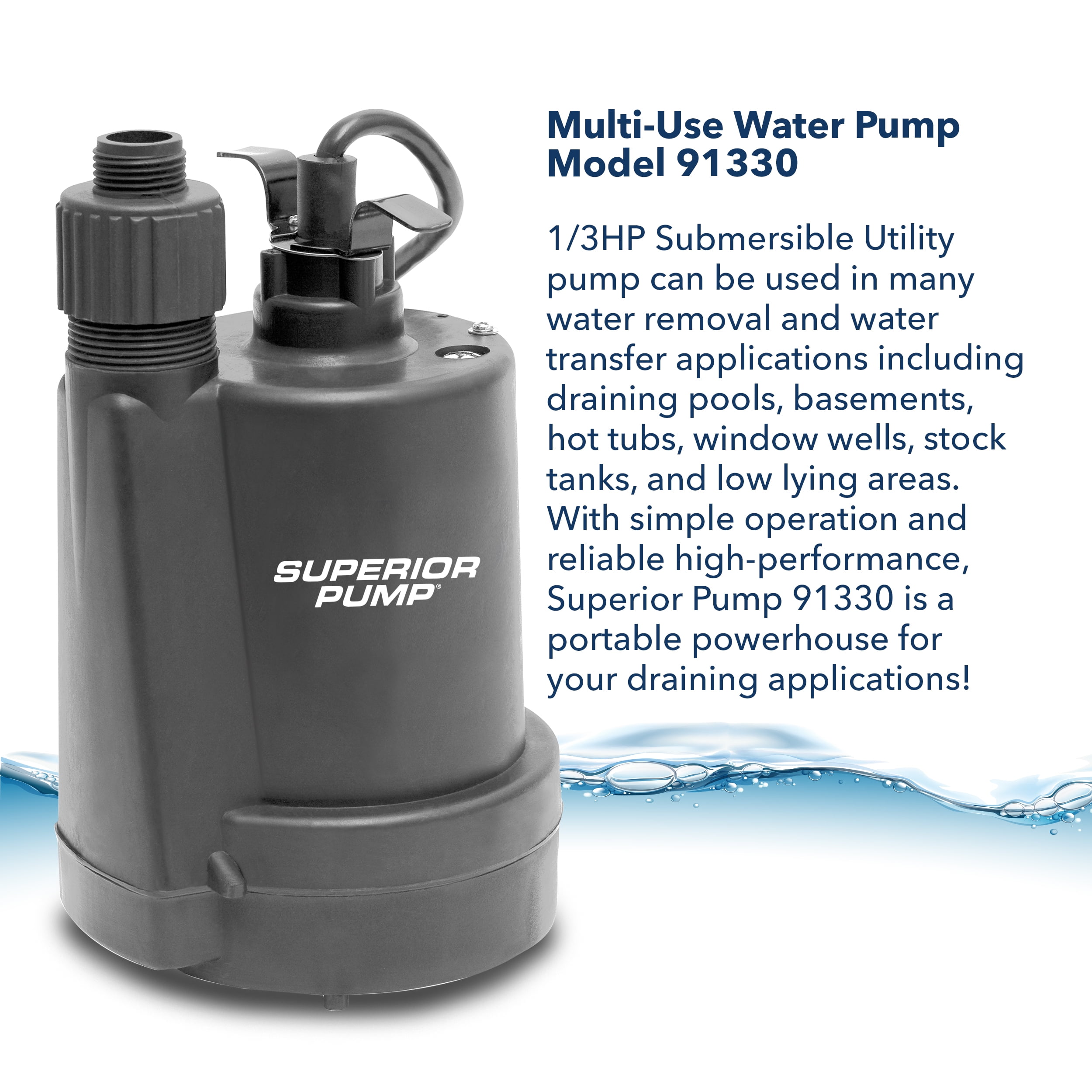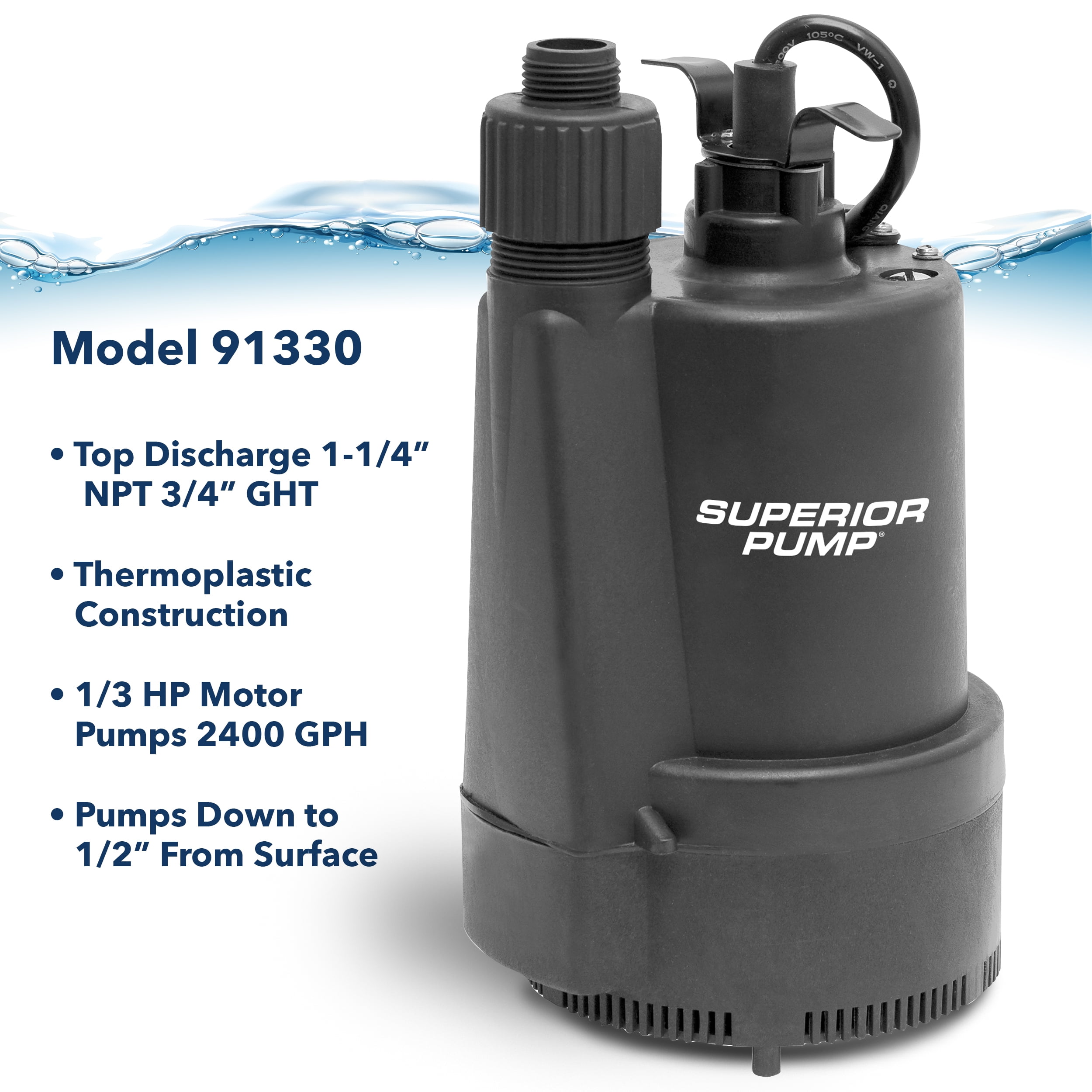 Superior Pump 91330 1/3 HP Thermoplastic Submersible Utility Pump with 10-Foot Cord: Great for pools, hot tubs, basements, multi use water pump Pumps up to 2400 gallons per hour pumps water up to 25 vertical feet Handles up to 1/8 inch solids 1-1/4 inch NPT discharge for high capacity pumping 3/4 inch garden hose adapter included Tough thermoplastic construction 10 foot power supply cord Continuous duty, thermally protected split capacitor motor 1 Year warranty