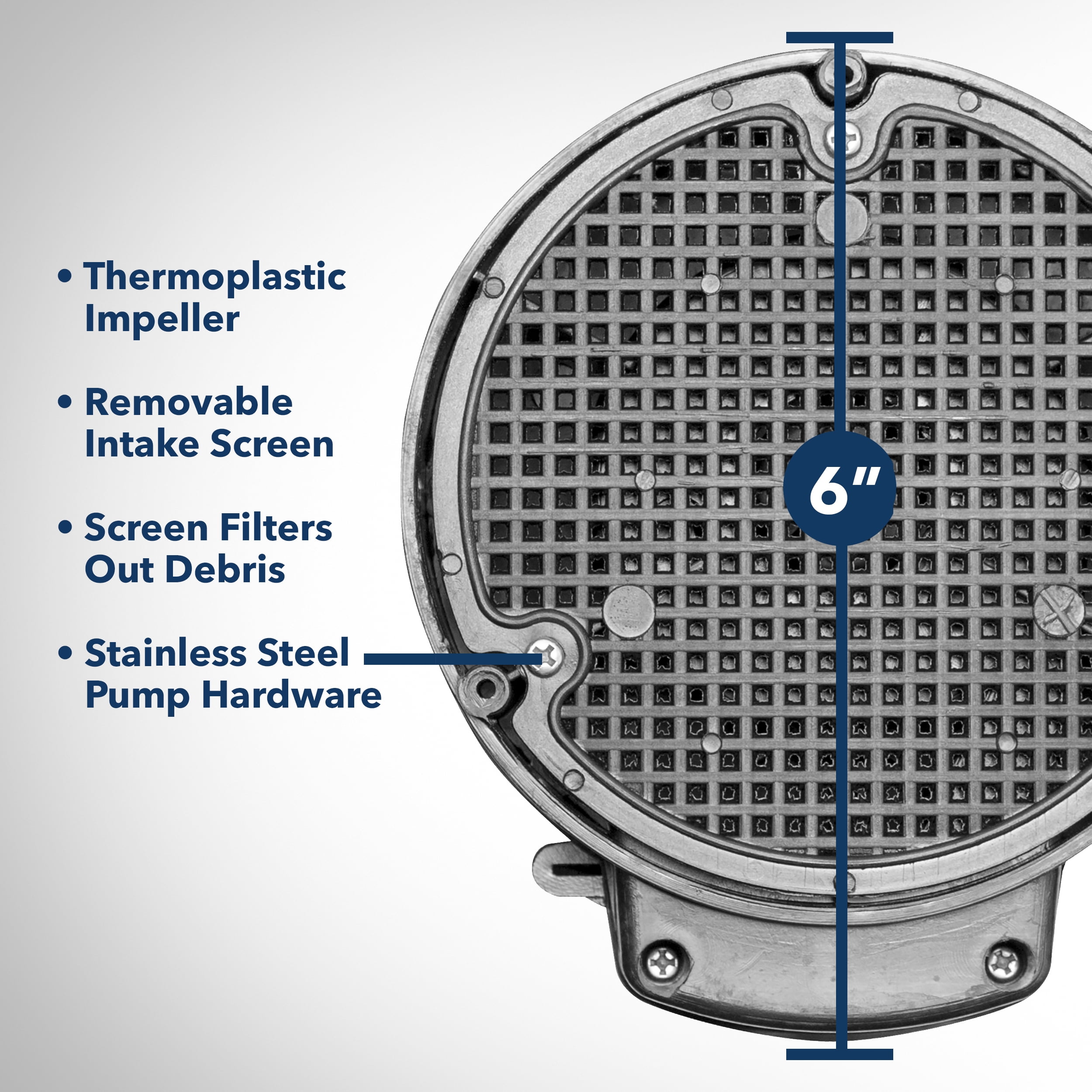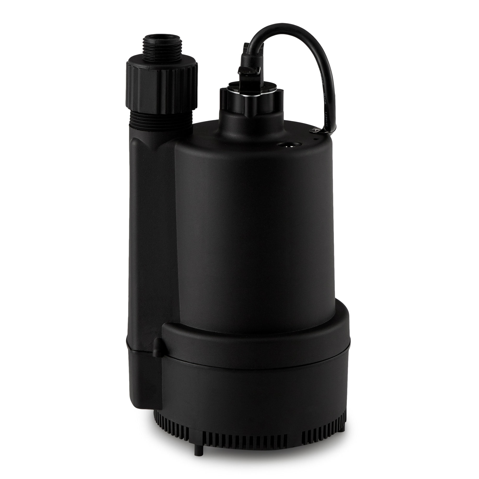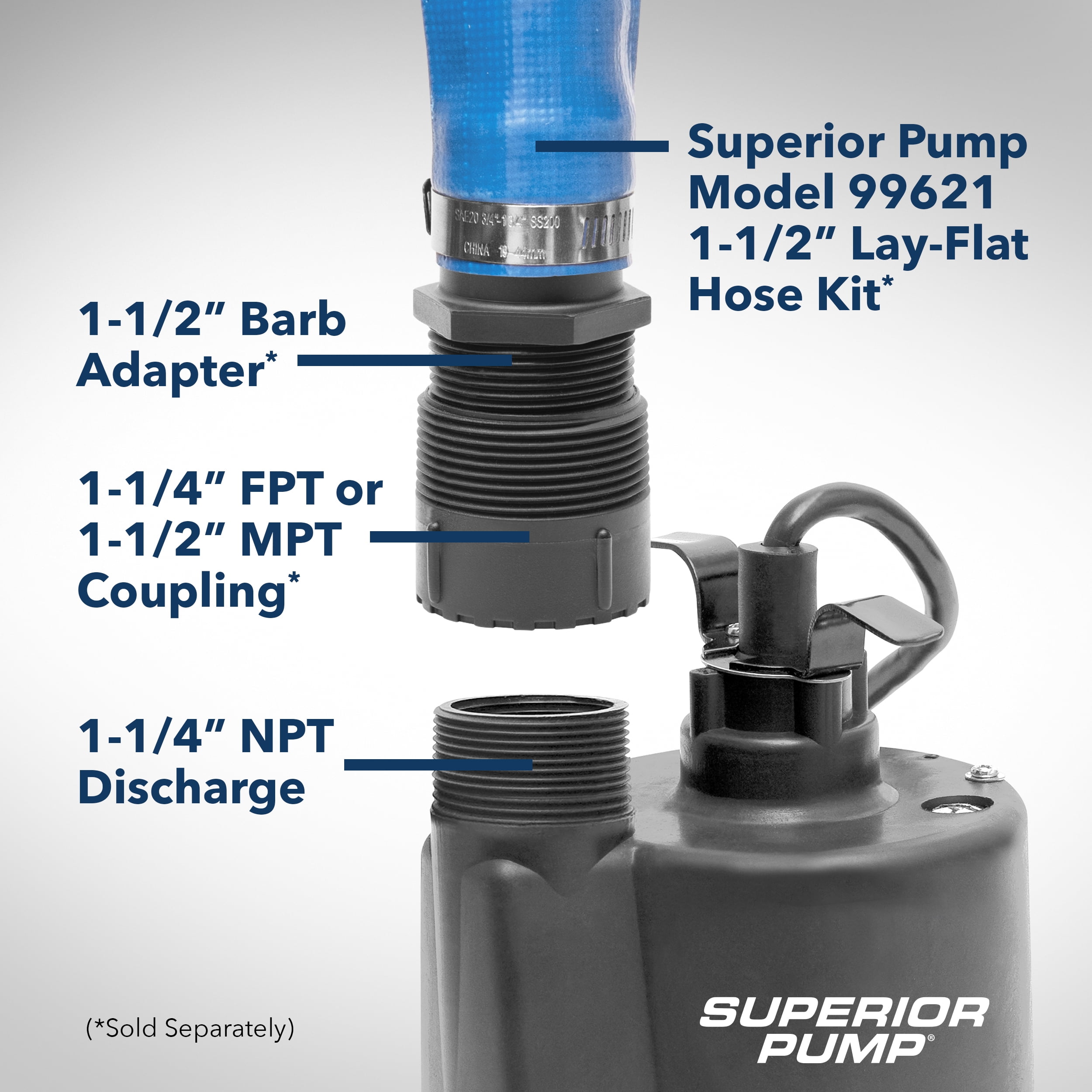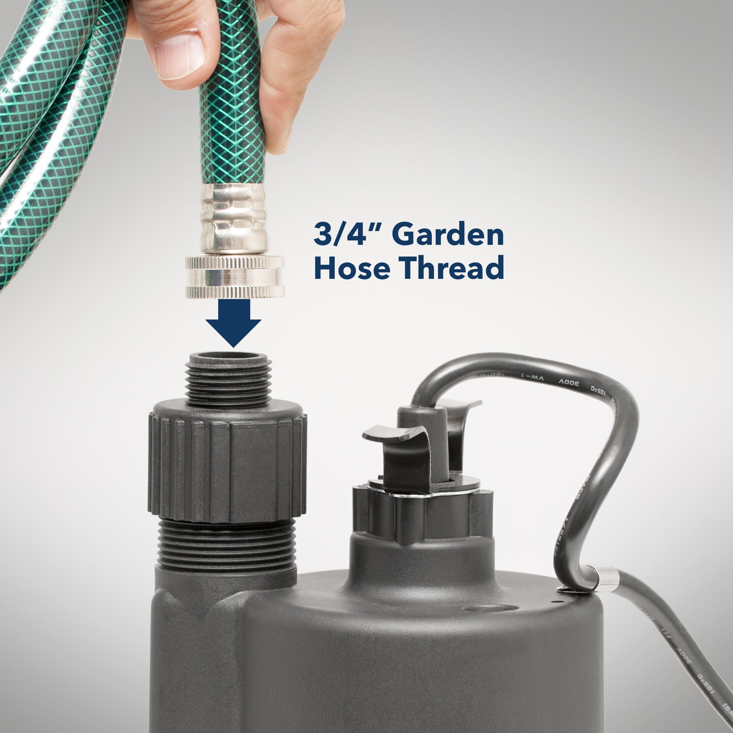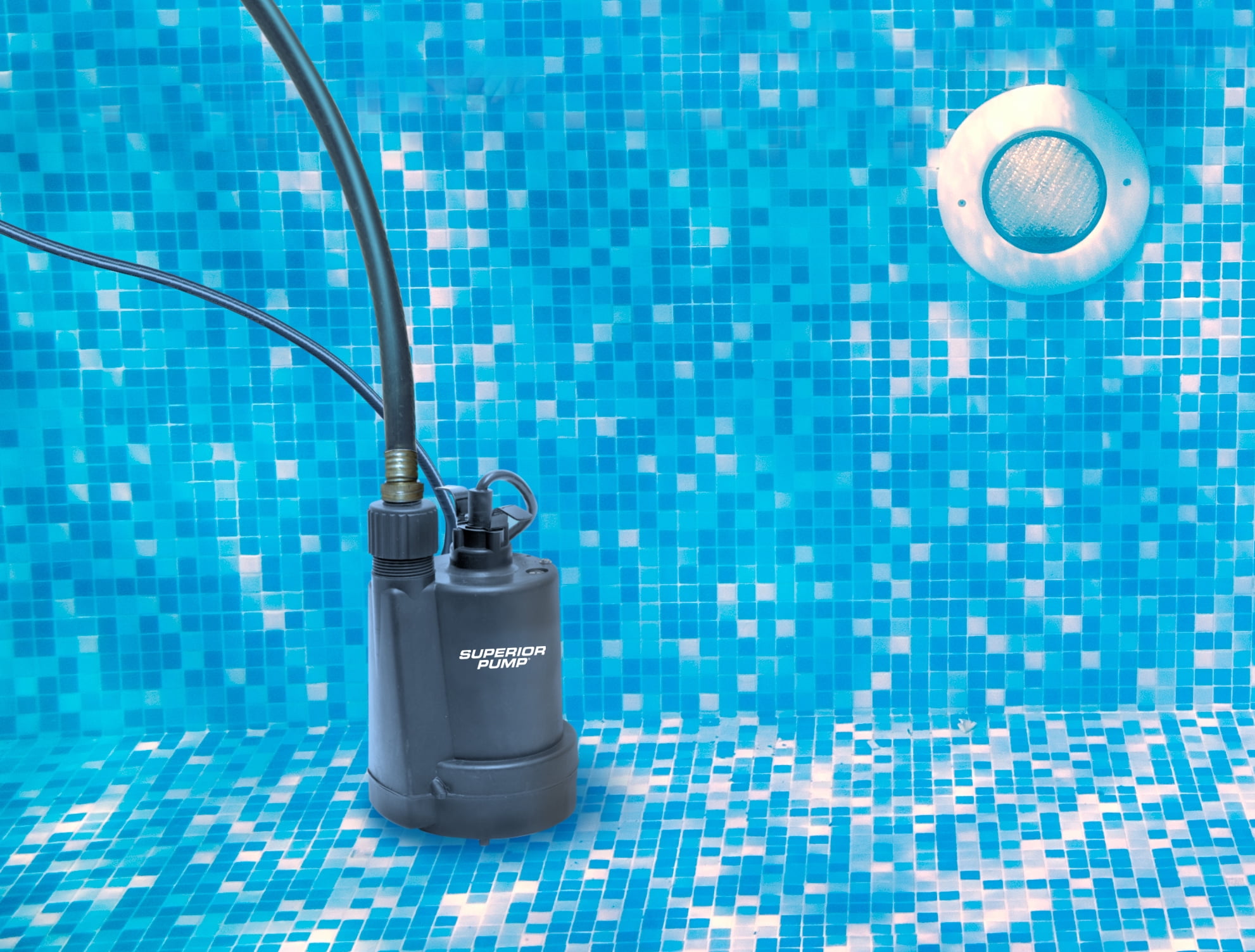 Superior Pump 91330 1/3 HP Thermoplastic Submersible Utility Pump with 10-Foot Cord: Great for pools, hot tubs, basements, multi use water pump Pumps up to 2400 gallons per hour pumps water up to 25 vertical feet Handles up to 1/8 inch solids 1-1/4 inch NPT discharge for high capacity pumping 3/4 inch garden hose adapter included Tough thermoplastic construction 10 foot power supply cord Continuous duty, thermally protected split capacitor motor 1 Year warranty